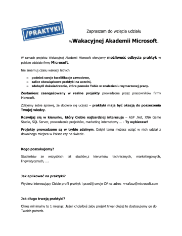 Zapraszam do wzięcia udziału wWakacyjnej Akademii Microsoft. W ramach projektu Wakacyjnej Akademii Microsoft oferujemy polskim oddziale firmy możliwość odbycia praktyk w Microsoft. Nie zmarnuj czasu wakacji letnich • • • podnieś swoje kwalifikacje zawodowe, zalicz obowiązkowe praktyki na uczelni, zdobądź doświadczenie, które pomoże Tobie w znalezieniu wymarzonej pracy. Zostaniesz zaangażowany w realne projekty prowadzone przez pracowników firmy Microsoft. Zdajemy sobie sprawę, że dopiero się uczysz – praktyki mają być okazją do poszerzenia Twojej wiedzy. Rozwijaj się w kierunku, który Ciebie najbardziej interesuje – ASP .Net, XNA Game Studio, SQL Server, prowadzenie projektów, marketing internetowy … - Ty wybierasz! Projekty prowadzone są w trybie zdalnym. Dzięki temu możesz wziąć w nich udział z dowolnego miejsca w Polsce czy na świecie. Kogo poszukujemy? Studentów ze wszystkich lingwistycznych, …. lat studiów,z kierunków technicznych, marketingowych, Jak aplikować na praktyki? Wybierz interesujący Ciebie profil praktyk i prześlij swoje CV na adres [email protected] Jak długo trwają praktyki? Okres minimalny to 1 miesiąc. Jeżeli chciałbyś żeby projekt trwał dłużej to dostosujemy go do Twoich potrzeb. Wybierz swój profil praktyk (przy wysyłaniu CV podaj w tytule e-maila odpowiedni kod – znajdziesz go przy interesującej Ciebie ścieżce rozwoju): 1. Interesuje mnie prowadzenie projektów, zarządzanie grupą ludzi i w tym kierunku chciałbym rozwijać swoje umiejętności. Chcę sprawować,od początku do pomyślnego zakończenia, pieczę nad grupą projektową . Kod [PP1]. 2. Interesują mnie najnowsze technologie, mam o nich ogóle pojęcie, ale chciałbym je lepiej poznać i stać się ekspertem w jednej z nich. Chętnie zaangażuję się w projekt pisania krótkich (3-4 strony) artykułów poświęconych wybranej technologii pod okiem eksperta z Microsoft. Otrzymam do wyboru kilka tematów, które pozwolą mi zgłębić technologię od podstaw do bardziej zaawansowanych zagadnień. Jest to również szansa na obejrzenie swojego nazwiska na największych portalach technologicznych firmy Microsoft. Tematyka: i. ii. iii. iv. v. vi. vii. viii. ix. x. xi. xii. xiii. xiv. xv. xvi. xvii. xviii. xix. Podstawy C#, C++, VB, F# - kod [CE1] Windows Azure – kod [CE2] SQL Azure – kod [CE3] AppFabric – kod [CE4] ASP .Net – kod [CE5] Silverlight – kod [CE6] Internet Explorer – kod [CE7] SharePoint – kod [CE8] Windows Live – kod [CE9] WinForms / WPF – kod [CE10] Microsoft Office – kod [CE11] Windows Phone – kod [CE12] Tworzenie gier (XNA/KODU) – kod [CE13] Bing – kod [CE14] SQL Server – kod [CE15] Business Intelligence – kod [CE16] Praca zespołowa – kod [CE17] Testowanie – kod [CE18] Patterns & practices – kod [CE19] 3. Nie jestem osobą techniczną. Interesują mnie zagadnienia z zakresu marketingu internetowego, analizy rynku itp.Mam ciekawe, niekonwencjonalne pomysły i nie boję się ich realizować. Kod [MM1]. 4. Moja pasja to anglistyka, a jednocześnie interesuję się trochę technologią. przyszłości jako tłumacza. Wiem, że najwięcej doświadczenia zdobywa rzeczywistymi tekstami. Nie chcę żeby moja praca została „odłożona na pochwalić się swoimi tłumaczeniami zamieszczonymi na stronach Microsoft. Kod Widzę siebie w się pracując z półkę”.Miło jest [TT1]. 5. Interesuje mnie programowanie. Technologie ASP .Net i Silverlight nie są mi obce. Chcę nauczyć się więcej o nich i zobaczyć jak wygląda praca zespołowa w projekcie informatycznym. Kod [SD1]. 6. Interesują mnie multimedia. Podstawy obróbki filmów i tworzenie webcastów nie są mi obce. Nie będę się wstydził sygnować swoim nazwiskiem materiałów umieszczonych na stronach Microsoft. Kod [VE1]. 7. Podążam własną ścieżką. Mam swój pomysł na moje praktyki – chcę w ich ramach zrealizować konkretny projekt w czym może pomóc mi Microsoft. Kod [MP1]. (wielka prośba o umieszczenie w mailu opisu swojego pomysłu na praktyki). W razie pytań proszę wysłać maila na adresem [email protected]