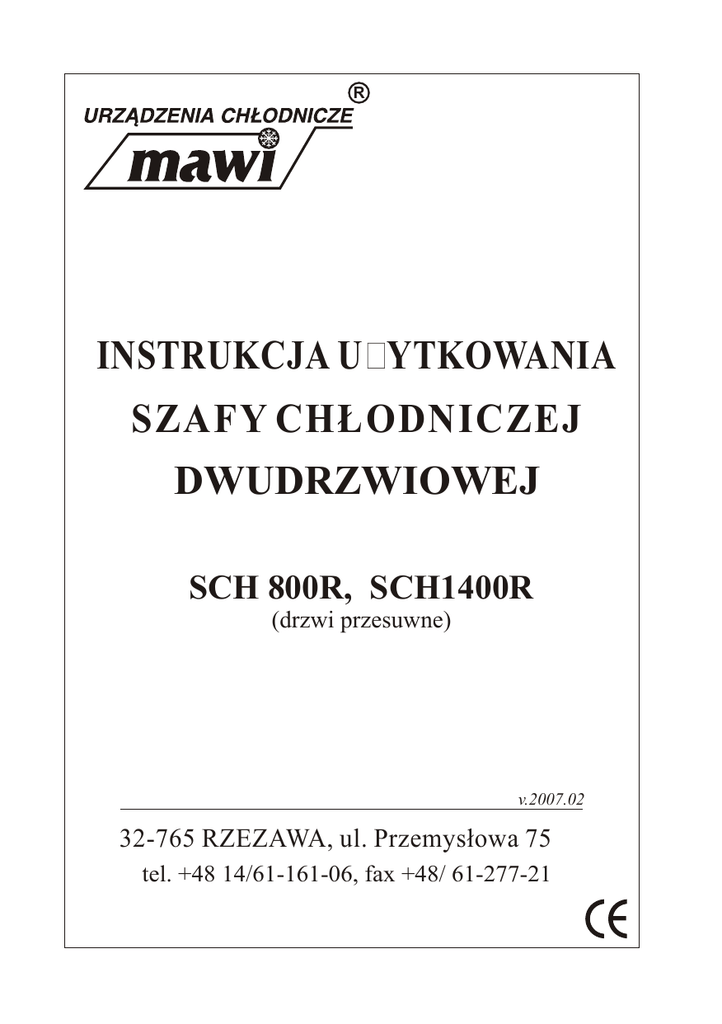 R INSTRUKCJA UŻYTKOWANIA SZAFY CHŁODNICZEJ DWUDRZWIOWEJ SCH 800R, SCH1400R (drzwi przesuwne) v.2007.02 32-765 RZEZAWA, ul. Przemysłowa 75 tel. +48 14/61-161-06, fax +48/ 61-277-21 Kopiowanie, przetwarzanie i rozpowszechnianie tych materiałów w całości lub w części bez zgody Firmy MAWI jest zabronione i stanowi naruszenie praw autorskich. 1. Informacje ogólne. Szafy chłodnicze (rys. 1) są uniwersalnymi urządzeniami do prezentacji lub przechowywania artykułów spożywczych w obniżonej temperaturze. Szafy z przeszklonymi drzwiami typu SCH/R, przeznaczone są do prezentacji i krótkotrwałego przechowywania produktów. Zakres uzyskiwanych temperatur zawiera się w granicach od +1°C do +10°C. Urządzenia posiadają "Certyfikat uprawniający do oznaczenia wyrobu znakiem bezpieczeństwa" wydanym przez Ośrodek Badawczo-Rozwojowy PREDOM-OBR, a tym samym spełniają wymagania normy PN-EN 60335-2-89:2003 – „Elektryczny sprzęt do użytku domowego i podobnego – Bezpieczeństwo użytkowania – część 2-89: Wymagania szczegółowe dotyczące komercyjnych urządzeń chłodniczych z wbudowaną lub wolnostojącą skraplarką lub sprężarką”, przy temperaturze otoczenia 25°C ± 1°C i wilgotności 60% ± 5 %. 2. Opis techniczny. Korpus szafy chłodniczej wykonany jest z blachy stalowej ocynkowanej malowanej proszkowo lub nierdzewnej jest umieszczony na podstawie z kształtownika stalowego. Wnętrze szafy wykonane jest z blachy aluminiowej wzorkowanej lub blachy kwasoodpornej. Warstwę izolacyjną stanowi pianka poliuretanowa. W dolnej części urządzenia znajduje się energooszczędny agregat chłodniczy wraz z automatyką. W urządzeniu realizowany jest jednostopniowy sprężarkowy obieg chłodniczy. Elementem rozprężnym jest rurka kapilarna. Urządzenie pracuje w sieci w systemie ochrony przed porażeniem przez uziemienie. Szafa musi być podłączona do gniazda ze stykiem ochronnym. Uwaga: Producent zastrzega sobie możliwość wprowadzenia zmian konstrukcyjnych i zastosowanych podzespołów, nie wpływających na parametry urządzenia. 3 3. Dane techniczne Typ Długość Szerokość Wysokość Zakres uzyskiwanej temp. Napięcie Sprężarka Czynnik chłodniczy Dobowe zużycie energii Pojemność użytkowa Powierzchnia użytkowa Max obciążenie półki Grzałka Moc zainstalowana Moc świetlówek Chłodnica wentylatorowa SCH 800/R SCH 800/R/N SCH 1400/R 1200 mm 660 mm 1990 mm +1°C do +10°C 230 V ~, 50 Hz SC 12 CL R 507 6 KWh/24 h 850 dcm3 2,4 m2 30 kg 80 W 270 W 740 W 894 W 2x8 W lub 36 W — SHP 9 SCH 1400/R/N 1600 mm 660 mm 1990 mm +1°C do +10°C 230 V~, 50 Hz SC 12 CL R507 6 KWh/24 h 1200 dcm3 3,5 m2 30 kg 80 W 335 W 896 W 1115 W 2x18 W lub 36 W — SHS 12 4. Instalacja elektryczna Instalacja wykonana jest w systemie ochrony przez uziemienie (rys. 2 lub 3). Przed przystąpieniem do eksploatacji urządzenia należy sprawdzić wysokość napięcia zasilania i jego zgodność z napięciem agregatu. Należy zwrócić uwagę na zainstalowanie właściwego zabezpieczenia topikowego 10 A, które winno być zamontowane przed gniazdem wtykowym. Instalację elektryczną musi wykonać uprawniony elektryk. Po przeprowadzeniu napraw lub remontu, połączenia elektryczne wykonać zgodnie ze schematem elektrycznym. 5. Eksploatacja. 1. Ustawienie i zainstalowanie. Szafa chłodnicza powinna pracować w miejscu zapewniającym dobrą cyrkulację powietrza, nie nasłonecznionym z dala od źródeł ciepła, oddalonym od ściany min. 100 mm, oraz powinna być tak ustawiona aby był dostęp do wtyczki przewodu zasilającego. Należy zwrócić szczególną uwagę na to, aby nie zasłonić 4 otworów wlotowego i wylotowego w komorze agregatu (perforacja w dolnej części szafy), służących do obiegu powietrza chłodzącego agregat. Dokładne ustawienie szafy w poziomie zapobiega hałaśliwej pracy urządzenia i zapewnia właściwy odpływ wody podczas rozmrażania. Urządzenie należy podłączyć do gniazda ze stykiem ochronnym (jak w pkt. 4). 2. Uruchomienie i rozpoczęcie eksploatacji. Urządzenie włącza się i wyłącza przyciskiem umieszczonym na panelu termostatu w dolnej części szafy. Oświetlenie załącza się niezależnym wyłącznikiem klawiszowym (dla wersji z chłodzeniem grawitacyjnym) lub przyciskiem na panelu termostatu (dla wersji z chłodzeniem wymuszonym). Po podłączeniu urządzenia do sieci elektrycznej i włączeniu należy pozostawić szafę pustą aż do jej wychłodzenia; w momencie uzyskania odpowiedniej temperatury, regulator temperatury wyłączy agregat. Wówczas dopiero można rozpocząć napełnianie szafy towarem i w pełni z niej korzystać. Szafa jest sprawdzona i wyregulowana fabrycznie i pracuje prawidłowo w temperaturze otoczenia od +10°C do + 25°C ± 1°C i wilgotności powietrza nie przekraczającej 60 ± 5%. Praca agregatu odbywa się w sposób przerywany, tzn. po kilku/kilkunastu minutach pracy agregat zostaje wyłączony na kilka/kilkanaście minut. Długość czasu pracy i czas postoju zależą od takich czynników jak: temperatura otoczenia, ilość i rodzaj produktów znajdujących się we wnętrzu szafy, częstotliwość otwierania drzwi oraz wielkość zaszronienia parownika. W przypadku, gdy urządzenie nie uzyskuje żądanej temperatury (mieszczącej się w zakresie od +1°C do +10°C), istnieje możliwość jej regulacji. Aby zmienić nastawy termostatu należy nacisnąć przycisk . Zapala się wtedy zielona kontrolka na przycisku, a na wyświetlaczu ostatnio zaprogramowana temperatura. 5 · Do ustawienia temperatury służą przyciski . Każde dłuższe przytrzymanie przycisku spowoduje szybkie „przewijanie” ustawienia. · Po ustawieniu żądanej temperatury należy ponownie nacisnąć przycisk Po tej czynności zielona kontrolka na przycisku zgaśnie, a regulator wyjdzie z trybu programowania i zacznie realizację nowego programu. Jeżeli przycisk nie zostanie naciśniety, termostat samoczynnie wyjdzie z programowania po o