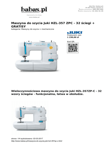 Ada-Mar (babas.pl) 25-303 Kielce, Rynek 11 Telefon komórkowy: 690 993 004 Telefon stacjonarny: 41 341 51 35 Zapraszamy do sklepu www.babas.pl Maszyna do szycia Juki HZL-357 ZPC - 32 ściegi + GRATISY kategoria: Maszyny do szycia > mechaniczne Producent: Juki 1 230,00 zł Kod QR: Wieloczynnościowa maszyna do szycia Juki HZL-357ZP-C - 32 wzory ściegów - funkcjonalna, łatwa w obsłudze. strona: 1/4 wydrukowano: 02-03-2017 http://www.babas.pl/maszyna-do-szycia-juki-hzl-357zp-c.html Nowa, wysokiej klasy mechaniczna maszyna do szycia Juki HZL-357ZP-C, następca docenionego przez użytkowników na całym świecie modelu Juki HZL-35Z. Nowością jest udoskonalony system transportu ząbkowego. Teraz za precyzję transportu tkaniny odpowiada najnowszej generacji mechanizm 7 punktowy - idealnie transportuje zarówno lekkie, cienkie, jak i grubsze materiały. Maszyna posiada funkcje wyłączania transportu (wykorzystywaną podczas pikowania lub haftowania) oraz automatyczne obszywanie dziurki. Za jakość szycia odpowiada sprawny dolny chwytacz rotacyjny, za trwałość maszyny stelaż nośny wykonany z metali lekkich oraz metalowe podzespoły. Kolejną zmianą jest zastosowanie trwałego (120000 godzin działania) oświetlenia typu LED zapewniającego jasne światło, niskie zużycie energii oraz większy komfort pracy. Niewątpliwie maszyna do szycia Juki HZL-357ZP-C zaspokoi krawieckie potrzeby domowe zarówno amatora jak i wymagającego profesjonalisty. Pozostałe cechy maszyny do szycia Juki HZL-357ZP-C Chwytacz rotacyjny. Wysokiej jakości chwytacz rotacyjny gwarantujący łatwe aplikowanie szpulki oraz szycie bez pętelkowania. Wyłączany transport ząbkowy. Prostym ruchem jednej dźwigni można opuścić ząbki do operacji przyszywania guzików czy pikowania . * Stopka do pikowania jest wyposażeniem opcjonalnym. Automatyczny nawlekacz igły. Umożliwia łatw przewlekanie n oczko igły bez niepotrzebnego męczenia wzro szybkie rozpoc szycia. Oświetlenie LED Nowoczesne oświetlenie LED zapewnia jasne światło, niskie energii oraz wi komfort pracy - nie nagrzewa Automatyczne odszywanie dziurki. Po położeniu wybranego guzika na stopce do odszywania dziurek, maszyna automatycznie odszyje odpowiednią dziurkę na podstawie rozmiaru guzika. Wolne ramię i schowek na akcesoria. Schowek na akcesoria można zsunąć, strona: 2/4 wydrukowano: 02-03-2017 http://www.babas.pl/maszyna-do-szycia-juki-hzl-357zp-c.html Regulacja docis stopki. Pozwala na uzy lepszej jakości niezależnie od szytego materi Sztywna walizk Walizka pozwa bezpieczne i komfortowe otrzymując wolne ramię. Dzięki temu wygodnie obszyjemy zamknięte obwody, tj. rękawy, nogawki, itp. ilość ściegów: 32 prędkość szycia: max. 750 ściegów/min regulacja długości ściegu: max 4 mm regulacja szerokości ściegu: max 7 mm wznos stopki: max 9 mm - dwustopniowy system igieł: HAx1 #9-#18 - standardowa igła z półpłaską kolbą chwytacz: rotacyjny wymiary: szer. 410 x wys. 308 x gł. 177 mm waga: 7,1 kg Akcesoria dołączone do maszyny Juki HZL-357ZP-C 1. Stopka ogólnego zastosowania 2. Stopka do suwaków 3. Stopka do obrzucania dziurek strona: 3/4 wydrukowano: 02-03-2017 http://www.babas.pl/maszyna-do-szycia-juki-hzl-357zp-c.html przechowywan maszyny. 4. 5. 6. 7. 8. 9. 10. 11. 12. 13. 14. Stopka do przyszywania guzików Wkrętak (L & S) Podkładka pod szpulkę z nićmi Nożyk Szczoteczka Trzy szpulki Prowadnik do pikowania Trzymak szpulki Dodatkowy trzepień Pakiet igieł Walizka TABELA ŚCIEGÓW Gwarancja Wszystkie urz?dzenia pochodz? wy??cznie z polskiej dystrybucji. Obj?te s? 24miesi?czn? gwarancj? door-to-door (od drzwi do drzwi). Us?ugi pogwarancyjne tak?e realizowane s? w tym systemie. Jeste?my oficjalnym, certyfikowanym sprzedawc? maszyn marki Juki. 357 zpc, zpc, hzl357zpc, hzl-357 zpc, hzl-357-zpc, hzl-357zp-c, zp-c, juki strona: 4/4 wydrukowano: 02-03-2017 http://www.babas.pl/maszyna-do-szycia-juki-hzl-357zp-c.html