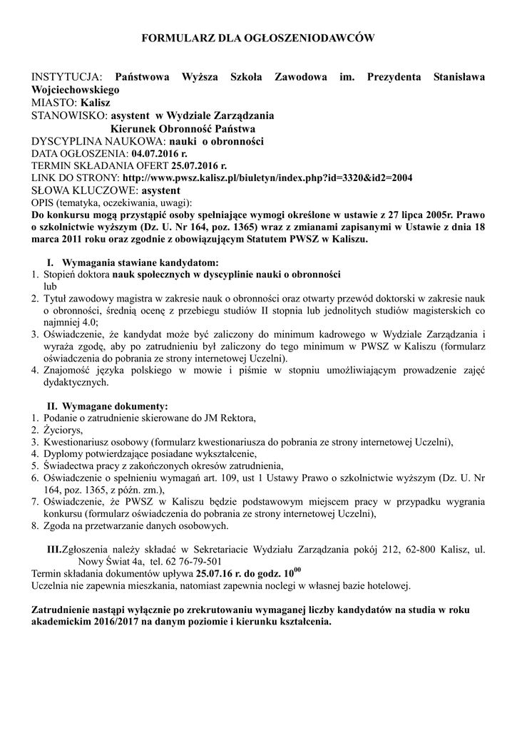 FORMULARZ DLA OGŁOSZENIODAWCÓW INSTYTUCJA: Państwowa Wyższa Szkoła Zawodowa Wojciechowskiego MIASTO: Kalisz STANOWISKO: asystent w Wydziale Zarządzania Kierunek Obronność Państwa DYSCYPLINA NAUKOWA: nauki o obronności im. Prezydenta Stanisława DATA OGŁOSZENIA: 04.07.2016 r. TERMIN SKŁADANIA OFERT 25.07.2016 r. LINK DO STRONY: http://www.pwsz.kalisz.pl/biuletyn/index.php?id=3320&id2=2004 SŁOWA KLUCZOWE: asystent OPIS (tematyka, oczekiwania, uwagi): Do konkursu mogą przystąpić osoby spełniające wymogi określone w ustawie z 27 lipca 2005r. Prawo o szkolnictwie wyższym (Dz. U. Nr 164, poz. 1365) wraz z zmianami zapisanymi w Ustawie z dnia 18 marca 2011 roku oraz zgodnie z obowiązującym Statutem PWSZ w Kaliszu. 1. 2. 3. 4. I. Wymagania stawiane kandydatom: Stopień doktora nauk społecznych w dyscyplinie nauki o obronności lub Tytuł zawodowy magistra w zakresie nauk o obronności oraz otwarty przewód doktorski w zakresie nauk o obronności, średnią ocenę z przebiegu studiów II stopnia lub jednolitych studiów magisterskich co najmniej 4.0; Oświadczenie, że kandydat może być zaliczony do minimum kadrowego w Wydziale Zarządzania i wyraża zgodę, aby po zatrudnieniu był zaliczony do tego minimum w PWSZ w Kaliszu (formularz oświadczenia do pobrania ze strony internetowej Uczelni). Znajomość języka polskiego w mowie i piśmie w stopniu umożliwiającym prowadzenie zajęć dydaktycznych. II. Wymagane dokumenty: Podanie o zatrudnienie skierowane do JM Rektora, Życiorys, Kwestionariusz osobowy (formularz kwestionariusza do pobrania ze strony internetowej Uczelni), Dyplomy potwierdzające posiadane wykształcenie, Świadectwa pracy z zakończonych okresów zatrudnienia, Oświadczenie o spełnieniu wymagań art. 109, ust 1 Ustawy Prawo o szkolnictwie wyższym (Dz. U. Nr 164, poz. 1365, z późn. zm.), 7. Oświadczenie, że PWSZ w Kaliszu będzie podstawowym miejscem pracy w przypadku wygrania konkursu (formularz oświadczenia do pobrania ze strony internetowej Uczelni), 8. Zgoda na przetwarzanie danych osobowych. 1. 2. 3. 4. 5. 6. III. Zgłoszenia należy składać w Sekretariacie Wydziału Zarządzania pokój 212, 62-800 Kalisz, ul. Nowy Świat 4a, tel. 62 76-79-501 Termin składania dokumentów upływa 25.07.16 r. do godz. 1000 Uczelnia nie zapewnia mieszkania, natomiast zapewnia noclegi w własnej bazie hotelowej. Zatrudnienie nastąpi wyłącznie po zrekrutowaniu wymaganej liczby kandydatów na studia w roku akademickim 2016/2017 na danym poziomie i kierunku kształcenia.
