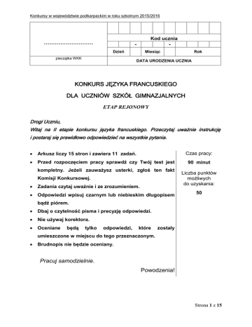 Konkursy w województwie podkarpackim w roku szkolnym 2015/2016 Kod ucznia ……………………… - - Dzień pieczątka WKK Miesiąc Rok DATA URODZENIA UCZNIA KONKURS JĘZYKA FRANCUSKIEGO DLA UCZNIÓW SZKÓŁ GIMNAZJALNYCH ETAP REJONOWY Drogi Uczniu, Witaj na II etapie konkursu języka francuskiego. Przeczytaj uważnie instrukcję i postaraj się prawidłowo odpowiedzieć na wszystkie pytania. Arkusz liczy 15 stron i zawiera 11 zadań. Przed rozpoczęciem pracy sprawdź czy Twój test jest Czas pracy: kompletny. Jeżeli zauważysz usterki, zgłoś ten fakt Komisji Konkursowej. Zadania czytaj uważnie i ze zrozumieniem. Odpowiedzi wpisuj czarnym lub niebieskim długopisem 90 minut Liczba punktów możliwych do uzyskania: 50 bądź piórem. Dbaj o czytelność pisma i precyzję odpowiedzi. Nie używaj korektora. Oceniane będą tylko odpowiedzi, które zostały umieszczone w miejscu do tego przeznaczonym. Brudnopis nie będzie oceniany. Pracuj samodzielnie. Powodzenia! Strona 1 z 15 Konkursy w województwie podkarpackim w roku szkolnym 2015/2016 Zadanie 1 (0-5 p.) Przeanalizuj poniższą tabelę i zaznacz właściwą odpowiedź na niżej podane pytanie. Za każdą poprawną odpowiedź otrzymasz 1 punkt. Date Férié Caractéristiques et activités Jour de l'An Premier janvier Oui On décore la maison avec du gui, symbole du bonheur. On s'embrasse à minuit en se souhaitant "bonne année". On réveillonne toute la nuit. Epiphanie (Fête des Rois) Premier dimanche après le Jour de l'An. Oui On partage une galette dans laquelle on a caché une fève. Celui ou celle qui trouve la fève devient le "Roi" ou la "Reine" et on lui place une couronne sur la tête. Saint Valentin 14 février Non C'est la fête des amoureux : on offre des fleurs à celui ou celle qu'on aime. 1 Avril Premier avril Non Jour des plaisanteries, des blagues, des fausses nouvelles dans les médias. Les enfants s'accrochent des petits poissons de papier dans le dos. Pâques du 22 au 25 avril Dimanche et lundi Oui C'est l'occasion de grandes messes. Les enfants cherchent des oeufs en chocolat dans les maisons et jardins que les cloches de Rome ont fait tomber du ciel. Ce sont en fait les parents qui les ont cachés. Fête des Mères Dernier dimanche de mai. Oui Les enfants offrent des cadeaux à leur mère. Fête de la Musique 21 juin Non Des concerts sont organisés partout dans le pays. Chacun peut organiser son propre concert dans la rue, sur les places. C'est une grande fête populaire qui a lieu dans plus en plus de pays. Fête Nationale 14 juillet Oui Des défilés militaires ont lieu, en particulier sur les Champs-Élysées à Paris. On tire des feux d'artifice partout dans le pays. Des bals populaires sont organisés dans toutes les villes. Toussaint Premier novembre Oui C'est une fête en souvenir des morts. Le 2 novembre, on se rend dans les cimetières pour fleurir les tombes avec des chrysanthèmes. Noël le 25 décembre Oui C'est une fête familiale. Un sapin de Noël et une crèche sont installés dans la maison. Les enfants reçoivent des cadeaux du "Père Noël". Des messes sont célébrées le 24 à minuit, après le repas familial. er Source : d’après http://www.french.hku.hk/starters/fetes.htm Strona 2 z 15 Konkursy w województwie podkarpackim w roku szkolnym 2015/2016 1.1 Quel jour les Français travaillent-ils ? a) le six janvier b) le vingt et un juin c) le vingt-cinq décembre 1.2 A quelle occasion partagent-ils le gâteau contenant une surprise ? a) à l’Epiphanie b) à Pâques c) à Noël 1.3 Quand font-ils la fête jusqu’au matin ? a) le quatorze juillet b) le quatorze février c) le trente et un décembre 1.4 Quel jour propagent-ils des informations non vraies ? a) le premier janvier b) le premier avril c) le premier novembre 1.5 Comment commémorent-ils le premier novembre ? a) ils déposent des fleurs sur les tombes b) ils déposent des fleurs et des lampions sur les tombes c) ils célèbrent la messe et vont au cimetière Strona 3 z 15 Konkursy w województwie podkarpackim w roku szkolnym 2015/2016 Zadanie 2 (0-5 p.) Przeczytaj uważnie tekst i skreśl na schemacie produkt(y), którego/których Francuzi nie spożywają w czasie poszczególnych posiłków. Za każdy poprawnie skreślony produkt otrzymasz 1 punkt. Le petit-déjeuner Au petit-déjeuner, en général, on prend du pain ou des biscottes. Sur le pain, on met du beurre et de la confiture. On appelle ça des tartines. On boit aussi du café, du café au lait, du thé ou du chocolat chaud. On peut aussi prendre un bol de lait avec des céréales. Bien sûr, ça dépend des familles, mais on peut aussi boire un jus de fruits ou manger un yaourt. Le dimanche matin, les Français vont à la boulangerie pour acheter des croissants, des pains au chocolat ou de la brioche en plus de la baguette. Petit déjeuner français Strona 4 z 15 Konkursy w województwie podkarpackim w roku szkolnym 2015/2016 Le déjeuner Au déjeuner, on mange plus qu’au petit déjeuner. Il y a souvent une entrée, un plat et un dessert. En entrée, on peut prendre par exemple un peu de salade, des carottes râpées ou de la charcuterie (du jambon, du saucisson, du pâté). Dans le plat principal, il y a souvent de la viande (du poulet, du bœuf ou du porc) On mange la viande avec des frites, des pâtes, des haricots verts ou du riz. Quand on habite près de la mer, on mange plus de poisson. En dessert, on prend un fruit ou un yaourt. Avant le dessert, souvent on mange un peu de fromage avec du pain. On boit surtout de l’eau (de l’eau du robinet ou de l’eau minérale). On termine souvent le repas par un café. Le déjeuner Strona 5 z 15 Konkursy w województwie podkarpackim w roku szkolnym 2015/2016 Le dîner Le soir, le repas s’appelle « le dîner » ou « le souper ». La différence avec le repas de midi n’est pas très grande. On mange un peu moins et quelquefois on prend un peu de vin ou de la bière à la place de l’eau. Et à la place du