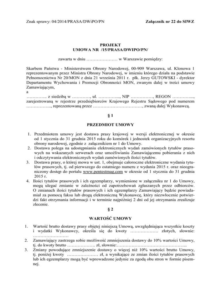 Załącznik nr 22 do SIWZ Znak sprawy: 04/2014/PRASA/DWiPO/PN PROJEKT UMOWA NR /15/PRASA/DWIPO/PN/ zawarta w dniu ………………… w Warszawie pomiędzy: Skarbem Państwa - Ministerstwem Obrony Narodowej, 00-909 Warszawa, ul. Klonowa 1 reprezentowanym przez Ministra Obrony Narodowej, w imieniu którego działa na podstawie Pełnomocnictwa Nr 20/MON z dnia 21 września 2011 r. płk. Jerzy GUTOWSKI - dyrektor Departamentu Wychowania i Promocji Obronności MON, zwanym dalej w treści umowy Zamawiającym, a ………….. z siedzibą w …………, ul. …………..., NIP ……………, REGON …………..., zarejestrowaną w rejestrze przedsiębiorców Krajowego Rejestru Sądowego pod numerem …………….., reprezentowaną przez ……………………………, zwaną dalej Wykonawcą. §1 PRZEDMIOT UMOWY 1. Przedmiotem umowy jest dostawa prasy krajowej w wersji elektronicznej w okresie od 1 stycznia do 31 grudnia 2015 roku do komórek i jednostek organizacyjnych resortu obrony narodowej, zgodnie z załącznikiem nr 1 do Umowy. 2. Dostawa polega na udostępnianiu elektronicznych wydań zamówionych tytułów prasowych na wskazanych serwerach oraz umożliwianiu Zamawiającemu pobierania z nich i odczytywania elektronicznych wydań zamówionych ilości tytułów. 3. Dostawa prasy, o której mowa w ust. 1, obejmuje całoroczne elektroniczne wydania tytułów prasowych, tj. od pierwszego do ostatniego numeru z wydania 2015 r. oraz nieograniczony dostęp do portalu www.pentestmag.com w okresie od 1 stycznia do 31 grudnia 2015 r. 4. Ilości tytułów prasowych i ich egzemplarzy, wymienione w załączniku nr 1 do Umowy, mogą ulegać zmianie w zależności od zapotrzebowań zgłaszanych przez odbiorców. O zmianach ilości tytułów prasowych i ich egzemplarzy Zamawiający będzie powiadamiał za pomocą faksu lub drogą elektroniczną Wykonawcę, który niezwłocznie potwierdzi fakt otrzymania informacji i w terminie najpóźniej 2 dni od jej otrzymania zrealizuje zlecenie. §2 WARTOŚĆ UMOWY 1. 2. 3. Wartość brutto dostawy prasy objętej niniejszą Umową, uwzględniająca wszystkie koszty i wydatki Wykonawcy, określa się do kwoty ………………. złotych, słownie: …………………… Zamawiający zastrzega sobie możliwość zmniejszenia dostawy do 10% wartości Umowy, tj. do kwoty brutto ………………. zł, słownie:………………………………………... Zmiany powodujące zmniejszenie dostawy o więcej niż 10% wartości brutto Umowy, tj. poniżej kwoty ………………… zł, a wynikające ze zmian ilości tytułów prasowych lub ich egzemplarzy mogą być wprowadzone jedynie za zgodą obu stron w formie pisemnej. 4. Tytuły prasowe, o których mowa w § 1 ust. 1 - 3, będą opłacane po kosztach brutto określonych w kosztorysie, stanowiącym część oferty złożonej w postępowaniu poprzedzającym zawarcie Umowy. Powyższy kosztorys stanowi jednocześnie załącznik nr 2 do Umowy. §3 WARUNKI REALIZACJI ZAMÓWIENIA 1. Dostawa będzie realizowana zgodnie z załącznikiem nr 1 do Umowy, zawierającym nazwy odbiorców, tytuły prasowe i ilości egzemplarzy dla poszczególnych odbiorców. 2. Odbiorca może korzystać z zamówionego tytułu prasowego na dwóch urządzeniach. 3. Tytuły prasowe, będące przedmiotem Umowy, z zastrzeżeniem ust. 4, będą udostępniane zgodnie z częstotliwością ich wydawania, nie później niż do godziny 8:00 w dniu wydania danego tytułu. W przypadku gdy wydawca nie udostępni na czas plików z elektronicznym wydaniem danego tytułu, opóźnione wydanie Wykonawca udostępni Zamawiającemu najpóźniej w ciągu trzech godzin od jego otrzymania. 4. Dostęp do portalu www.pentestmag.com będzie możliwy w sposób nieograniczony. 5. Zamawiający zastrzega sobie możliwość zmiany odbiorcy zamówionych tytułów prasowych. O powyższych zmianach Zamawiający powiadomi Wykonawcę za pomocą faksu lub drogą elektroniczną. Wykonawca niezwłocznie potwierdzi fakt otrzymania informacji pod nr faksu 22 687 25 10 lub drogą elektroniczną pod adresem, z którego informacja została wysłana, i zrealizuje zlecenie w ciągu 24 godzin. 6. Zamawiający zgłosi Wykonawcy drogą elektroniczną lub za pomocą faksu informację o braku dostępu odbiorcy do kolejnego elektronicznego wydania zamówionego tytułu prasowego, bądź do portalu www.pentestmag.com - Wykonawca niezwłocznie potwierdzi fakt otrzymania informacji i umożliwi dostęp do danego wydania w wypadku: prasy codziennej - najpóźniej w ciągu 2 godzin od otrzymania zgłoszenia, w wypadku czasopism i dostępu do portalu – najpóźniej do godz. 8.00 następnego dnia. O zrealizowaniu zlecenia Wykonawca powiadomi Zamawiającego pod nr faksu 22 687 25 10 lub drogą elektroniczną pod adresem, z którego informacja została wysłana. 7. Zamówione elektroniczne tytuły prasowe będą udostępnione w formie i zawartości, w jakiej zostały opublikowane przez wydawcę. 8. Wykonawca zobowiązuje się dostarczać elektroniczne wydania zamówionych tytułów prasowych we względnie najwyższej jakości graficznej. 9. Wykonawca zobowiązuje się informować Zamawiającego drogą elektroniczną lub za pomocą faksu o wprowadzanych uaktualnieniach i nowościach oprogramowania służącego do pobierania i odczytywania elektronicznych wydań zamówionych tytułów prasowych oraz zapewni Zamawiającemu prawo bezpłatnego ich otrzymywania. 10. Pobieranie, rozumiane jako pobranie całej objętości elektronicznego wydania zamówionego tytułu prasowego, będzie się odbywać poprzez istniejące łącze internetowe z nieograniczoną liczbą wejść. 11. Program (aplikacja) do korzystania z zamówionych tytułów prasowych musi: 1) umożliwiać pobieranie aktualnych wydań; 2) umożliwiać przeglądanie stron przy pomocy przycisków klawiatury służących do przewijania stron, kółka myszki, strzałek kierunkowych; 3) umożliwiać powrót do ostatnio oglądanej strony wydania