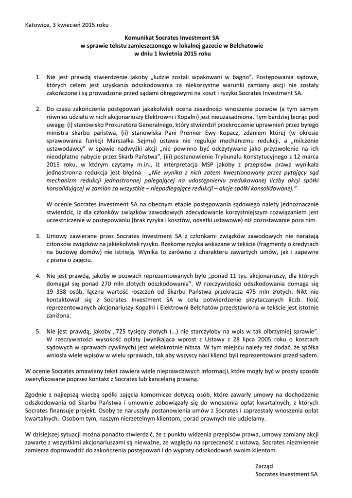 Katowice, 3 kwiecień 2015 roku Komunikat Socrates Investment SA w sprawie tekstu zamieszczonego w lokalnej gazecie w Bełchatowie w dniu 1 kwietnia 2015 roku 1. Nie jest prawdą stwierdzenie jakoby „ludzie zostali wpakowani w bagno”. Postępowania sądowe, których celem jest uzyskania odszkodowania za niekorzystne warunki zamiany akcji nie zostały zakończone i są prowadzone przed sądami okręgowymi na koszt i ryzyko Socrates Investment SA. 2. Do czasu zakończenia postępowań jakakolwiek ocena zasadności wnoszenia pozwów (a tym samym również udziału w nich akcjonariuszy Elektrowni i Kopalni) jest nieuzasadniona. Tym bardziej biorąc pod uwagę: (i) stanowisko Prokuratora Generalnego, który stwierdził przekroczenie uprawnień przez byłego ministra skarbu państwa, (ii) stanowiska Pani Premier Ewy Kopacz, zdaniem której (w okresie sprawowania funkcji Marszałka Sejmu) ustawa nie reguluje mechanizmu redukcji, a „milczenie ustawodawcy” w spawie nadwyżki akcji „nie powinno być odczytywane jako przyzwolenie na ich nieodpłatne nabycie przez Skarb Państwa”, (iii) postanowienie Trybunału Konstytucyjnego z 12 marca 2015 roku, w którym czytamy m.in., iż interpretacja MSP jakoby z przepisów prawa wynikała jednostronna redukcja jest błędna - „Nie wynika z nich zatem kwestionowany przez pytający sąd mechanizm redukcji jednostronnej polegającej na udostępnieniu zredukowanej liczby akcji spółki konsolidującej w zamian za wszystkie – niepodlegające redukcji – akcje spółki konsolidowanej.” W ocenie Socrates Investment SA na obecnym etapie postępowania sądowego należy jednoznacznie stwierdzić, iż dla członków związków zawodowych zdecydowanie korzystniejszym rozwiązaniem jest uczestniczenie w postępowaniu (brak ryzyka i kosztów, odsetki ustawowe) niż pozostawanie poza nim. 3. Umowy zawierane przez Socrates Investment SA z członkami związków zawodowych nie narażają członków związków na jakiekolwiek ryzyko. Rzekome ryzyka wskazane w tekście (fragmenty o kredytach na budowę domów) nie istnieją. Wynika to zarówno z charakteru zawartych umów, jak i zapewne z pisma o zajęciu. 4. Nie jest prawdą, jakoby w pozwach reprezentowanych było „ponad 11 tys. akcjonariuszy, dla których domagał się ponad 270 mln złotych odszkodowania”. W rzeczywistości odszkodowania domaga się 19 338 osób, łączna wartość roszczeń od Skarbu Państwa przekracza 475 mln złotych. Nikt nie kontaktował się z Socrates Investment SA w celu potwierdzenie przytaczanych liczb. Ilość reprezentowanych akcjonariuszy Kopalni i Elektrowni Bełchatów przedstawiona w tekście jest istotnie zaniżona. 5. Nie jest prawdą, jakoby „725 tysięcy złotych (…) nie starczyłoby na wpis w tak olbrzymiej sprawie”. W rzeczywistości wysokość opłaty (wynikająca wprost z Ustawy z 28 lipca 2005 roku o kosztach sądowych w sprawach cywilnych) jest wielokrotnie niższa. W tym miejscu należy też dodać, że spółka wniosła wiele wpisów w wielu sprawach, tak aby wszyscy nasi klienci byli reprezentowani przed sądem. W ocenie Socrates omawiany tekst zawiera wiele nieprawdziwych informacji, które mogły być w prosty sposób zweryfikowane poprzez kontakt z Socrates lub kancelarią prawną. Zgodnie z najlepszą wiedzą spółki zajęcia komornicze dotyczą osób, które zawarły umowy na dochodzenie odszkodowania od Skarbu Państwa i umownie zobowiązały się do wnoszenia opłat kwartalnych, z których Socrates finansuje projekt. Osoby te naruszyły postanowienia umów z Socrates i zaprzestały wnoszenia opłat kwartalnych. Osobom tym, naszym nierzetelnym klientom, porad prawnych nie udzielamy. W dzisiejszej sytuacji można ponadto stwierdzić, że z punktu widzenia przepisów prawa, umowy zamiany akcji zawarte z wszystkimi akcjonariuszami są nieważne, ze względu na sprzeczność z ustawą. Socrates niezmiennie zamierza doprowadzić do zakończenia postępowań i do wypłaty odszkodowań swoim klientom. Zarząd Socrates Investment SA