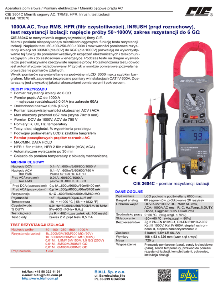 Aparatura pomiarowa / Pomiary elektryczne / Mierniki cęgowe prądu AC CIE 3604C Miernik cęgowy AC, TRMS, HFR, Inrush, test izolacji Nr kat. 103070 1000A AC, True RMS, HFR (filtr częstotliwości), INRUSH (prąd rozruchowy), test rezystancji izolacji: napięcie próby 50~1000V, zakres rezystancji do 6 GΩ CIE 3604C to nowy miernik cęgowy tajwańskiej firmy CIE. Miernik posiada niespotykaną w miernikach cęgowych funkcję testu rezystancji izolacji. Napięcia testu 50-100-250-500-1000V i max wartości pomiarowe rezystancji izolacji od 300MΩ (dla 50V) do 6GΩ (dla 1000V) pozwalają na wykorzystywanie tej funkcji do pomiarów wrażliwych urządzeń elektronicznych i telekomunikacyjnych jak i do zastosowań w energetyce. Podczas testu na drugim wyświetlaczu jest wskazywane rzeczywiste napięcie próby. Po zakończeniu testu obwód jest automatycznie rozładowywany. Przycisk w sondzie pomiarowej pozwala na prowadzenie pomiarów zdalnych. Wyniki pomiarów są wyświetlane na podwójnym LCD 6000 max z szybkim bargrafem. Miernik zapewnia bezpieczne pomiary w instalacjach CAT IV 600V. Dostarczany jest z wysokiej jakości akcesoriami pomiarowymi i pokrowcem. CECHY PRZYRZĄDU • Pomiar rezystancji izolacji do 6 GΩ • Pomiar prądu AC do 1000 A • • • • • • • • • • • • - najlepsza rozdzielczość 0,01A (na zakresie 60A) Dokładność bazowa 0,5% (DCV) Pomiar rzeczywistej wartości skutecznej ACV i ACA Max mierzony przewód Ø57 mm (szyna 70x18 mm) Pomiar DCV do 1000V, ACV do 750 V Pomiary: R, Cx, Hz, temperatury Testy: diod, ciągłości, % wypełnienia przebiegu Podwójny podświetlany LCD z szybkim bargrafem Pomiar początkowych prądów rozruchu AC MAX/MIN, DATA HOLD HFR 1 filtr >1kHz, HFR 2 filtr >10kHz (ACV, ACA) Automatyczne wyłączanie po 30 min Gniazdo do pomiaru temperatury z blokadą mechaniczną MIERNIK CĘGOWY Napięcie DCV Napięcie ACV 0,1mV ..600m/6/60/600/1000 V 0,1mV ..600m/6/60/600/750 V True RMS Pasmo 50~400 Hz, C.F. < 3 Prąd ACA (cęgami) 0,01A ..60/600/1000 A pasmo 50~400 Hz, C.F. < 3 True RMS Prąd DCA (przewodami) Prąd ACA (przewodami) Rezystancja Pojemność Temperatura Częstotliwość % DUTY Test ciągłości Test diody 0,µ1A ..600µ/6000µ/60m/6400 mA 0,µ1A ..600µ/6000µ/60m/6400 mA 0,1Ω ..600/6k/60k/600k/6M/60 MΩ 1nF ..6µ/60µ/600µ/6,6μ/6 mF -50 ~ +1000 °C (-58 ~ +1832 °F) 0,01Hz~60/60/6k/60k/600k/6M/10 MHz 5%~95% (40Hz~1kHz) dla R < 40Ω (czas zwłoki ok. 100 msek) zakres 2 V, prąd testu 0,5 mA TEST REZYSTANCJI IZOLACJI Napięcie próby Rezystancja izolacji Prąd zwarcia 50 - 100 - 250 - 500 - 1000 V 1k..300k/3M/30M/300 MΩ (50V) 1k..600k/6M/60M/600 MΩ (100V) 0,01M.. 1,5M/15M/150M/1,5 GΩ (250V) 0,01M.. 3M/30M/300M/3 GΩ 0,01M.. 6M/60M/600M/6 GΩ 1 mA tel./fax: +48 58 322 11 91 e-mail: [email protected] http://www.biall.com.pl CIE 3604C - pomiar rezystancji izolacji DANE OGÓLNE Wyświetlacz Bargraf analog. Ochrona wejść LCD podwójny podświetlany 6000 max 60 segmentów, próbkowanie 20 razy/sek DCV/ACV:1000V DC, 750V AC rms, ACA:-1000A AC rms; R, C, Hz,Temp.,%DUTY, Dioda, Ciągłość: 600V DC/ACrms Środowisko pracy 0~50 ºC (wilg.wzgl. < 70%) Składowanie -20~+60 ºC (wilg.wzgl. < 80%) Bezpieczeństwo Zg z PN-EN 61010-1, PN-EN 61010-2-032 Kat III 1000V, Kat IV 600V, stopień ochronności II, stopień zanieczyszczenia 2 5 baterii 1,5V LR 06, AA Zasilanie Wymiary 108 x 53 x 326 mm (szer x gł x wys) Masa 720 g Wyposażenie Przewody pomiarowe (para), sondy krokodylowe (para), sonda temperatury, przewód do pomiaru rezystancji izolacji, komplet baterii, pokrowiec, instrukcja obsługi BIALL Sp. z o.o. ul. Barniewicka 54c PL 80-299 GDAŃSK