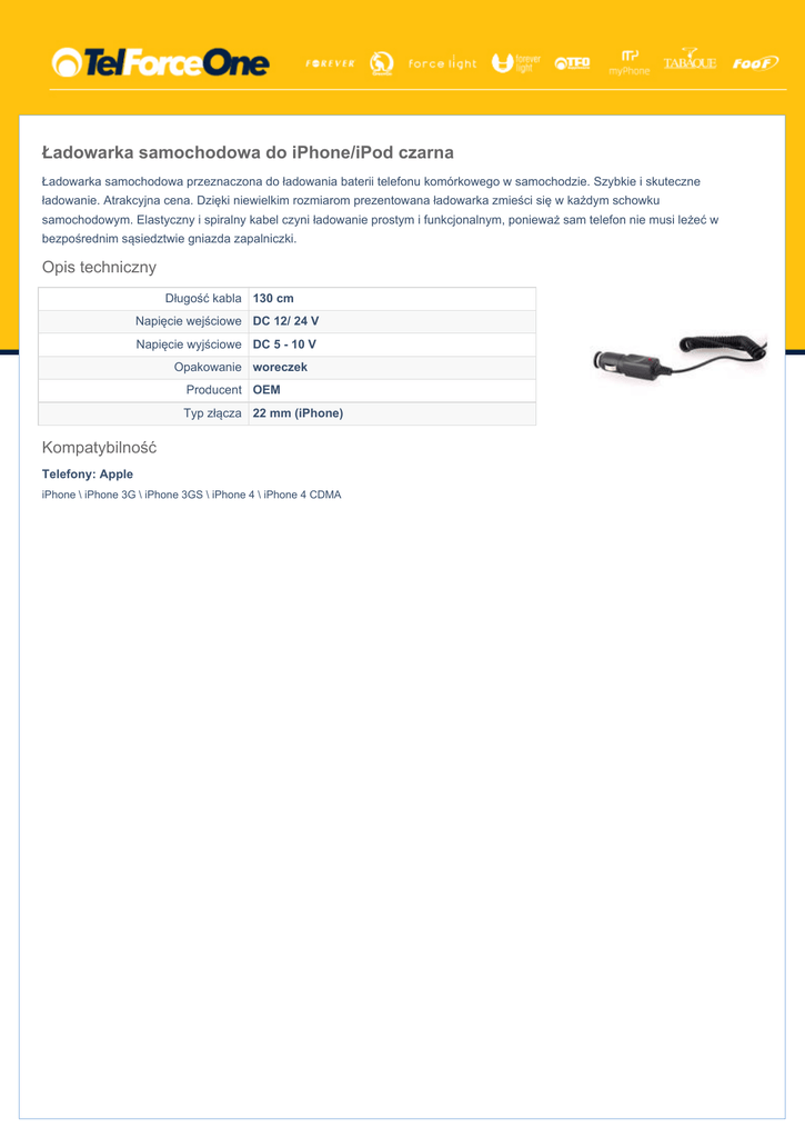 Ładowarka samochodowa do iPhone/iPod czarna Ładowarka samochodowa przeznaczona do ładowania baterii telefonu komórkowego w samochodzie. Szybkie i skuteczne ładowanie. Atrakcyjna cena. Dzięki niewielkim rozmiarom prezentowana ładowarka zmieści się w każdym schowku samochodowym. Elastyczny i spiralny kabel czyni ładowanie prostym i funkcjonalnym, ponieważ sam telefon nie musi leżeć w bezpośrednim sąsiedztwie gniazda zapalniczki. Opis techniczny Długość kabla 130 cm Napięcie wejściowe DC 12/ 24 V Napięcie wyjściowe DC 5 - 10 V Opakowanie woreczek Producent OEM Typ złącza 22 mm (iPhone) Kompatybilność Telefony: Apple iPhone \ iPhone 3G \ iPhone 3GS \ iPhone 4 \ iPhone 4 CDMA
