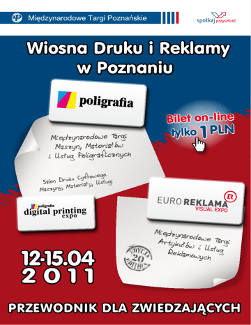 Wiosna Druku i Reklamy w Poznaniu Międzynarodowe Targi Maszyn, Materiałów i Usług Poligraficznych o. Cyfroweg u k u r D n gi Salo ały, Usłu ri e t a M , y Maszyn intoing digital prexp 12-15.04 2011 Bilet on-line tylko PLN 1 EURO REKLAMA VISUAL EXPO MIĘD ZYNA ROD OWE TARG I ARTY KUŁ ÓW I USŁU INTERNATIONA G REK LAM OWY L TRADE FAIR OF CH ADVERTISING GOOD S AND SERVICES Międzyn arodo Artykułó we Targi w i U Reklamow sług ych PRZEWODNIK DLA ZWIEDZAJĄCYCH PAW. 3A, 5 digital printing expo EURO REKLAMA VISUAL EXPO PAW. 3, 3A PAW. 3A MIĘDZYNARODOWE TARGI ARTYKUŁÓW I USŁUG REKLAMOWYCH INTERNATIONAL TRADE FAIR OF ADVERTISING GOODS AND SERVICES 2 POZNAŃ MTP BERLIN WARSZAWA A2 A2 WROCŁAW CENY BILETÓW po rejestracji on-line po rejestracji on-line z wjazdem po rejestracji w kasach biletowych bez rejestracji KATOWICE GODZINY OTWARCIA 1 PLN 41 PLN 20 PLN bilet jednodniowy 35 PLN bilet wielokrotny 60 PLN bilet jednodniowy 100 PLN bilet wielokrotny 12.04 – 14.04 (wtorek-czwartek): 10:00 – 17:00 15.04 (piątek): 10:00 – 16:00 WIOSNA DRUKU I REKLAMY W POZNANIU pawilon 3A i 5 • • • • • • • • • • sprzęt i oprogramowanie do prepress maszyny i urządzenia drukujące i introligatorskie urządzenia do uszlachetniania druku i etykietowania urządzenia do produkowania i przetwarzania materiałów poligraficznych maszyny do produkcji opakowań zadrukowanych urządzenia kontrolno-pomiarowe i pomocnicze części zamienne i podzespoły usługi poligraficzne materiały i akcesoria reprodukcja digital printing expo pawilon 3A • druk cyfrowy • druk wielkoformatowy • druk reklamowy EURO REKLAMA VISUAL EXPO pawilon 3 i 3A MIĘDZYNARODOWE TARGI ARTYKUŁÓW I USŁUG REKLAMOWYCH INTERNATIONAL TRADE FAIR OF ADVERTISING GOODS AND SERVICES • komunikacja wizualna (outdoor / indoor); digital signage, ekrany led, reklama świetlna i tranzytowa, balony, banery, namioty, konstrukcje reklamowe, flagi, maszty, kasetony • artykuły promocyjne i reklamowe • usługi reklamowe • agencje reklamowe i marketingowe • reklama radiowo-telewizyjna • fotografia reklamowa • grawerowanie i haft reklamowy • dostawcy usług reklamowych • usługi wystawiennicze • materiały i urządzenia do produkcji reklamy (maszyny, tkaniny, papier) • POS • technologie 3 SĄ POWODY, ŻEBY TU BYĆ! • Zobacz w jednym miejscu i czasie najnowsze technologie oraz nowości produktowe na rynku poligraficznym i out-of-home media • Spotkaj liderów rynku poligraficznego oraz reklamowego i nawiąż owocne kontakty biznesowe • Zainspiruj się przed przygotowaniem strategii marketingowej firmy • Zdobądź branżowe know-how uczestnicząc w konferencjach, seminariach i prezentacjach • Przygotuj się na Euro 2012 – wiele zleceń reklamowych czeka na realizację • Unowocześnij park maszynowy i zapoznaj się z najnowszymi rozwiązaniami w branży 4 Targi POLIGRAFIA i EURO-REKLAMA to: • 400 wystawców z 27 krajów na 23 000 m. kw. powierzchni wystawienniczej brutto • blisko 17 000 zwiedzających z 32 krajów świata • ponad 100 produktów i usług, które będą prezentowane na targach po raz pierwszy • kilkanaście konferencji, seminariów i pokazów tematycznych Wstęp na t argi po rejestrac ji on-li tylko 1PLN! www.poligra fia www.dpexpo .mtp.pl .pl www.euro-r eklama.mtp .pl ne yjazd wój prz s j u n la p Za ! już dziś on-line t le i b p Ku 1 PLN! em za 4 z wjazd l tp24.p www.m Tylko na ZAPLANUJ SWÓJ POBYT JUŻ DZIŚ! Pamiętaj aby się zarejestrować wypełniając ankietę rejestracyjną przez Internet oraz kupując bilet on-line zyskujesz nie tylko czas, ale także oszczędzasz pieniądze. Bilet elektroniczny na targi Poligrafia oraz Euro-Reklama kosztuje tylko 1 zł. Zakupu e-biletu można dokonać na stronie www.mtp24.pl. Upewnij się czy masz wystarczająco dużo czasu na zwiedzanie 400 wystawców, ciekawe ekspozycje, przestrzenie specjalne oraz konferencje powodują, że czas ucieka bardzo szybko. Zorganizuj podróż i zarezerwuj zakwaterowanie jeżeli poszukujesz ofert noclegowych w Poznaniu, nie wiesz gdzie się zatrzymać, dokąd pójść w wolnej chwili, skontaktuj się z nami! Chętnie odpowiemy na Twoje pytania. Odrób dobrze pracę domową” ” które Cie interesują. Umów wypisz branże oraz firmy, się na spotkanie z wybranymi wystawcami poprzez planer spotkań na stronach www.poligrafia.mtp.pl oraz www.euro-reklama.mtp.pl, w zakładce „Umów się na spotkanie”. umów się na spotkanie Pamiętaj o ulotce kupując bilet zwróć uwagę czy otrzymałeś ulotkę dla zwiedzających. Uzyskasz w niej wszelkie potrzebne informacje o lokalizacji firm, a także mapę targów. Bądź na bieżąco kup w kasie biletowej katalog wystawców w cenie 20 PLN. Zdobądź bazę danych swoich potencjalnych klientów. Zrób sobie przerwę zwiedzanie oraz rozmowy biznesowe mogą być męczące, dlatego zrób sobie przerwę w jednej ze specjalnie przygotowanych stref wypoczynku lub też w targowych restauracjach. Daj nam informację zwrotną EURO REKLAMA VISUAL EXPO MIĘDZYNARODOWE TARGI ARTYKUŁÓW I USŁUG REKLAMOWYCH INTERNATIONAL TRADE FAIR OF ADVERTISING GOODS AND SERVICES po zakończeniu imprezy targowej podziel się z nami swoją opinią, spostrzeżeniami, pomoże nam w przyszłym roku być jeszcze lepszym. Bądź z nami podczas kolejnej edycji jeśli stwierdzisz, że warto być naszym gościem, pamiętaj aby odpowiednio szybko zarejestrować się na kolejną edycję targów. 5 PROGRAM WYDARZEŃ Wtorek, 12.04.2011 11:00 – 14:00 Konferencja edukacyjna Zawodowe szkolnictwo poligraficzne w epoce przełomu technologii cyfrowych. sala WTC Organizator: Centralny Ośrodek Badawczo-Rozwojowy Przemysłu Poligraficznego, Międzynarodowe Targi Poznańskie • Poligrafia jako dyscyplina naukowa (prof. Andrzej Makowski) • Tradycja czy nowoczesność? Projektowanie współczesnych pism drukarskich (dr Artur Frankowski) • Estetyczne i intelektualne aspekty kształcenia poligrafów (