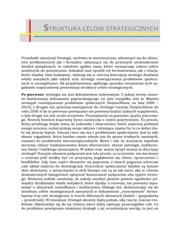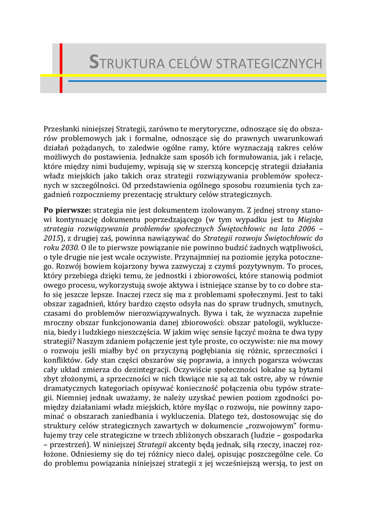 STRUKTURA CELÓW STRATEGICZNYCH Przesłanki niniejszej Strategii, zarówno te merytoryczne, odnoszące się do obszarów problemowych jak i formalne, odnoszące się do prawnych uwarunkowań działań pożądanych, to zaledwie ogólne ramy, które wyznaczają zakres celów możliwych do postawienia. Jednakże sam sposób ich formułowania, jak i relacje, które między nimi budujemy, wpisują się w szerszą koncepcję strategii działania władz miejskich jako takich oraz strategii rozwiązywania problemów społecznych w szczególności. Od przedstawienia ogólnego sposobu rozumienia tych zagadnień rozpoczniemy prezentację struktury celów strategicznych. Po pierwsze: strategia nie jest dokumentem izolowanym. Z jednej strony stanowi kontynuację dokumentu poprzedzającego (w tym wypadku jest to Miejska strategia rozwiązywania problemów społecznych Świętochłowic na lata 2006 – 2015), z drugiej zaś, powinna nawiązywać do Strategii rozwoju Świętochłowic do roku 2030. O ile to pierwsze powiązanie nie powinno budzić żadnych wątpliwości, o tyle drugie nie jest wcale oczywiste. Przynajmniej na poziomie języka potocznego. Rozwój bowiem kojarzony bywa zazwyczaj z czymś pozytywnym. To proces, który przebiega dzięki temu, że jednostki i zbiorowości, które stanowią podmiot owego procesu, wykorzystują swoje aktywa i istniejące szanse by to co dobre stało się jeszcze lepsze. Inaczej rzecz się ma z problemami społecznymi. Jest to taki obszar zagadnień, który bardzo często odsyła nas do spraw trudnych, smutnych, czasami do problemów nierozwiązywalnych. Bywa i tak, że wyznacza zupełnie mroczny obszar funkcjonowania danej zbiorowości: obszar patologii, wykluczenia, biedy i ludzkiego nieszczęścia. W jakim więc sensie łączyć można te dwa typy strategii? Naszym zdaniem połączenie jest tyle proste, co oczywiste: nie ma mowy o rozwoju jeśli miałby być on przyczyną pogłębiania się różnic, sprzeczności i konfliktów. Gdy stan części obszarów się poprawia, a innych pogarsza wówczas cały układ zmierza do dezintegracji. Oczywiście społeczności lokalne są bytami zbyt złożonymi, a sprzeczności w nich tkwiące nie są aż tak ostre, aby w równie dramatycznych kategoriach opisywać konieczność połączenia obu typów strategii. Niemniej jednak uważamy, że należy uzyskać pewien poziom zgodności pomiędzy działaniami władz miejskich, które myśląc o rozwoju, nie powinny zapominać o obszarach zaniedbania i wykluczenia. Dlatego też, dostosowując się do struktury celów strategicznych zawartych w dokumencie „rozwojowym” formułujemy trzy cele strategiczne w trzech zbliżonych obszarach (ludzie – gospodarka – przestrzeń). W niniejszej Strategii akcenty będą jednak, siłą rzeczy, inaczej rozłożone. Odniesiemy się do tej różnicy nieco dalej, opisując poszczególne cele. Co do problemu powiązania niniejszej strategii z jej wcześniejszą wersją, to jest on bardziej skomplikowany. Jedno z założeń, jakie sformułowaliśmy przystępując do prac nad prezentowanym dokumentem dotyczy ilości celów, które należy przed sobą stawiać. Powinno być ich tyle, by i zarządzanie realizacją strategii było w miarę proste, i planowane rezultaty w miarę realne. Dlatego też, pozostawiając problemy związane z ochroną środowiska naturalnego „strategii rozwojowej” połączyliśmy pozostałe osiem priorytetów strategicznych z lat 2006-2015 w trzy kategorie obecnej Strategii, nadając im wszakże różną wagę. W ten sposób doszliśmy do proponowanego układu trzech celów. Zarówno o odniesieniach do priorytetów strategicznych z lat 2006 – 2015 jak i do wagi przypisywanej przez nas poszczególnym celom strategicznym napiszemy nieco dalej, przy okazji omawiania poszczególnych celów prezentowanej Strategii. Po drugie: plan działania w zakresie rozwiązywania problemów społecznych, jeśli ma mieć charakter strategiczny, a nie taktyczny, musi wykraczać poza obszary bezpośredniego oddziaływania. Takim krokiem „poza” mógłby być, na przykład, postulat likwidacji poszczególnych obszarów problemowych. Ten jednak jest zupełnie nierealny. I to nie tylko ze względu na nasycenie poszczególnych obszarów konkretnymi problemami, ile ze względu na ich naturę. Jak to już określiliśmy w Diagnozie (co zostało również przywołane przy okazji omawiania założeń i przesłanek niniejszej Strategii), problemów społecznych się nie likwiduje. Można, co najwyżej, skutecznie nimi zarządzać zmniejszając dokuczliwość społeczną poszczególnych zjawisk i negatywne konsekwencje niedoskonałości życia społęcznego. Cały system miejski to układ o charakterze otwartym. Podatny jest na oddziaływania czynników zarówno pozytywnych jak i negatywnych. W każdym mieście mamy więc do czynienia ze specyficznymi cechami układów osadniczych (np. podział na dzielnice lepsze i gorsze z tendencją do rozwarstwiania społecznego przestrzeni) oraz z uniwersalnymi patologiami współczesnej cywilizacji, które koncentrują się we względnie anonimowych układach osiedleńczych: narkomania, agresja, alkoholizm, przestępczość, zanik więzi, nierówna dystrybucja zasobów ect. Poszukując zatem spoiwa dla całej Strategii zwracamy się w kierunki całego układu społecznego miasta przyjmując założenie, że ograniczanie negatywnych zjawisk musi mieć pozytywne konsekwencje nie tylko dla poszczególnych osób i rodzin dotkniętych wykluczeniem, ale również dla całej społeczności. Stąd nasz propozycja ogólnego celu dla wszelkich działań związanych ze Strategią rozwiązywania problemów społecznych Świętochłowic brzmi: WZROST POZIOMU INTEGRACJI SPOŁECZNEJ W ŚWIĘTOCHŁOWICACH POPRZEZ PRZECIWDZIAŁANIE WYKLUCZENIU MIESZKAŃCÓW Z RÓŻNYCH SFER ŻYCIA ORAZ WZMACNIANIE KONWERGENCJE ŁĄCZĄCEJ POSZCZEGÓLNE OBSZARY I PODMIOTY ŻYCIA SPOŁECZNEGO W MIEŚCIE 2 Podkreślamy w ten sposób poz