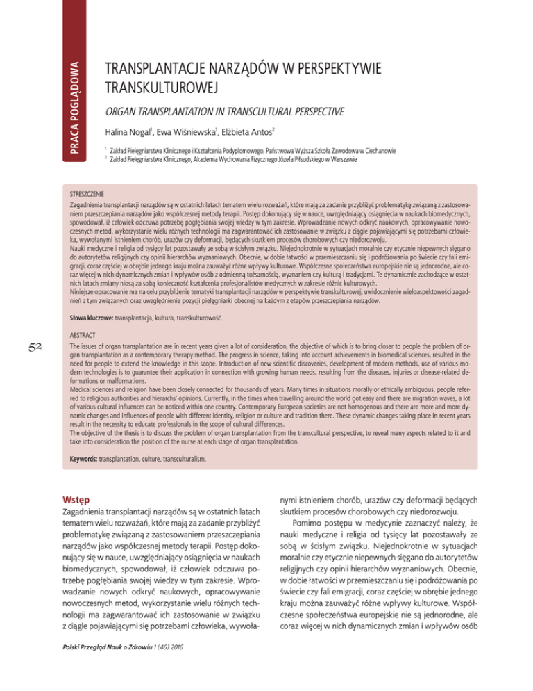 PRACA POGLĄDOWA TRANSPLANTACJE NARZĄDÓW W PERSPEKTYWIE TRANSKULTUROWEJ ORGAN TRANSPLANTATION IN TRANSCULTURAL PERSPECTIVE Halina Nogal1, Ewa Wiśniewska1, Elżbieta Antos2 1 2 Zakład Pielęgniarstwa Klinicznego i Kształcenia Podyplomowego, Państwowa Wyższa Szkoła Zawodowa w Ciechanowie Zakład Pielęgniarstwa Klinicznego, Akademia Wychowania Fizycznego Józefa Piłsudskiego w Warszawie STRESZCZENIE Zagadnienia transplantacji narządów są w ostatnich latach tematem wielu rozważań, które mają za zadanie przybliżyć problematykę związaną z zastosowaniem przeszczepiania narządów jako współczesnej metody terapii. Postęp dokonujący się w nauce, uwzględniający osiągnięcia w naukach biomedycznych, spowodował, iż człowiek odczuwa potrzebę pogłębiania swojej wiedzy w tym zakresie. Wprowadzanie nowych odkryć naukowych, opracowywanie nowoczesnych metod, wykorzystanie wielu różnych technologii ma zagwarantować ich zastosowanie w związku z ciągle pojawiającymi się potrzebami człowieka, wywołanymi istnieniem chorób, urazów czy deformacji, będących skutkiem procesów chorobowych czy niedorozwoju. Nauki medyczne i religia od tysięcy lat pozostawały ze sobą w ścisłym związku. Niejednokrotnie w sytuacjach moralnie czy etycznie niepewnych sięgano do autorytetów religijnych czy opinii hierarchów wyznaniowych. Obecnie, w dobie łatwości w przemieszczaniu się i podróżowania po świecie czy fali emigracji, coraz częściej w obrębie jednego kraju można zauważyć różne wpływy kulturowe. Współczesne społeczeństwa europejskie nie są jednorodne, ale coraz więcej w nich dynamicznych zmian i wpływów osób z odmienną tożsamością, wyznaniem czy kulturą i tradycjami. Te dynamicznie zachodzące w ostatnich latach zmiany niosą za sobą konieczność kształcenia profesjonalistów medycznych w zakresie różnic kulturowych. Niniejsze opracowanie ma na celu przybliżenie tematyki transplantacji narządów w perspektywie transkulturowej, uwidocznienie wieloaspektowości zagadnień z tym związanych oraz uwzględnienie pozycji pielęgniarki obecnej na każdym z etapów przeszczepiania narządów. Słowa kluczowe: transplantacja, kultura, transkulturowość. 52 ABSTRACT The issues of organ transplantation are in recent years given a lot of consideration, the objective of which is to bring closer to people the problem of organ transplantation as a contemporary therapy method. The progress in science, taking into account achievements in biomedical sciences, resulted in the need for people to extend the knowledge in this scope. Introduction of new scientific discoveries, development of modern methods, use of various modern technologies is to guarantee their application in connection with growing human needs, resulting from the diseases, injuries or disease-related deformations or malformations. Medical sciences and religion have been closely connected for thousands of years. Many times in situations morally or ethically ambiguous, people referred to religious authorities and hierarchs’ opinions. Currently, in the times when travelling around the world got easy and there are migration waves, a lot of various cultural influences can be noticed within one country. Contemporary European societies are not homogenous and there are more and more dynamic changes and influences of people with different identity, religion or culture and tradition there. These dynamic changes taking place in recent years result in the necessity to educate professionals in the scope of cultural differences. The objective of the thesis is to discuss the problem of organ transplantation from the transcultural perspective, to reveal many aspects related to it and take into consideration the position of the nurse at each stage of organ transplantation. Keywords: transplantation, culture, transculturalism. Wstęp Zagadnienia transplantacji narządów są w ostatnich latach tematem wielu rozważań, które mają za zadanie przybliżyć problematykę związaną z zastosowaniem przeszczepiania narządów jako współczesnej metody terapii. Postęp dokonujący się w nauce, uwzględniający osiągnięcia w naukach biomedycznych, spowodował, iż człowiek odczuwa potrzebę pogłębiania swojej wiedzy w tym zakresie. Wprowadzanie nowych odkryć naukowych, opracowywanie nowoczesnych metod, wykorzystanie wielu różnych technologii ma zagwarantować ich zastosowanie w związku z ciągle pojawiającymi się potrzebami człowieka, wywołaPolski Przegląd Nauk o Zdrowiu 1 (46) 2016 nymi istnieniem chorób, urazów czy deformacji będących skutkiem procesów chorobowych czy niedorozwoju. Pomimo postępu w medycynie zaznaczyć należy, że nauki medyczne i religia od tysięcy lat pozostawały ze sobą w ścisłym związku. Niejednokrotnie w sytuacjach moralnie czy etycznie niepewnych sięgano do autorytetów religijnych czy opinii hierarchów wyznaniowych. Obecnie, w dobie łatwości w przemieszczaniu się i podróżowania po świecie czy fali emigracji, coraz częściej w obrębie jednego kraju można zauważyć różne wpływy kulturowe. Współczesne społeczeństwa europejskie nie są jednorodne, ale coraz więcej w nich dynamicznych zmian i wpływów osób z odmienną tożsamością, wyznaniem czy kulturą i tradycjami. Te dynamicznie zachodzące w ostatnich latach zmiany niosą za sobą konieczność kształcenia profesjonalistów medycznych w zakresie różnic kulturowych. Niniejsze opracowanie ma na celu przybliżenie tematyki transplantacji narządów w perspektywie transkulturowej, uwidocznienie wieloaspektowości zagadnień z tym związanych oraz uwzględnienie pozycji pielęgniarki obecnej na każdym z etapów przeszczepiania narządów. Cel Celem badań przedstawionych w niniejszej pracy jest ukazanie zagadnień problematyki transplantacji narządów w perspektywie transkulturowej. Problemami badawczymi, których realizacji podjęto się w pracy, było ustalenie: 1) czy aspekt t