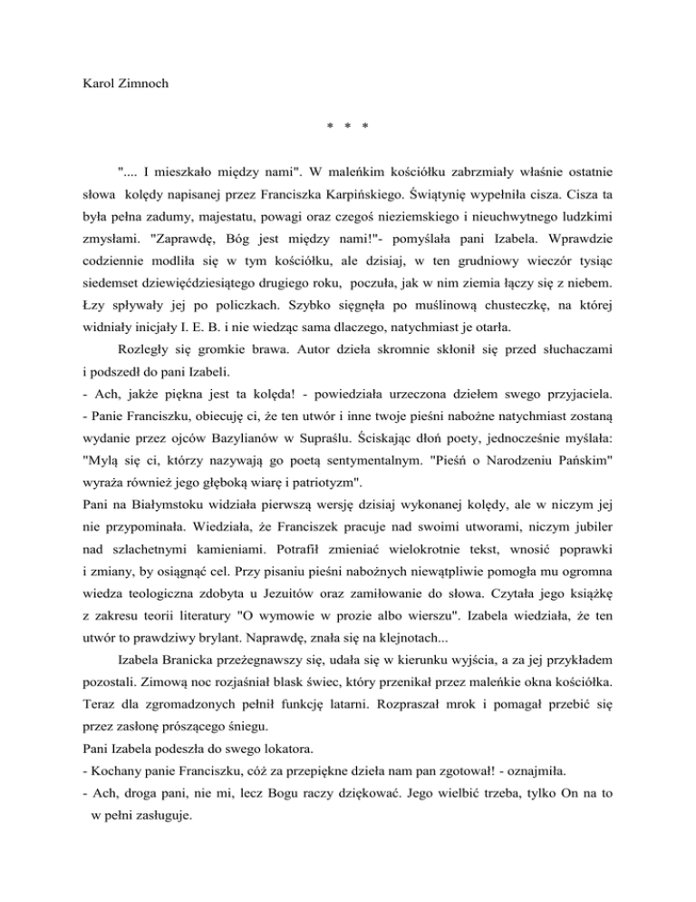 Karol Zimnoch * * * ".... I mieszkało między nami". W maleńkim kościółku zabrzmiały właśnie ostatnie słowa kolędy napisanej przez Franciszka Karpińskiego. Świątynię wypełniła cisza. Cisza ta była pełna zadumy, majestatu, powagi oraz czegoś nieziemskiego i nieuchwytnego ludzkimi zmysłami. "Zaprawdę, Bóg jest między nami!"- pomyślała pani Izabela. Wprawdzie codziennie modliła się w tym kościółku, ale dzisiaj, w ten grudniowy wieczór tysiąc siedemset dziewięćdziesiątego drugiego roku, poczuła, jak w nim ziemia łączy się z niebem. Łzy spływały jej po policzkach. Szybko sięgnęła po muślinową chusteczkę, na której widniały inicjały I. E. B. i nie wiedząc sama dlaczego, natychmiast je otarła. Rozległy się gromkie brawa. Autor dzieła skromnie skłonił się przed słuchaczami i podszedł do pani Izabeli. - Ach, jakże piękna jest ta kolęda! - powiedziała urzeczona dziełem swego przyjaciela. - Panie Franciszku, obiecuję ci, że ten utwór i inne twoje pieśni nabożne natychmiast zostaną wydanie przez ojców Bazylianów w Supraślu. Ściskając dłoń poety, jednocześnie myślała: "Mylą się ci, którzy nazywają go poetą sentymentalnym. "Pieśń o Narodzeniu Pańskim" wyraża również jego głęboką wiarę i patriotyzm". Pani na Białymstoku widziała pierwszą wersję dzisiaj wykonanej kolędy, ale w niczym jej nie przypominała. Wiedziała, że Franciszek pracuje nad swoimi utworami, niczym jubiler nad szlachetnymi kamieniami. Potrafił zmieniać wielokrotnie tekst, wnosić poprawki i zmiany, by osiągnąć cel. Przy pisaniu pieśni nabożnych niewątpliwie pomogła mu ogromna wiedza teologiczna zdobyta u Jezuitów oraz zamiłowanie do słowa. Czytała jego książkę z zakresu teorii literatury "O wymowie w prozie albo wierszu". Izabela wiedziała, że ten utwór to prawdziwy brylant. Naprawdę, znała się na klejnotach... Izabela Branicka przeżegnawszy się, udała się w kierunku wyjścia, a za jej przykładem pozostali. Zimową noc rozjaśniał blask świec, który przenikał przez maleńkie okna kościółka. Teraz dla zgromadzonych pełnił funkcję latarni. Rozpraszał mrok i pomagał przebić się przez zasłonę prószącego śniegu. Pani Izabela podeszła do swego lokatora. - Kochany panie Franciszku, cóż za przepiękne dzieła nam pan zgotował! - oznajmiła. - Ach, droga pani, nie mi, lecz Bogu raczy dziękować. Jego wielbić trzeba, tylko On na to w pełni zasługuje. - Zgadzam się z panem. Nie ukrywam, że "Pieśń o Narodzeniu Pańskim" poruszyła mnie do głębi. Jestem wdzięczna Bogu, że pod mój dach przysłał tak wspaniałego poetę! - A ja jestem wdzięczny, że mam zaszczyt mieszkać, jeść i tworzyć w pałacu państwa Branickich. Codziennie dziękuję Stwórcy, za pani dobroduszność - odparł Franciszek. Izabela spostrzegła, że goście zaczynają dygotać z zimna. - Drodzy państwo, zapraszam teraz do szpitala szarytek. Podzielimy się tam opłatkiem z chorymi, a następnie doktor Jakub Feliks Michelis opowie nam po nowo otwartym Instytucie Akuszerii. * * * Wieczór, choć piękny, był przeraźliwie zimny. Śniegu nasypało dużo, co bardzo utrudniało oraz wydłużało przejście z kościółka do szpitala. Na początku szli mężczyźni, aby wydeptać drogę damom. Było to niesamowicie szarmanckie zachowanie z ich strony, każda z kobiet musiała to przyznać. Wkrótce grupa dotarła do celu. Pomimo mufki z króliczej skóry, pani Izabeli bardzo zmarzły dłonie. Kiedy wszyscy weszli do środka, ucieszyli się, gdyż w pomieszczeniach było przyjemnie ciepło. Szarytki trochę zmieszały się i zdenerwowały, widząc tak znamienitych gości. Jednocześnie cieszyły się, że ktoś pamięta o ich podopiecznych. A że był to czas Bożego Narodzenia, wszystkim wręczyły opłatki, aby podzielili się nimi z chorymi. Każdy z podopiecznych sióstr chciał chociaż ujrzeć panią Branicką. Wszyscy wiedzieli, że to dzięki niej mają tak wspaniałą opiekę. Znali jej dobre serce i wrażliwość. Faktycznie, chyba nie znalazła się osoba, która nie złożyłaby jej życzeń i nie czuła głębokiej wdzięczności. Na końcu podszedł do pani Izabeli doktor Jakub Feliks Michelis - jej osobisty lekarz. - Witaj, pani na Białymstoku, niezmiernie się cieszę, że widzę panią zdrową i w pełni sił. - To wszystko pana zasługa, panie Jakubie. Czy zechciałby pan oprowadzić moi gościom o Instytucie Akuszerii? Doktor Michelis, człowiek niezwykle oddany rodzinie Branickich, miastu, a przede wszystkim najbiedniejszym i chorym, zaczął z pasją opowiadać o swojej szkole. Instytut Akuszerii w Białymstoku był drugą taką uczelnią w Polsce. - Ach, byłbym zapomniał- zwrócił się do pani Izabeli- dostałem niedawno listo od przyjaciela z Anglii. Pisze w nim o rzeczach nadzwyczajnych. Otóż, zostało wynalezione lekarstwo na ospę! Nazywa się to szczepionką i może uratować ludzi od śmierci! - wyjawił podekscytowany doktor. - Naprawdę? Proszę koniecznie sprowadzić to lekarstwo do Białegostoku! Pragnę, aby każdy potrzebujący znalazł ratunek! Pani Izabela Branicka nigdy nie żałowała pieniędzy na szpital i dzisiaj w tym wyjątkowym dniu wręczyła niemałą sumę przełożonej. To był niezwykły wieczór wzruszeń i dobroci! * * * Służący otworzyli drzwi i wszyscy będący w sali balowej pałacu, zwrócili oczy ku wchodzącej Izabeli Branickiej. Jakże pięknie dzisiaj wyglądała! Miała na sobie wspaniałą, wręcz nieziemską suknię rogówkę wykonaną z różowego atłasu. Zdobiły ją misterne hafty w roślinne wzory. Długi tren dodawał gospodyni dostojeństwa. Chociaż nie była już młoda, wciąż wyglądała pięknie, dzięki swej alabastrowej cerze i radosnym oczom. Na policzku, oprócz różowego pudru miała muszkę w kształcie serca, bardzo modną, szczególnie we Francji. Miała również na głowie białą perukę, która dodawała jej nie tylko ur