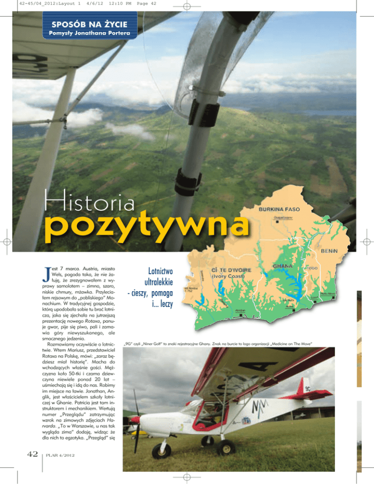 42-45/04_2012:Layout 1 4/6/12 12:10 PM Page 42 SPOSÓB NA ŻYCIE Pomysły Jonathana Portera Historia pozytywna BURKINA FASO Ouagadougou BENIN GHANA TOGO Mt Nimba 1 752 Porto Novo Lomª Lac Volta Accra a PLAR 4/2012 CÎ TE D'IVOIRE (Ivory Coast) am nd Ba 42 Lotnictwo ultralekkie - cieszy, pomaga i... leczy Sassandra J est 7 marca. Austria, miasto Wels, pogoda taka, że nie żałuję, że zrezygnowałem z wyprawy samolotem – zimno, szaro, niskie chmury, mżawka. Przyleciałem rejsowym do „pobliskiego” Monachium. W tradycyjnej gospodzie, którą upodobała sobie tu brać lotnicza, jaka się zjechała na jutrzejszą prezentację nowego Rotaxa, panuje gwar, pije się piwo, pali i zamawia góry niewyszukanego, ale smacznego jedzenia. Rozmawiamy oczywiście o lotnictwie. Wtem Mariusz, przedstawiciel Rotaxa na Polskę, mówi: „zaraz będziesz miał historię”. Macha do wchodzących właśnie gości. Mężczyzna koło 50-tki i czarna dziewczyna niewiele ponad 20 lat – uśmiechają się i idą do nas. Robimy im miejsce na ławie. Jonathan, Anglik, jest właścicielem szkoły lotniczej w Ghanie. Patricia jest tam instruktorem i mechanikiem. Wertują numer „Przeglądu” zatrzymując wzrok na zimowych zdjęciach Harvarda. „To w Warszawie, u nas tak wygląda zima” dodaję, widząc że dla nich to egzotyka. „Przegląd” się Abidjan „9G” czyli „Niner Golf” to znaki rejestracyjne Ghany. Znak na burcie to logo organizacji „Medicine on The Move” 42-45/04_2012:Layout 1 4/6/12 12:10 PM Page 43 Patricia opanowała latanie niemal od pierwszego lotu, obecnie jest instruktorem, co na warunki afrykańskie jest ewenementem podoba bo Jonathan go sobie bezceremonialnie przywłaszcza. Pojawia się kelnerka z wianuszkiem kufli – ale nasi goście proszą o piwo bezalkoholowe, wcześniej Jonathan odsunął jak najdalej popielniczkę. Zauważam, że, choć w rozmowie dowcipny i bezpośredni, pozostaje cały czas skupiony i uważny. Opowiada o tym co robi, a Patricia darzy mnie łagodnym spojrzeniem i potakuje głową. Słucham i przyznaję rację: to jest naprawdę nielicha historia... Jonathan pracował w Anglii jako informatyk, dużo zarabiał, zrobił licencję i latał. Potem miał wypadek samochodowy, spędził dużo czasu na wózku inwalidzkim i rozmyślał uprawnienia i zaoferował pomoc. Usłyszał: „Chcesz, to rób!” (w latach 90. to samo zrobił Mirek Zalewski w RPA w odniesieniu do wiatrakowców). Jonathan założył szkołę, w oparciu o samoloty CH701 STOL budowane z zestawów w tejże szkole. Równocześnie założył dwie organizacje non-profit działające na zasadzie wolontariatu. Do prac na lotnisku i przy sprzęcie przyuczył miejscową młodzież. Praca u podstaw i selekcja: musisz bardzo chcieć, żeby tu zostać. Jednocześnie przeloty w ramach szkoły połączył z wykonywaniem misji charytatywnych. Klienci (głównie Europejczycy mieszkający w Ghanie lub przyjeżdżający, żeby zebrać do- W Ghanie nie było przepisów ultralajtowych. W tamtejszym urzędzie lotnictwa powiedziano „Chcesz tu latać – opracuj je sam” W pobliżu lotniska rozciągają się malownicze wzgórza Akwapim-Togo Budując samolot nie tylko zdobywają zawód ale walczą o swoje marzenia... Praca na lotnisku jest zawsze i dla wszystkich... nad życiem. Później się przeprowadził z żoną do Francji, gdzie pracował jako nauczyciel w szkole, zrobił francuskie uprawnienia ultralajtowe i też latał. Potem nagle rzucił wszystko i wyjechał do kraju wybranego z globusa. Wypadło na Ghanę. Poszedł do tamtejszego urzędu lotnictwa cywilnego, który nie miał żadnych przepisów regulujących latanie na ultralajtach, pokazał swoje świadczenie w lataniu w tropikalnych warunkach) nie mają nic naprzeciw temu, żeby zadanie polegało na odnalezieniu osady gdzieś w buszu, niepołączonej ze światem żadną drogą i dokonaniu tam zrzutu jakichś potrzebnych do życia drobiazgów... Organizacja założona przez Jonathana nazywa się WAASPS, co znającym historię lotnictwa kojarzy się z amerykańską służbą pomocniczą kobiet w lotnictwie z czasów wojny. Choć rozwinięcie skrótu jest inne i znaczy „lotniczy projekt dla zachodniej Afryki...”, to jednak ma związek z historyczną nazwą: organizacja obejmuje swoim programem wyłącznie młodzież żeńską. Dlaczego? „To jest Afryka. Tu kobiety mają dużo gorszą pozy- PLAR 4/2012 43 42-45/04_2012:Layout 1 4/6/12 12:11 PM Page 44 SPOSÓB NA ŻYCIE Pomysły Jonathana Portera Lotnisko Kpong. Chętni do potrenowania latania w tropikalnych warunkach w przyjaznym kraju znajdą informacje na www.waasps.com Patricia zaczynała od wycinania krzewów na lotnisku – z uporem i wielkim poświęceniem, gdy inni kandydaci rezygnowali Samotna osada w środku sawanny – jeden z obiektów „nalotów” lotników Jonathana giej dziewczynki Lydii, przeczytałem później w internecie. W dzieciństwie ukąsił ją jakiś gad czy owad, czego skutkiem był paraliż ręki. Lydia przez swoją pracę i determinacją dopięła swego: zakwalifikowano ją na szkolenie. Gdy zaczęła latać – zaczęła też odzyskiwać władzę w tej ręce. Jest w stanie już obsłużyć nią klapy. Brzmi jak cud, ale to zjawisko znane – przez latanie mogą w organizmie zajść różne pozytywne zjawiska psychosomatyczne... Z kolei Patricia stanowi dziś wizytówkę całego programu. Była w zeszłym roku na Oshkosh, spotkała się ze stowarzyszeniem amerykańskich pilotek „99´s”, pisała o niej lotnicza prasa... Ona też przyszła kiedyś na lotnisko, wyrywając się z jakiegoś beznadziejnego dzieciństwa. Jonathan dał jej maczetę i za- Hasło WAASPS wypisane na koszulkach: „Budujemy samoloty i szkolimy pilotów jutra – DZIŚ w Ghanie” cję społeczną i możliwość startu niż mężczyźni. To, co oferujemy tym dziewczętom, zmienia ich życie diametralnie. Dlatego są bardzo odpowiedzialne, silnie zmotywowane, uczciwe, pracowite i co najwa