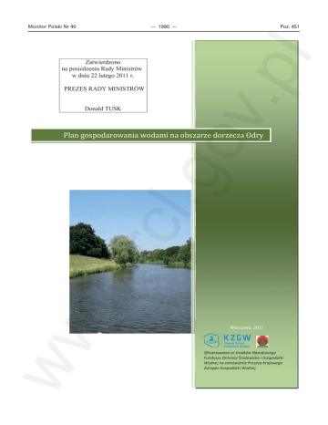 — 1990 — Poz. 451 w. rcl .go v.p l Monitor Polski Nr 40 Zatwierdzono na posiedzeniu Rady Ministrów w dniu 22 lutego 2011 r. PREZES RADY MINISTRÓW Donald TUSK ww Plan gospodarowania wodami na obszarze dorzecza Odry Warszawa, 2011 Sfinansowano ze środków Narodowego Funduszu Ochrony Środowiska i Gospodarki Wodnej na zamówienie Prezesa Krajowego Zarządu Gospodarki Wodnej Monitor Polski Nr 40 — 1991 — Poz. 451 w. rcl .go v.p l Spis treści: 1. Stosowane skróty i pojęcia . . . . . . . . . . . . . . . . . . . . . . . . . . . . . . . . . . . . . . . . 1994 2. Planowanie w gospodarowaniu wodami zgodnie z Ramową Dyrektywą Wodną 1996 . . . . . . . . . 3. Ogólny opis cech charakterystycznych obszaru dorzecza . . . . . . . . . . . . . . . Wody powierzchniowe . . . . . . . . . . . . . . . . . . . . . . . . . . . . . . . . . . Odwzorowanie położenia granic części wód powierzchniowych . . . . . . . . . Odwzorowanie typów części wód powierzchniowych . . . . . . . . . . . . . . . Wyznaczenie silnie zmienionych i sztucznych części wód . . . . . . . . . . . . . Określenie warunków referencyjnych dla typów części wód powierzchniowych Wody podziemne . . . . . . . . . . . . . . . . . . . . . . . . . . . . . . . . . . . . . . Odwzorowanie położenia granic części wód podziemnych . . . . . . . . . . . . . . . . . . . . . . . . . . . . . . . . . . . . . . . . . . . . . . . . . . . . . . . . . . . . . . . . . . . . . . . . . . . . 4. Podsumowanie znaczących oddziaływań i wpływów działalności człowieka na stan wód powierzchniowych i podziemnych . . . . . . . . . . . . . . . . . . . . . . . . . . . . . . . . . . . . Punktowe źródła zanieczyszczeń . . . . . . . . . . . . . . . . . . . . . . . . . . . . . . . . . . . . . Zanieczyszczenia obszarowe wraz z krótką charakterystyką użytkowania gruntów . . . . . . . . . Oddziaływania wywierane na ilościowy stan wód — pobory wód powierzchniowych i podziemnych . . . . . . . . . . . . . . . . . . . . . . . . . . . . . . . . . . . . . . . . . . . . . . . . . . . . . 1998 2009 2009 2009 2012 2013 2016 2016 2017 2017 2019 2021 5. Zmiany klimatu a gospodarowanie wodami w pierwszym cyklu planistycznym . . . . . . . . . . Zróżnicowanie przestrzenne oraz zmienność opadów atmosferycznych na obszarze dorzecza Odry . . . . . . . . . . . . . . . . . . . . . . . . . . . . . . . . . . . . . . . . . . . . . . . . . . . . . Rozkład przestrzenny oraz zmienność temperatury powietrza na obszarze dorzecza Odry . . . . Obserwowane i prognozowane skutki globalnego ocieplenia w Polsce . . . . . . . . . . . . . . . 2025 2028 2031 6. Określenie i odwzorowanie obszarów chronionych . . . . . . . . . . . . . . . . . . . . . . . . . . 2034 7. Monitoring wód oraz ocena stanu Wody powierzchniowe . . . . . . Wody podziemne . . . . . . . . . Obszary chronione . . . . . . . . . . . . . 2037 2037 2041 2045 2047 . . . . . . . . . . . . . . . . . . . . . . . . . . . . . . . . . . . . . . . . . . . . . . . . . . . . . . . . . . . . . . . . . . . . . . . . . . . . . . . . . . . . . . . . . . . . . . . . . . . . . . . . . . . . . . . . . . . . . . . . . . . . . . . . . . . . . . . . . . . . 2025 . . . . . . . ustalonych . . . . . . . . . . . . . . . . . . . . . . . na . . . . . . 2047 2054 2059 9. Podsumowanie analizy ekonomicznej korzystania z wód . . . . . . . . . . Charakterystyka ekonomiczna obszaru dorzecza . . . . . . . . . . . . . . . Zwrot kosztów usług wodnych w sektorze komunalnym . . . . . . . . . . Zwrot kosztów usług wodnych w sektorze przemysłu . . . . . . . . . . . . Zwrot kosztów usług wodnych w rolnictwie i leśnictwie . . . . . . . . . . . Zwrot kosztów usług wodnych w pozostałych formach korzystania z wód Oszacowanie kosztów zasobowych i środowiskowych . . . . . . . . . . . . . . . . . . . . . . . . . . . . . . . . 2071 2071 2072 2078 2079 2080 2082 10. Podsumowanie programów działań zapisanych w Programie wodno-środowiskowym kraju . . 2085 11. Wykaz pozostałych programów i planów wraz z krótką charakterystyką . . . . . . . Krajowe dokumenty o charakterze planistycznym i rozwojowym . . . . . . . . . . . Strategia Rozwoju Kraju 2007—2015 . . . . . . . . . . . . . . . . . . . . . . . . . Narodowy Plan Rozwoju 2007—2013 . . . . . . . . . . . . . . . . . . . . . . . . . Narodowa Strategia Rozwoju Regionalnego . . . . . . . . . . . . . . . . . . . . . Koncepcja Polityki Przestrzennego Zagospodarowania Kraju . . . . . . . . . . . Polityka ekologiczna Państwa w latach 2009—2012 z perspektywą do roku 2016 Krajowy Program Zwiększenia Lesistości (aktualizacja 2003 r.) . . . . . . . . . . Strategia Rozwoju Energetyki Odnawialnej . . . . . . . . . . . . . . . . . . . . . 2101 2102 2102 2103 2104 2105 2106 2114 2115 ww 8. Cele środowiskowe oraz odstępstwa od osiągnięcia celów środowiskowych . . Cele środowiskowe dla wód powierzchniowych oraz obszarów chronionych, mocy Art. 4 RDW . . . . . . . . . . . . . . . . . . . . . . . . . . . . . . . . . . . . . Cele środowiskowe dla wód podziemnych ustalonych na mocy Art. 4 RDW . . . Odstępstwa od osiągnięcia celów środowiskowych (derogacje) . . . . . . . . . . . . . . . . . . . . . . . . . . . . . . . . . . . . . . . . . . . . . . . . . . . . . . . . . . . . . . . . . . . . . . . . . . . . . . . . . . . . . . . . . . . . . . . . . . . . . . . . . . . . . . . . . . . . . . . . . . . . . . . . . . . . . . . . . . . . . . . Monitor Polski Nr 40 — 1992 — . . . . . . . . . . . . . . . . . . . . . . . . 2116 2117 2119 2119 2121 2123 2124 2126 2128 2133 2135 2137 2138 2140 2141 2141 2147 2159 2160 2168 2176 2178 2181 2182 12. Krótka charakterystyka działań zastosowanych w celu informowania społeczeństwa, opis wyników i dokonanych na tej podstawie zmian w planie . . . . . . . . . . . . . . . . . . . . . . . . . . I tura konsultacji społecznych . . . . . . . . . . . . . . . . . . . . . . . . . . . . . . . . . . . . . . II tura konsultacji s