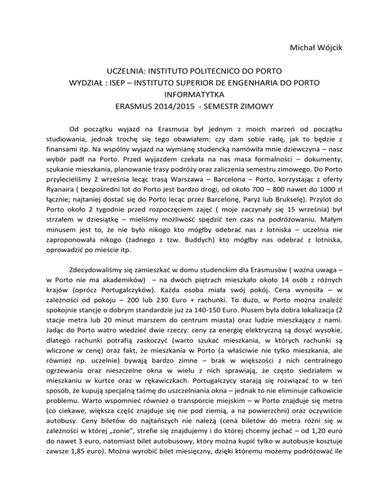 Michał Wójcik UCZELNIA: INSTITUTO POLITECNICO DO PORTO WYDZIAŁ : ISEP – INSTITUTO SUPERIOR DE ENGENHARIA DO PORTO INFORMATYTKA ERASMUS 2014/2015 - SEMESTR ZIMOWY Od początku wyjazd na Erasmusa był jednym z moich marzeń od początku studiowania, jednak trochę się tego obawiałem: czy dam sobie radę, jak to będzie z finansami itp. Na wspólny wyjazd na wymianę studencką namówiła mnie dziewczyna – nasz wybór padł na Porto. Przed wyjazdem czekała na nas masa formalności – dokumenty, szukanie mieszkania, planowanie trasy podróży oraz zaliczenia semestru zimowego. Do Porto przylecieliśmy 2 września lecąc trasą Warszawa – Barcelona – Porto, korzystając z oferty Ryanaira ( bezpośredni lot do Porto jest bardzo drogi, od około 700 – 800 nawet do 1000 zł łącznie; najtaniej dostać się do Porto lecąc przez Barcelonę, Paryż lub Brukselę). Przylot do Porto około 2 tygodnie przed rozpoczęciem zajęć ( moje zaczynały się 15 września) był strzałem w dziesiątkę – mieliśmy możliwość spędzić ten czas na podróżowaniu. Małym minusem jest to, że nie było nikogo kto mógłby odebrać nas z lotniska – uczelnia nie zaproponowała nikogo (żadnego z tzw. Buddych) kto mógłby nas odebrać z lotniska, oprowadzić po mieście itp. Zdecydowaliśmy się zamieszkać w domu studenckim dla Erasmusów ( ważna uwaga – w Porto nie ma akademików) – na dwóch piętrach mieszkało około 14 osób z różnych krajów (oprócz Portugalczyków). Każda osoba miała swój pokój. Cena wynosiła – w zależności od pokoju – 200 lub 230 Euro + rachunki. To dużo, w Porto można znaleźć spokojnie stancje o dobrym standardzie już za 140-150 Euro. Plusem była dobra lokalizacja (2 stacje metra lub 20 minut marszem do centrum miasta) oraz ludzie mieszkający z nami. Jadąc do Porto watro wiedzieć dwie rzeczy: ceny za energię elektryczną są dosyć wysokie, dlatego rachunki potrafią zaskoczyć (warto szukać mieszkania, w których rachunki są wliczone w cenę) oraz fakt, że mieszkania w Porto (a właściwie nie tylko mieszkania, ale również np. uczelnie) bywają bardzo zimne – brak w większości z nich centralnego ogrzewania oraz nieszczelne okna w wielu z nich sprawiają, że często siedziałem w mieszkaniu w kurtce oraz w rękawiczkach. Portugalczycy starają się rozwiązać to w ten sposób, że kupują specjalną taśmę do uszczelniania okna – jednak to nie eliminuje całkowicie problemu. Warto wspomnieć również o transporcie miejskim – w Porto znajduje się metro (co ciekawe, większa część znajduje się nie pod ziemią, a na powierzchni) oraz oczywiście autobusy. Ceny biletów do najtańszych nie należą (cena biletów do metra różni się w zależności w której „zonie”, strefie się znajdujemy i do której chcemy jechać – od 1,20 euro do nawet 3 euro, natomiast bilet autobusowy, który można kupić tylko w autobusie kosztuje zawsze 1,85 euro). Można wyrobić bilet miesięczny, dzięki któremu możemy podróżować ile chcemy pomiędzy wybranymi „zonami” – tu ceny (po okazaniu potwierdzenia, że jesteśmy studentami) rozpoczynają się od 22 Euro. Warto kasować bilety, gdyż kontrole są częste, a kara wynosi 100 euro. W mieście można podróżować również zabytkowym tramwajem, który kursuje tylko na jednej króciutkiej linii. Pogoda w Porto trochę nas zaskoczyła – oczekiwaliśmy (ulegając trochę stereotypowi ciepłego kraju) słonecznej i ciepłej pogody przez cały czas. Rzeczywistość była inna – o ile wrzesień i październik był wspaniały (od 20 do 30 stopni oraz słoneczna pogoda), o tyle późna jesień i zima to ciągłe, intensywne deszcze, silny wiatr oraz temperatura w okolicach 5 – 10 stopni (najgorszy był listopad i grudzień, w styczniu temperatura oscylowała w ciągu dnia w okolicach 15 stopni). Podróż do mojej uczelni (ISEP, wydział informatyczny) zajmowała mi w jedną stronę około 30 minut. Miałem zajęcia po portugalsku (uczelnia ta nie oferowała żadnych przedmiotów po angielsku, jedynie możliwość zrobienia projektu za 30 punktów ECTS). Z porozumiewaniem się ze studentami i wykładowcami nie miałem problemu – w większości młodzi ludzie mówili PRZYNAJMNIEJ dobrze, a większość z nich mówiła po angielsku płynnie. Z wykładowcami bywało różnie, ale potrafiłem się z nimi jakoś porozumieć. W Porto studiowałem 5 przedmiotów; z każdego z nich miałem zarówno zajęcia praktyczne jak i teoretyczne. Godziny moich zajęć wyglądały każdego dnia tak samo – od 13 do 18 spędzałem czas na uczelni. Porównując poziom pomiędzy moją macierzystą uczelnią a moim wydziałem w Porto można dostrzec jedną zasadniczą różnicę – o ile w Polsce poziom materiału jest jednak wyższy, o tyle w Portugalii stawia się głównie na praktykę (i to nie jest tylko moja opinia) – z każdego przedmiotu musiałem zrobić (w grupie) projekty, które były wymagające. Bardzo mi się to podejście do studiowania podobało, studiujący mieli możliwość wykorzystywania w praktyce zdobytych teoretycznych wiadomości. W końcowej ocenie przedmiotu brano pod uwagę ocenę z tych projektów (zwykle około 40 – 50 % oceny końcowej), egzamin (około 40 %) oraz inne czynniki (prezentacje, prace na zajęciach, testy itp.). „Braga się modli, Coimbra studiuje, Lizbona się bawi, a Porto pracuje” – tak brzmi portugalskie przysłowie. Ja sam Porto nazwałbym miastem, które nigdy nie śpi – tam zawsze coś się dzieje. Miasto jest pełne barów, klubów, kawiarenek, które w godzinach nocnych są pełne ludzi. W porze większość studentów i młodych ludzi imprezuje oraz spędza czas ze znajomymi. W przeciwieństwie do Polski, w Portugalii impreza zaczyna się około północy, a kończy nie raz o godzinie 6 czy nawet później. Portugalia, jeżeli chodzi o zabytki i zwiedzanie jest krajem PRZEPIĘKNYM. Każde z ważniejszych miast takich jak
