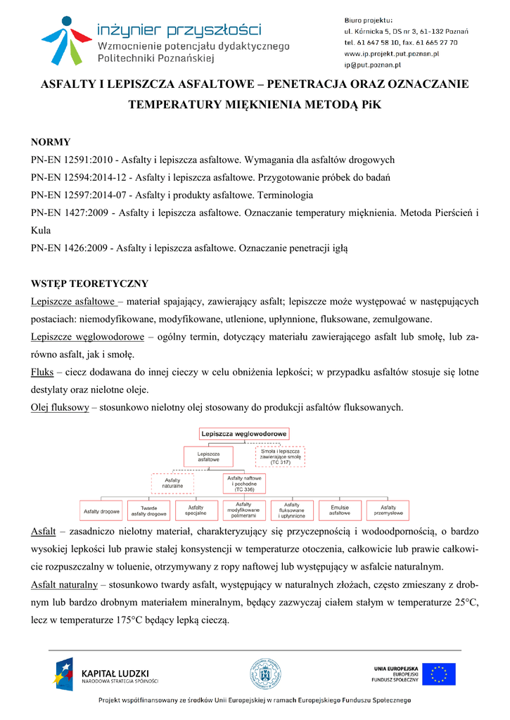 ASFALTY I LEPISZCZA ASFALTOWE – PENETRACJA ORAZ OZNACZANIE TEMPERATURY MIĘKNIENIA METODĄ PiK NORMY PN-EN 12591:2010 - Asfalty i lepiszcza asfaltowe. Wymagania dla asfaltów drogowych PN-EN 12594:2014-12 - Asfalty i lepiszcza asfaltowe. Przygotowanie próbek do badań PN-EN 12597:2014-07 - Asfalty i produkty asfaltowe. Terminologia PN-EN 1427:2009 - Asfalty i lepiszcza asfaltowe. Oznaczanie temperatury mięknienia. Metoda Pierścień i Kula PN-EN 1426:2009 - Asfalty i lepiszcza asfaltowe. Oznaczanie penetracji igłą WSTĘP TEORETYCZNY Lepiszcze asfaltowe – materiał spajający, zawierający asfalt; lepiszcze może występować w następujących postaciach: niemodyfikowane, modyfikowane, utlenione, upłynnione, fluksowane, zemulgowane. Lepiszcze węglowodorowe – ogólny termin, dotyczący materiału zawierającego asfalt lub smołę, lub zarówno asfalt, jak i smołę. Fluks – ciecz dodawana do innej cieczy w celu obniżenia lepkości; w przypadku asfaltów stosuje się lotne destylaty oraz nielotne oleje. Olej fluksowy – stosunkowo nielotny olej stosowany do produkcji asfaltów fluksowanych. Asfalt – zasadniczo nielotny materiał, charakteryzujący się przyczepnością i wodoodpornością, o bardzo wysokiej lepkości lub prawie stałej konsystencji w temperaturze otoczenia, całkowicie lub prawie całkowicie rozpuszczalny w toluenie, otrzymywany z ropy naftowej lub występujący w asfalcie naturalnym. Asfalt naturalny – stosunkowo twardy asfalt, występujący w naturalnych złożach, często zmieszany z drobnym lub bardzo drobnym materiałem mineralnym, będący zazwyczaj ciałem stałym w temperaturze 25°C, lecz w temperaturze 175°C będący lepką cieczą. Asfalt drogowy – asfalt stosowany do otaczania kruszyw mineralnych, używany w budowie i utrzymaniu nawierzchni drogowych; w Europie najczęściej używane rodzaje asfaltów drogowych są zdefiniowane penetracją oznaczaną w temperaturze 25ºC, maksymalnej wartości 900x0,1 mm. Asfalt miękki – asfalt drogowy stosowany do produkcji mieszanek mineralno-asfaltowych o niskim module sztywności. Asfalt drogowy twardy – asfalt drogowy do produkcji mieszanek mineralno-asfaltowych o wysokim module sztywności; podział na twarde i miękki asfalty nie jest precyzyjny, to za twarde asfalty uważa się 10/20, 15/25 oraz 20/30. Asfalt modyfikowany – asfalt, którego właściwości reologiczne zostały zmodyfikowane w procesie produkcji w wyniku użycia jednej lub większej liczby substancji chemicznych. Określeniem „substancja chemiczna” objęte są: kauczuk naturalny, syntetyczne polimery, siarka i pewne związki metaloorganiczne z pominięciem tlenu i „katalizatorów utleniania”, takich jak: chlorek żelaza, kwas fosforowy i pięciotlenek fosforu; włókna i proszki nieorganiczne („wypełniacze”) nie są uważane za modyfikatory asfaltów; asfalty modyfikowane mogą być stosowane bezpośrednio jako lepiszcze lub w formie przetworzonej: upłynnionej, zemulgowanej względnie zmieszane, np. z asfaltem naturalnym. Asfalt modyfikowany polimerem – asfalt modyfikowany, w którym jako modyfikatora użyto jednego polimeru lub wielu polimerów organicznych. Asfalt specjalny – asfalt wytworzony w specjalnych procesach i z tak dobranych surowców, aby uzyskać określone i pożądane właściwości spełniające zaostrzone wymagania w drogownictwie lub przemyśle; dotyczy to również asfaltów o wysokim module sztywności, asfaltów nadających się do zemulgowania, nadających się do barwienia, odpornych na paliwa itd. Asfalt przemysłowy - asfalt stosowany do innych celów niż budowa i utrzymanie nawierzchni drogowych, zwykle do produkcji innych wyrobów, w tym wyrobów hydroizolacyjnych. Asfalt utleniony – asfalt, którego właściwości reologiczne zostały w znacznym stopniu zmodyfikowane w wyniku reakcji z powietrzem w podwyższonej temperaturze; w literaturze technicznej czasami (choć rzadko) stosuje się określenie „asfalty dmuchane”. Asfalt przemysłowy twardy – asfalt do zastosowań przemysłowych, charakteryzujący się twardością i kruchością w temperaturze otoczenia. Asfalt upłynniony – asfalt, którego lepkość została obniżona przez dodanie stosunkowo lotnego rozpuszczalnika. Asfalt upłynniony rozpuszczalnikiem z ropy naftowej – asfalt, którego lepkość została obniżona przez dodanie rozpuszczalnika uzyskanego z ropy naftowej (np. benzyny lakowej lub nafty). Asfalt fluksowany – asfalt, którego lepkość została obniżona przez dodanie oleju fluksowego. Asfalt fluksowany fluksem z ropy naftowej – asfalt, którego lepkość została obniżona przez dodanie oleju fluksowego pochodzącego z ropy naftowej. Emulsja – dyspersja jednej cieczy w drugiej cieczy, wzajemnie nie mieszających się; dyspersja ta jest termodynamicznie metastabilna. Faza zdyspergowana – ciecz, która została zdyspergowana i która występuje w postaci kropelek rozproszonych w fazie ciągłej. Faza ciągła – ciecz, w której zdyspergowano fazę nieciągłą. Emulgator – materiał, który ułatwia powstawanie emulsji. Emulsja asfaltowa – emulsja, w której fazą zdyspergowaną jest asfalt, fazą ciągłą jest woda lub roztwór wodny, o ile nie ustalono inaczej; powyższy termin obejmuje także emulsje, w których zdyspergowana faza zawiera niewielką ilość stosunkowo lotnego fluksu, otrzymanego z ropy naftowej, który został dodany w celu łatwiejszego zemulgowania i/lub poprawy właściwości użytkowych. Anionowa emulsja asfaltowa – emulsja, w której emulgator nadaje ujemne ładunki cząsteczkom zdyspergowanego asfaltu. Kationowa emulsja asfaltowa – emulsja, w której emulgator nadaje dodatnie ładunki cząsteczkom zdyspergowanego asfalt Emulsja asfaltowa modyfikowana polimerami – emulsja, w której fazą zdyspergowaną jest asfalt modyfikowany polimerami lub emulsja asfaltowa modyfikowana lateksem. Mieszanka mineralno-asfaltowa – mieszanina kruszywa mineralnego i le