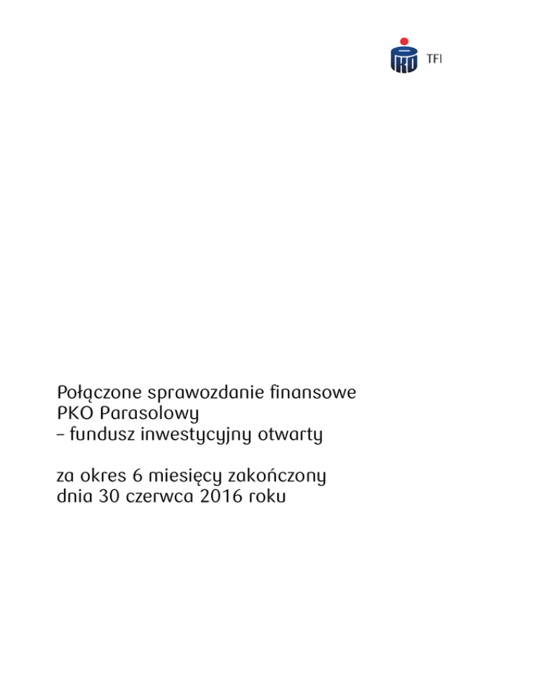 Połączone sprawozdanie finansowe PKO Parasolowy – fundusz inwestycyjny otwarty za okres 6 miesięcy zakończony dnia 30 czerwca 2016 roku LIST TOWARZYSTWA DO UCZESTNIKÓW Szanowni Państwo, Przedstawiamy Państwu Sprawozdanie finansowe PKO Parasolowy – funduszu inwestycyjnego otwartego zarządzanego przez PKO Towarzystwo Funduszy Inwestycyjnych S.A. za okres sprawozdawczy od 1 stycznia 2016 r. do 30 czerwca 2016 r. Sprawozdanie zawiera szczegółowe informacje o strukturze portfela inwestycyjnego oraz opis polityki inwestycyjnej Funduszu. Do Sprawozdania finansowego dołączono raport z przeglądu sprawozdania finansowego przeprowadzonego przez biegłego rewidenta oraz oświadczenie banku depozytariusza. Wartość aktywów netto wszystkich funduszy inwestycyjnych zarządzanych przez PKO TFI wynosiła na koniec czerwca 2016 roku 18,74 mld PLN, co oznacza wzrost aktywów o 1,64% od początku 2016 roku. Udział PKO TFI w grupie funduszy inwestycyjnych rynku kapitałowego na koniec czerwca 2016 roku wyniósł 12,83%, co dało Towarzystwu 2 miejsce pod względem wielkości zarządzanych aktywów. Na 30 czerwca 2016 roku PKO TFI zarządzało 40 funduszami inwestycyjnymi i subfunduszami, w tym 4 publicznymi funduszami inwestycyjnymi zamkniętymi, 6 funduszami inwestycyjnymi zamkniętymi niepublicznymi i 2 funduszami inwestycyjnymi zamkniętymi dedykowanymi. W pierwszym półroczu 2016 roku PKO TFI otrzymało wyróżnienia dla następujących produktów: 1. W styczniu 2016 roku Analizy Online, niezależny ośrodek badawczy na rynku funduszy inwestycyjnych, potwierdził wysoką jakość zarządzania w subfunduszu PKO Akcji Nowa Europa przyznając mu 4 gwiazdki. Ocena ta potwierdza, że to produkt, który warto mieć w portfelu inwestycyjnym. 2. W maju 2016 roku Analizy Online, potwierdziły wysoką jakość zarządzania w funduszu PKO Płynnościowy - sfio przyznając mu 5 gwiazdek. Ocena ta potwierdza, że to produkt oferujący wyjątkowo wysoką jakość. Jego wyniki są istotnie lepsze od tych uzyskiwanych przez konkurentów, przy zachowaniu odpowiedniej relacji zysku do ryzyka. 3. Wyróżnienia dla wybranych subfunduszy z oferty PKO TFI w „Ratingu Funduszy” Forbesa 2016. Cztery subfundusze zarządzane przez PKO Towarzystwo Funduszy Inwestycyjnych SA znalazły się w każdej grupie funduszy ocenianej w zestawieniu – PKO Akcji Małych i Średnich Spółek (1 miejsce na 22 oceniane fundusze w grupie funduszy akcji małych i średnich spółek), PKO Akcji Plus (5 miejsce na 53 oceniane fundusze w grupie funduszy akcji), PKO Zrównoważony (4 miejsce na 32 oceniane fundusze w grupie funduszy zrównoważonych), PKO Strategicznej Alokacji (15 miejsce na 32 oceniane fundusze w grupie funduszy strategicznej alokacji), PKO Stabilnego Wzrostu (5 miejsce na 32 oceniane fundusze w grupie funduszy stabilnego wzrostu). 4. Wyróżnienia „ALFA 2015” dla wybranych subfunduszy PKO TFI SA. Trzy subfundusze zarządzane przez PKO TFI otrzymały wyróżnienia w ramach „ALFA 2015” w tym: PKO Akcji Małych i Średnich Spółek w kategorii funduszy akcji polskich małych i średnich spółek, PKO Akcji Nowa Europa w kategorii funduszy akcji Nowej Europy oraz PKO Strategicznej Alokacji w kategorii fundusze aktywnej alokacji. Nagrody i wyróżnienia dla najlepszych funduszy są przyznawane przez niezależny ośrodek badawczy Analizy Online. Każdy fundusz oceniany był za efektywność, powtarzalność wyników oraz poziom kosztów. Rynek obligacji Pierwsze miesiące 2016 roku były okresem istotnego umocnienia obligacji skarbowych na rynkach bazowych do czego w głównym stopniu przyczyniły się spadki cen akcji i surowców oraz narastające obawy o kondycję wzrostu gospodarczego na świecie w połączeniu z działaniami i komunikatami banków centralnych. Rentowność polskich papierów dłużnych również spadła w pierwszych trzech miesiącach roku, czego głównym powodem był wzrost cen obligacji na rynkach bazowych oraz ekspansywna polityka i retoryka banków centralnych, w szczególności Europejskiego Banku Centralnego, FED i Banku Japonii. Niewątpliwie pozytywny wpływ na wyceny polskich obligacji miał niski wskaźnik inflacji CPI oraz pozytywna projekcja inflacji. Przez większość drugiego kwartału 2016 roku obligacje skarbowe rynków bazowych pozostawały w trendzie bocznym przy niewielkiej zmianie (+/- 15 pb). Z początkiem czerwca zaczęły narastać obawy o wynik referendum w Wielkiej Brytanii dotyczącego wyjścia lub pozostania w Unii Europejskiej. Po negatywnym wyniku referendum (Brexit) mieliśmy do czynienia ze znacznym wzrostem awersji do ryzyka, którego rezultatem było osiągnięcie przez obligacje niemieckie i amerykańskie historycznych minimów rentowności, odpowiednio prawie -0,2% oraz 1,40%. Biorąc pod uwagę słabszą kondycję gospodarki amerykańskiej w ostatnich miesiącach oraz fakt, że Brexit może implikować spowolnienie wzrostu gospodarczego na świecie, FED obniżył oczekiwaną prognozę zmian stóp procentowych w przyszłości, a rynek zaczął nawet wyceniać obniżkę stóp procentowych w Stanach Zjednoczonych. Ze względu na wspomniane powyżej globalne ryzyko oraz czynniki lokalne, polskie obligacje skarbowe w drugim kwartale bieżącego roku doświadczały systematycznego wzrostu rentowności osiągając najwyższy spread do niemieckich papierów dłużnych od 2012 roku (330pb). Na przestrzeni drugiego kwartału rentowności krajowych obligacji skarbowych zmieniły się nieznacznie, a ich wzrost w przypadku papierów 2,5 i 10 letnich wyniósł odpowiednio około 20, 5 i 10 punktów bazowych. Na koniec kwartału rentowność powyższych obligacji wyniosła odpowiednio około 1,65%, 2,25% oraz 2,90%. Pomimo wzrostu niepewności na świecie należy odnotować, że polskie papiery dłużne są cały czas beneficjentem ekspansywnej polityki i retoryki banków centralnych. Ponadto sprzyjająco na krajowe obligacje wpływały niektóre czynniki lokaln