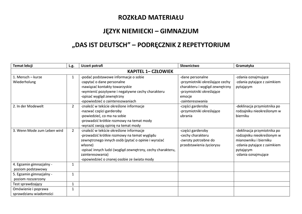 ROZKŁAD MATERIAŁU JĘZYK NIEMIECKI – GIMNAZJUM „DAS IST DEUTSCH” – PODRĘCZNIK Z REPETYTORIUM Temat lekcji L.g. Uczeń potrafi Słownictwo Gramatyka -dane personalne -przymiotniki określające cechy charakteru i wygląd zewnętrzny -przymiotniki określające emocje -zainteresowania -części garderoby -przymiotniki określające ubrania -zdania oznajmujące -zdania pytające z zaimkiem pytającym -części garderoby -cechy charakteru -zwroty potrzebne do przedstawienia życiorysu -deklinacja przymiotnika po rodzajniku nieokreślonym w mianowniku i bierniku -zdania pytające z zaimkiem pytającym -zdania oznajmujące KAPITEL 1– CZŁOWIEK 1. Mensch – kurze Wiederholung 1 2. In der Modewelt 2 3. Wenn Mode zum Leben wird 2 4. Egzamin gimnazjalny poziom podstawowy 5. Egzamin gimnazjalny poziom rozszerzony Test sprawdzający Omówienie i poprawa sprawdzianu wiadomości 1 1 1 1 -podać podstawowe informacje o sobie -zapytać o dane personalne -nawiązać kontakty towarzyskie -wymienić pozytywne i negatywne cechy charakteru -opisać wygląd zewnętrzny -opowiedzieć o zainteresowaniach -znaleźć w tekście określone informacje -nazwać części garderoby -powiedzieć, co ma na sobie -prowadzić krótkie rozmowy na temat mody -wyrazić swoją opinię na temat mody -znaleźć w tekście określone informacje -prowadzić krótkie rozmowy na temat wyglądu zewnętrznego innych osób (pytać o opinie i wyrażać własne) -opisać innych ludzi (wygląd zewnętrzny, cechy charakteru, zainteresowania) -opowiedzieć o znanej osobie ze świata mody -deklinacja przymiotnika po rodzajniku nieokreślonym w bierniku KAPITEL 2 – DOM 1. Zu Hause – kurze Wiederholung 1 2. Mein Traum – ein neues Haus 2 3. Ungewöhnlich wohnen 2 4. Egzamin gimnazjalny poziom podstawowy 5. Egzamin gimnazjalny poziom rozszerzony Test sprawdzający Omówienie i poprawa sprawdzianu wiadomości 1 1. Schule – kurze Wiederholung 1 -zapytać rozmówcę o miejsce zamieszkania -podać swój adres zamieszkania -nazwać pomieszczenia mieszkalne -nazwać wyposażenie pomieszczeń mieszkalnych -określić ustawienie mebli -opisać dom lub mieszkanie -opisać swój pokój -podać miejsce zamieszkania (okolica) -zapytać rozmówcę o miejsce zamieszkania -opowiedzieć o swojej okolicy -prowadzić krótkie rozmowy na temat miejsc zamieszkania -wymienić wady i zalety życia na wsi oraz w mieście -opowiedzieć o najwyższym budynku świata -znaleźć określone informacje w tekście -wymienić atrakcje turystyczne najwyższego budynku świata -podać nazwy miast, w których znajdują się znane budowle -dane adresowe -nazwy budynków mieszkalnych -nazwy pomieszczeń mieszkalnych -meble i wyposażenie domu lub mieszkania -nazwy miejsc zamieszkania -opis okolicy zamieszkania -przymiotniki opisujące sąsiadów -nazwy budynków mieszkalnych -zwroty określające położenie budynku mieszkalnego -opis najwyższego budynku świata -nazwy wybranych atrakcji turystycznych -synonimy -liczba mnoga rzeczowników -przyimki z celownikiem lub biernikiem -rodzajnik nieokreślony i określony w mianowniku -przeczenie kein i nicht w zdaniu -zaimki osobowe w mianowniku -deklinacja przymiotnika w celowniku -rekcja wybranych czasowników -liczba mnoga rzeczowników 1 1 1 KAPITEL 3 – SZKOŁA -wymienić rodzaje szkół w Polsce i Niemczech -opisać plan lekcji -wyrazić pozytywną i negatywną opinię na temat wybranych przedmiotów szkolnych -pytać o opinie innych -opowiedzieć, co robi na lekcji -wymienić pozytywne i negatywne cechy charakteru nauczycieli -wymienić przybory szkolne -nazwy szkół -przedmioty szkolne -pozytywne i negatywne opinie na temat wybranych przedmiotów szkolnych -zwroty opisujące czynności uczniów na lekcji -cechy charakteru nauczycieli -przybory szkolne -liczebniki główne - koniugacja czasownika - rodzajniki nieokreślone i określone w mianowniku i bierniku - przeczenie kein w mianowniku i bierniku 2. Lehrer – anders, als man denkt 2 3. Schule – Pflicht oder Vergnügen? 2 4. Egzamin gimnazjalny poziom podstawowy 5. Egzamin gimnazjalny poziom rozszerzony Test sprawdzający Omówienie i poprawa sprawdzianu wiadomości 1 -określić główną myśl poszczególnych części tekstu -znaleźć określone informacje w tekście -przeprowadzić wywiad ze swoim nauczycielem na temat jego lat szkolnych oraz zainteresowań -określić poziom opanowania języków obcych -zapytać rozmówcę o przedmioty szkolne, które lubi i których nie lubi -opowiedzieć życiorys swój i innych osób -określić główną myśl poszczególnych części tekstu -znaleźć w tekście określone informacje -słownictwo związane ze szkołą -zwroty pozwalające przeprowadzić wywiad na temat życia szkolnego -zwroty określające pozytywne i negatywne opinie na temat przedmiotów szkolnych -słownictwo pozwalające opisać lub opowiedzieć życiorys -słownictwo opisujące sytuację uczniów w Afryce -zdania z bezokolicznikiem z zu i bez zu -zdania pytające z zaimkiem pytającym -nazwy zawodów -czynności zawodowe -przymiotniki określające słabe i mocne strony pracownika -czasowniki modalne w czasie teraźniejszym Präsens -regularne stopniowanie przymiotnika -zwroty potrzebne do przeprowadzenia rozmowy kwalifikacyjnej -wyrażenia określające dobre warunki nauki i pracy -zwroty potrzebne w dyskusji: wyrażanie własnego zdania, niezgadzanie się z argumentami strony przeciwnej, zgadzanie się z argumentami strony przeciwnej -strona bierna określająca stan (Zustandspassiv) -czas przeszły Perfekt 1 1 1 KAPITEL 4 – PRACA 1. Arbeit – kurze Wiederholung 1 2. Das erste Vorstellungsgespräch – Tipps 2 3. Schule oder Job? Eine wichtige Entscheidung! 2 -opowiedzieć o wybranych zawodach -prowadzić krótkie dialogi na temat czynności w określonych zawodach -określić miejsca, w których pracują różne grupy zawodowe -opisać słabe i mocne strony pracownika -pytać o czynności zawodowe -poinformować o zawodach wyko