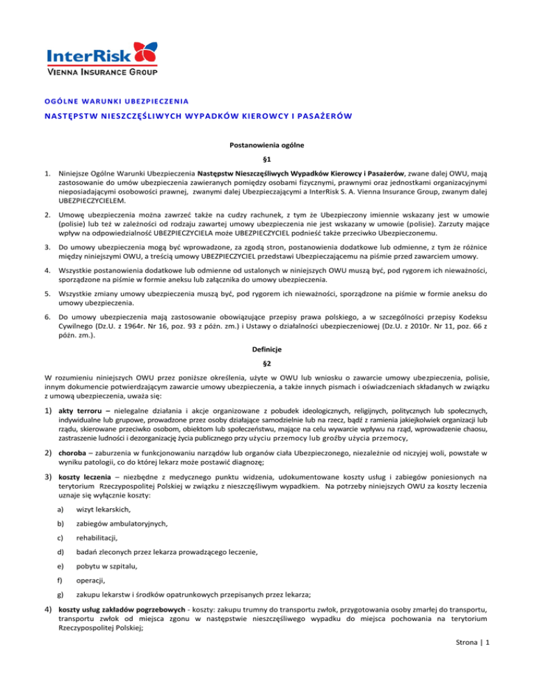 O GÓ L N E WA RU N K I U BE Z P I E C Z E N I A N ASTĘPSTW N IESZCZĘŚLIWYCH WYPADKÓW KIER OWCY I PASAŻER ÓW Postanowienia ogólne §1 1. Niniejsze Ogólne Warunki Ubezpieczenia Następstw Nieszczęśliwych Wypadków Kierowcy i Pasażerów, zwane dalej OWU, mają zastosowanie do umów ubezpieczenia zawieranych pomiędzy osobami fizycznymi, prawnymi oraz jednostkami organizacyjnymi nieposiadającymi osobowości prawnej, zwanymi dalej Ubezpieczającymi a InterRisk S. A. Vienna Insurance Group, zwanym dalej UBEZPIECZYCIELEM. 2. Umowę ubezpieczenia można zawrzeć także na cudzy rachunek, z tym że Ubezpieczony imiennie wskazany jest w umowie (polisie) lub też w zależności od rodzaju zawartej umowy ubezpieczenia nie jest wskazany w umowie (polisie). Zarzuty mające wpływ na odpowiedzialność UBEZPIECZYCIELA może UBEZPIECZYCIEL podnieść także przeciwko Ubezpieczonemu. 3. Do umowy ubezpieczenia mogą być wprowadzone, za zgodą stron, postanowienia dodatkowe lub odmienne, z tym że różnice między niniejszymi OWU, a treścią umowy UBEZPIECZYCIEL przedstawi Ubezpieczającemu na piśmie przed zawarciem umowy. 4. Wszystkie postanowienia dodatkowe lub odmienne od ustalonych w niniejszych OWU muszą być, pod rygorem ich nieważności, sporządzone na piśmie w formie aneksu lub załącznika do umowy ubezpieczenia. 5. Wszystkie zmiany umowy ubezpieczenia muszą być, pod rygorem ich nieważności, sporządzone na piśmie w formie aneksu do umowy ubezpieczenia. 6. Do umowy ubezpieczenia mają zastosowanie obowiązujące przepisy prawa polskiego, a w szczególności przepisy Kodeksu Cywilnego (Dz.U. z 1964r. Nr 16, poz. 93 z póżn. zm.) i Ustawy o działalności ubezpieczeniowej (Dz.U. z 2010r. Nr 11, poz. 66 z póżn. zm.). Definicje §2 W rozumieniu niniejszych OWU przez poniższe określenia, użyte w OWU lub wniosku o zawarcie umowy ubezpieczenia, polisie, innym dokumencie potwierdzającym zawarcie umowy ubezpieczenia, a także innych pismach i oświadczeniach składanych w związku z umową ubezpieczenia, uważa się: 1) akty terroru – nielegalne działania i akcje organizowane z pobudek ideologicznych, religijnych, politycznych lub społecznych, indywidualne lub grupowe, prowadzone przez osoby działające samodzielnie lub na rzecz, bądź z ramienia jakiejkolwiek organizacji lub rządu, skierowane przeciwko osobom, obiektom lub społeczeństwu, mające na celu wywarcie wpływu na rząd, wprowadzenie chaosu, zastraszenie ludności i dezorganizację życia publicznego przy użyciu przemocy lub groźby użycia przemocy, 2) choroba – zaburzenia w funkcjonowaniu narządów lub organów ciała Ubezpieczonego, niezależnie od niczyjej woli, powstałe w wyniku patologii, co do której lekarz może postawić diagnozę; 3) koszty leczenia – niezbędne z medycznego punktu widzenia, udokumentowane koszty usług i zabiegów poniesionych na terytorium Rzeczypospolitej Polskiej w związku z nieszczęśliwym wypadkiem. Na potrzeby niniejszych OWU za koszty leczenia uznaje się wyłącznie koszty: a) wizyt lekarskich, b) zabiegów ambulatoryjnych, c) rehabilitacji, d) badań zleconych przez lekarza prowadzącego leczenie, e) pobytu w szpitalu, f) operacji, g) zakupu lekarstw i środków opatrunkowych przepisanych przez lekarza; 4) koszty usług zakładów pogrzebowych - koszty: zakupu trumny do transportu zwłok, przygotowania osoby zmarłej do transportu, transportu zwłok od miejsca zgonu w następstwie nieszczęśliwego wypadku do miejsca pochowania na terytorium Rzeczypospolitej Polskiej; Strona | 1 5) lekarz – osoba posiadająca odpowiednie, formalnie potwierdzone kwalifikacje zgodnie z wymogami prawa, wykonująca zawód w zakresie swoich uprawnień i kwalifikacji, niebędąca Ubezpieczającym, Ubezpieczonym lub osobą bliską dla Ubezpieczonego; 6) lekarz zaufania – lekarz medycyny lub stomatologii, z którym UBEZPIECZYCIEL zawarł umowę o współpracy w zakresie oceny stanu zdrowia i podjętego leczenia. Lekarz zaufania będący osobą bliską dla Ubezpieczonego nie może dokonywać dla potrzeb UBEZPIECZYCIELA oceny stanu zdrowia i podjętego leczenia; 7) materiały wybuchowe – substancje chemiczne stałe lub ciekłe albo mieszaniny substancji zdolne do reakcji chemicznej z wytwarzaniem gazu o takiej temperaturze i ciśnieniu i z taką szybkością, że mogą powodować zniszczenia w otaczającym środowisku, a także wyroby wypełnione materiałem wybuchowym, w rozumieniu ustawy z dnia 22 czerwca 2001 r. o wykonywaniu działalności gospodarczej w zakresie wytwarzania i obrotu materiałami wybuchowymi, bronią, amunicją oraz wyrobami i technologią o przeznaczeniu wojskowym i policyjnym, a także ustawy z dnia 21 czerwca 2002 r. o materiałach wybuchowych przeznaczonych do użytku cywilnego; 8) naprawa pojazdu – czynności, jakie wykonuje Ubezpieczony podczas postoju pojazdu, związane z uszkodzeniem pojazdu, unieruchomieniem pojazdu lub wypadkiem drogowym, mające na celu kontrolę stanu technicznego pojazdu lub usunięcie przyczyny unieruchomienia lub uszkodzenia; 9) nieszczęśliwy wypadek – nagłe zdarzenie mające miejsce w trakcie trwania ochrony ubezpieczeniowej, wywołane przyczyną zewnętrzną, na skutek którego Ubezpieczony niezależnie od swej woli doznał uszkodzenia ciała, rozstroju zdrowia lub zmarł. W przypadku Ubezpieczonego będącego kierowcą pojazdu, za zapłatą dodatkowej składki, za nieszczęśliwy wypadek uważa się również zawał serca lub udar mózgu; 10) ocena ryzyka – procedura ustalona i stosowana przez UBEZPIECZYCIELA przy obejmowaniu ochroną ubezpieczeniową osoby fizycznej lub grupy osób, mająca wpływ na wysokość składki i zakres ochrony ubezpieczeniowej, uwzględniająca w szczególności: wysokość sumy ubezpieczenia, rodzaj pojazdu, okres ubezpieczenia, liczbę miejsc pasażerskich określoną w dowodzie rejestracyjnym pojazdu; 11) ochrona ubezpieczeniowa – zobowiązanie UBEZPIECZYCIELA do wypłaty świadczeni