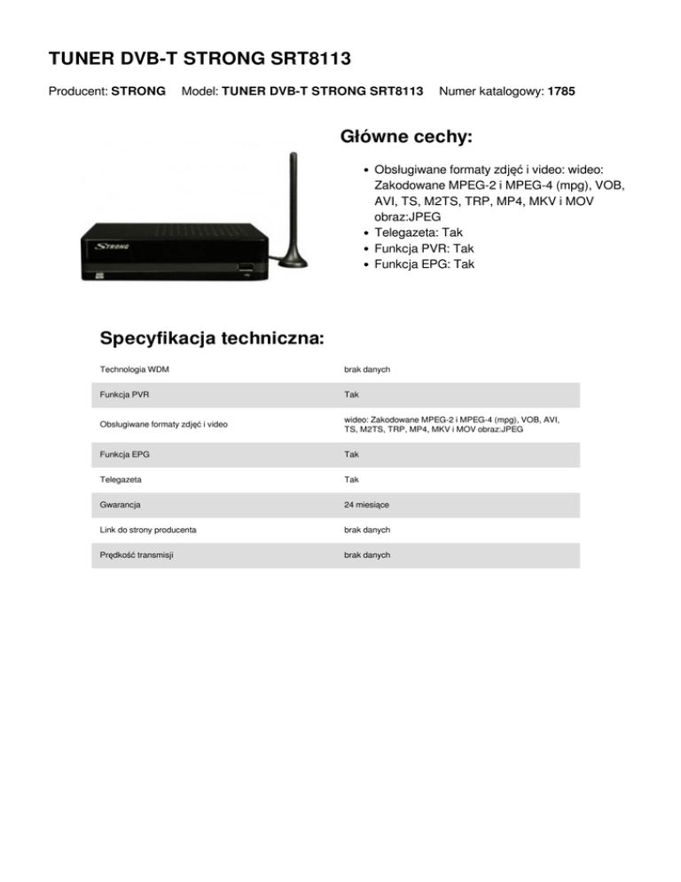 TUNER DVB-T STRONG SRT8113 Główne cechy