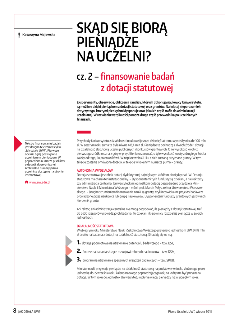 ííKatarzyna Majewska Skąd się biorą pieniądze na uczelni? cz. 2 – finansowanie badań z dotacji statutowej Eksperymenty, obserwacje, obliczenia i analizy, których dokonują naukowcy Uniwersytetu, są możliwe dzięki pieniądzom z dotacji statutowej oraz grantów. Najwięcej nieporozumień dotyczy tego, kto tymi pieniędzmi dysponuje oraz jaka ich część trafia do administracji uczelnianej. W rozwianiu wątpliwości pomoże druga część przewodnika po uczelnianych finansach. Tekst o finansowaniu badań jest drugim tekstem w cyklu „Jak działa UW?”. Pierwsze odcinki będą poświęcone uczelnianym pieniądzom. W poprzednim numerze pisaliśmy o dotacji algorytmicznej. Archiwalne numery pisma uczelni są dostępne na stronie internetowej. Á Á www.uw.edu.pl Przychody Uniwersytetu z działalności naukowej jeszcze dziewięć lat temu wynosiły niecałe 100 mln zł. W zeszłym roku suma ta była równa 413,4 mln zł. Pieniądze te pochodzą z dwóch źródeł: dotacji na działalność statutową uczelni publicznych i konkursów grantowych. O ile wysokość kwoty z pierwszego źródła można z góry w przybliżeniu oszacować, o tyle wysokość kwoty z drugiego źródła zależy od tego, ilu pracowników UW napisze wnioski i ilu z nich zostaną przyznane granty. W tym tekście zostanie omówiona dotacja, w tekście w kolejnym numerze pisma – granty. AUTONOMIA WYDZIAŁÓW Dotacja statutowa jest obok dotacji dydaktycznej największym źródłem pieniędzy na UW. Dotacja statutowa ma charakter instytucjonalny. – Dysponentami tych funduszy są dziekani, a nie rektorzy czy administracja centralna. Uniwersyteckim jednostkom dotację bezpośrednio przydziela Ministerstwo Nauki i Szkolnictwa Wyższego – mówi prof. Marcin Pałys, rektor Uniwersytetu Warszawskiego. – Drugim strumieniem finansowania nauki są granty, czyli indywidualne projekty badawcze prowadzone przez naukowca lub grupę naukowców. Dysponentem funduszy grantowych jest w nich kierownik grantu. Ani rektor, ani administracja centralna nie mogą decydować, ile pieniędzy z dotacji statutowej trafi do osób i zespołów prowadzących badania. To dziekani i kierownicy rozdzielają pieniądze w swoich jednostkach. DZIAŁALNOŚĆ STATUTOWA W ubiegłym roku Ministerstwo Nauki i Szkolnictwa Wyższego przyznało jednostkom UW 241,8 mln zł brutto na badania z dotacji na działalność statutową. Składają się na nią: 1. dotacja podmiotowa na utrzymanie potencjału badawczego – tzw. BST, 2. finanse na badania służące rozwojowi młodych naukowców – tzw. DSM, 3. program na utrzymanie specjalnych urządzeń badawczych – tzw. SPUB. Minister nauki przyznaje pieniądze na działalność statutową na podstawie wniosku złożonego przez jednostkę do 15 września roku kalendarzowego poprzedzającego rok, na który ma być przyznana dotacja. W tym roku do jednostek Uniwersytetu wpłynie więcej pieniędzy niż w ubiegłym roku. 8 JAK DZIAŁA UW? Pismo Uczelni „UW”, wiosna 2015 W sumie Uniwersytet Warszawski w 2014 r. otrzymał z ministerstwa nauki 241,8 mln zł dotacji statutowej 13,2% BST – 32,0 mln zł 2,4% DSM – 5,8 mln zł 84,4% SPUB – 204,0 mln zł 1. DOTACJA PODMIOTOWA NA UTRZYMANIE POTENCJAŁU BADAWCZEGO To, jakie koszty mogą być poniesione z dotacji podmiotowej na utrzymanie potencjału badawczego (tzw. BST) precyzują: ustawa z 30 kwietnia 2010 r. o zasadach finansowania nauki oraz rozporządzenie ministra nauki z 18 grudnia 2014 r. Dotacja ta obejmuje: ›› działania niezbędne do rozwoju specjalności naukowych lub kierunków badawczych oraz rozwoju kadry naukowej, w tym badania naukowe lub prace rozwojowe ujęte w planie finansowym jednostek naukowych, ›› utrzymanie infrastruktury badawczej, w tym bibliotek i archiwów, ›› koszty związane z zatrudnieniem niezbędnej kadry naukowej i inżynieryjno-technicznej, ›› zakup lub wytworzenie aparatury naukowo-badawczej związanej z prowadzeniem zadań, niestanowiącej dużej infrastruktury badawczej, ›› współpracę naukową krajową i zagraniczną niezbędną do realizacji zadań, ryczałtową. Wydziały mogą ją swobodnie inwestować w zakup aparatury i odczynników czy wynagrodzenia dla pracowników inżynieryjno-technicznych i naukowo-technicznych (wynagrodzenia dla pracowników naukowych i dydaktycznych finansuje się z dotacji podstawowej, nazywanej też dotacją dydaktyczną). Nie ma żadnych wytycznych ze strony władz rektorskich co do dysponowania tymi pieniędzmi. BST może być wykorzystana na zakup aparatury niestanowiącej dużej infrastruktury badawczej. Nie trzeba jej wydawać od razu. Wydział może odkładać pieniądze i gdy uzbiera większą sumę, kupić sprzęt. Pieniądze te trzeba wydać w cyklu dwuletnim. Zasady przydzielania BST na UW Każda z jednostek ustala własny regulamin przyznania środków oraz cele, na które można przeznaczyć pieniądze z BST. I tak na przykład na Wydziale Psychologii dotacja BST może być wykorzystana wyłącznie na finansowanie lub dofinansowanie: ›› kosztów prowadzenia badań i prac rozwojowych oraz na cele wydawnicze, zakup aparatury lub wytwarzania aparatury specjalnej, publikacje naukowe, zakupy biblioteczne, organizację konferencji, ›› współpracy naukowej z zagranicą, ›› działalność jednostki naukowej w zakresie upowszechniania nauki. Wysokość dotacji BST wylicza ministerstwo za pomocą wzoru, który znajduje się w załączniku do rozporządzenia ministra nauki z 18 grudnia 2014 r. Jeszcze kilka lat temu dotacja ta była praktycznie stała i zależała m.in. od tzw. stałej przeniesienia, czyli kwoty przeniesionej z poprzedniego roku. Od 2015 r. poszczególne jednostki dostają dotację BST w zależności od oceny parametrycznej, która obrazuje potencjał jednostki i jakość prowadzonych przez nią badań (czyli kategorii naukowej przyznawanej przez Komitet Ewaluacji Jednostek Naukowych co cztery lata, najwyższą oceną jest A+). – 