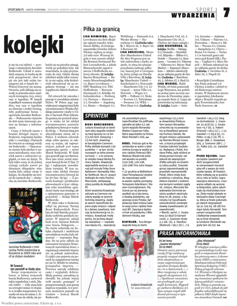 SPORT.WM.PL GAZETA SPORTOWA BEZPŁATNY DODATEK GAZETY OLSZTYŃSKIEJ I DZIENNIKA ELBLĄSKIEGO kolejki je mi się coś zdobyć — przyznaje z uśmiechem Jarosław Rutkowski. Udział w zawodach oznacza, że trzeba się do nich przygotować, choć to już nie jest taki reżim treningowy jak w latach 80. — Więcej trenować nie muszę. Owszem, jeśli zbliżają się zawody, to potrzeba nieco częstszych treningów, trzy, cztery razy w tygodniu. W innych wypadkach wystarczy mi pójść dwa, trzy razy w tygodniu na siłownię i zrobić trening, żeby podtrzymać formę — opowiada Jarosław Rutkowski. — Podnoszenie ciężarów do dziś mnie interesuje, jestem na bieżąco z informacjami. Czasy, w których razem z braćmi dźwigał ciężary w Srokowie, wspomina bardzo mile i z nostalgią. Chętnych do ćwiczeń ze sztangą wtedy nie brakowało. — Opuszczane ciężary było słychać w naszym mieszkaniu, więc człowiek nawet z ciekawości zaglądał, co tam się dzieje. To były takie czasy, że do jednej sztangi czekało nawet po dziesięciu chłopaków, więc trzeba było odstać swoje w kolejce. Aż chciałoby się wrócić do tamtych dni — uśmiecha się Jarosław Rutkowski. Jarosław Rutkowski z mistrzostw Polski mastersów w Koszalinie w 2009 roku wrócił ze złotym medalem W Szwecji syn poszedł w ślady ojca Swoje wspomnienie siłowni, w której trenowali bracia Rutkowscy, zachował także najmłodszy z nich, Marek (1968). — Gdy zimą było na zewnątrz minus 15 stopni, to w środku temperatura wynosiła od zera do minus 5. Jeśli idąc rano do szkoły, nie po- łożyło się na piecyku sztangi, wtedy po południu była tak zmarznięta, że ręka przymarzała do niej. Gdyby dzisiaj młodzież miała takie warunki, to nie sądzę, żeby ktokolwiek zdecydował się na regularne treningi — nie ma wątpliwości Marek Rutkowski. Od czterech lat mieszka i pracuje w szwedzkim mieście Nybro. W Polsce jego największymi osiągnięciami było wicemistrzostwo Wojska Polskiego juniorów i starty w I lidze w barwach Floty Gdynia. Za granicą nie porzucił sztangi: w wieku 43 lat zdobył wicemistrzostwo seniorów południowej Szwecji w wadze do 69 kg. — Poziom tutaj jest zdecydowanie niższy niż w Polsce. Z wiekiem człowiek zdaje sobie sprawę, że sukcesy są ważne, ale najważniejsze jednak jest samo uprawianie sportu — mówi Marek Rutkowski. W ślady ojca poszedł jego syn Bartosz. Dwa lata temu został mistrzem Szwecji do lat 17 (kat. 77 kg) i najlepszym zawodnikiem turnieju. W tym samym roku zdobył również wicemistrzostwo Szwecji do lat 20 (kat. 69 kg). — Z powodu kontuzji i problemów zdrowotnych w tym i ubiegłym roku musieliśmy ograniczyć starty oraz treningi, ale z optymizmem patrzymy w przyszłość — dodaje Marek Rutkowski. W 1994 roku w Srokowie odbył się pierwszy Turniej Braci Rutkowskich. Przez lata do hali Śnieżka przyjeżdżała czołówka polskich ciężarów. W imprezie udział brali m.in. Szymon Kołecki oraz bracia Dołęgowie. — Do startu ustawiała się kolejka chętnych i niektórym zawodnikom trzeba było odmawiać — wspomina Bogdan. Do tej pory odbyło się czternaście turniejów firmowanych nazwiskiem braci, z organizacji ostatnich imprez nie są jednak zadowoleni. Co jakiś czas pojawia się pomysł, by zorganizować turniej po raz 15. Byłaby to ostatnia, pożegnalna impreza. — Pierwsze zawody robiliśmy sami i wyglądały dobrze. Miały poziom, zawodnicy je chwalili. Im jednak więcej osób zaczęło „pomagać“ w przygotowaniach, tym gorzej impreza wypadała. A w pewnym momencie popsuło się totalnie — kończy Marek Rutkowski. Wszelkie prawa zastrzeżone. Edytor sp. z o.o. PONIEDZIAŁEK 17.12.12 SPORT WYDARZENIA 7 Piłka za granicą L I G A N I E M I E C K A . Bayer Leverkusen ma dziś oficjalnie ogłosić transfer Arkadiusza Milika, 18-letniego napastnika Górnika Zabrze. Niemcy zapłacą za niego 2,6 mln euro. Wczoraj 10. gola w tym sezonie zdobył dla Borussii Dortmund Robert Lewandowski, a Jakub Błaszczykowski zagrał w meczu z Hoffenheim na… lewej obronie. 17. kolejka: Bayern Monachium — Borussia Moenchengladbach 1:1, Bayer Leverkusen — HSV Hamburg 3:0, TSG Hoffenheim — Borussia Dortmund 1:3, Schalke 04 Gelsenkirchen — Freiburg 1:3, Fortuna — Hanower 2:1, Greuther — Augsburg 1:1, Mainz — Stuttgart 3:1, SPRINTEM BIEGI NARCIARSKIE. Justyna Kowalczyk w świetnym stylu wygrała niedzielny bieg łączony na 15 km (7,5 km tech. klasyczną + 7,5 km tech. dowolną) w kanadyjskim Canmore. Polka zdobyła komplet 130 punktów — w tym 30 bonusowych za lotne premie na trasie — a to oznacza, że została nową liderką Pucharu Świata. Kowalczyk wyprzedziła wczoraj o ponad pół minuty Finkę Anne Kylloenen i Norweżkę Vibeke Skofterud. Na 27. pozycji dobiegła do mety Paulina Maciuszek, zdobywając cztery punkty do klasyfikacji PŚ. Dzień wcześniej Kowalczyk zaliczyła w Canmore nieudany występ w sprincie techniką dowolną. Zajęła w swoim ćwierćfinale dopiero piąte miejsce i odpadła z dalszej rywalizacji, kończąc tę konkurencję na 21. miejscu. Kowalczyk miała pecha, bo jej bieg okazał się najszybszy — uzyskała czas lepszy niż... zwyciężczy- Wolfsburg — Eintracht 0:2, Werder Brema — Nuernberg 1:1. Czołówka tabeli: 1. Bayern 42, 2. Bayer 33, 3.Borussia 30. L I G A A N G I E L S K A . Menedżer Manchesteru United Sir Alex Ferguson jest na tyle zadowolony z kadry zespołu, że zimą nie planuje pozyskania żadnego piłkarza. Inaczej jest w Liverpoolu, który poluje na Davida Villę z Barcelony. 17. kolejka: Manchester United — Sunderland 3:1, Newcastle — Manchester City 1:3, Liverpool — Aston Villa 1:3, Norwich — Wigan 2:1, QPR — Fulham 2:1, Stoke — Everton 1:1, Tottenham — Swansea 1:0, WBA — West Ham 0:0. Czołówka: 1. Manchester Utd. 42, 2. Manchester City 36, 3. Chelsea 29 (mecz zaległy). L I G A H I S Z P A Ń S K A . 16. kolejka: Sevilla — Malaga 0:2, Granada
