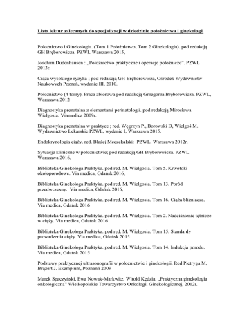 Lista lektur zalecanych do specjalizacji w dziedzinie położnictwa i ginekologii Położnictwo i Ginekologia. (Tom 1 Położnictwo; Tom 2 Ginekologia). pod redakcją GH Bręborowicza. PZWL Warszawa 2015, Joachim Dudenhausen : „Położnictwo praktyczne i operacje położnicze”. PZWL 2013r. Ciąża wysokiego ryzyka ; pod redakcją GH Bręborowicza, Ośrodek Wydawnictw Naukowych Poznań, wydanie III, 2010. Położnictwo (4 tomy). Praca zbiorowa pod redakcją Grzegorza Bręborowicza. PZWL, Warszawa 2012 Diagnostyka prenatalna z elementami perinatologii. pod redakcją Mirosława Wielgosia: Viamedica 2009r. Diagnostyka prenatalna w praktyce ; red. Węgrzyn P., Borowski D, Wielgoś M. Wydawnictwo Lekarskie PZWL, wydanie I, Warszawa 2015. Endokrynologia ciąży. red. Błażej Męczekalski: PZWL, Warszawa 2012r. Sytuacje kliniczne w położnictwie; pod redakcją GH Bręborowicza. PZWL Warszawa 2016, Biblioteka Ginekologa Praktyka. pod red. M. Wielgosia. Tom 5. Krwotoki okołoporodowe. Via medica, Gdańsk 2016, Biblioteka Ginekologa Praktyka. pod red. M. Wielgosia. Tom 13. Poród przedwczesny. Via medica, Gdańsk 2016, Biblioteka Ginekologa Praktyka. pod red. M. Wielgosia. Tom 16. Ciąża bliźniacza. Via medica, Gdańsk 2016 Biblioteka Ginekologa Praktyka. pod red. M. Wielgosia. Tom 2. Nadciśnienie tętnicze w ciąży. Via medica, Gdańsk 2016 Biblioteka Ginekologa Praktyka. pod red. M. Wielgosia. Tom 15. Standardy prowadzenia ciąży. Via medica, Gdańsk 2015 Biblioteka Ginekologa Praktyka. pod red. M. Wielgosia. Tom 14. Indukcja porodu. Via medica, Gdańsk 2015 Podstawy praktycznej ultrasonografii w położnictwie i ginekologii. Red Pietryga M, Brązert J. Exemplum, Poznanń 2009 Marek Spaczyński, Ewa Nowak-Markwitz, Witold Kędzia. „Praktyczna ginekologia onkologiczna” Wielkopolskie Towarzystwo Onkologii Ginekologicznej, 2012r. Janina Markowska i Jarosław Mądry: „Zarys ginekologii onkologicznej”. Termedia 2012r. Piotr Skałba. Endokrynologia ginekologiczna. PZWL, Warszawa 2008 Biblioteka Ginekologa Praktyka. pod red. M. Wielgosia. Tom 11. Zakażenia pochwy. Via medica, Gdańsk 2013, Philip D.Darney, Leon Speroff: „Antykoncepcja Vademecum” Medycyna Praktyczna 2013r. Baggish, Karram: „Atlas chirurgii ginekologicznej i anatomii miednicy” Tom II. Medipage, 2009r. Data aktualizacji: 10.06.2016