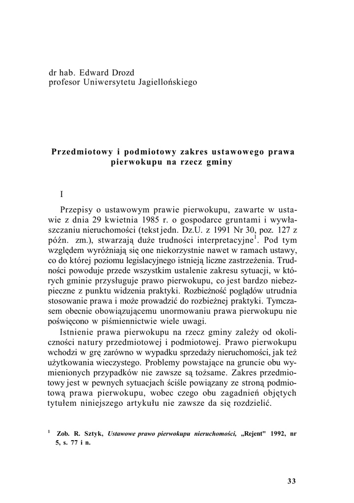 Zob. R. Sztyk, Ustawowe prawo pierwokupu nieruchomości, „Rejent" 1992, nr