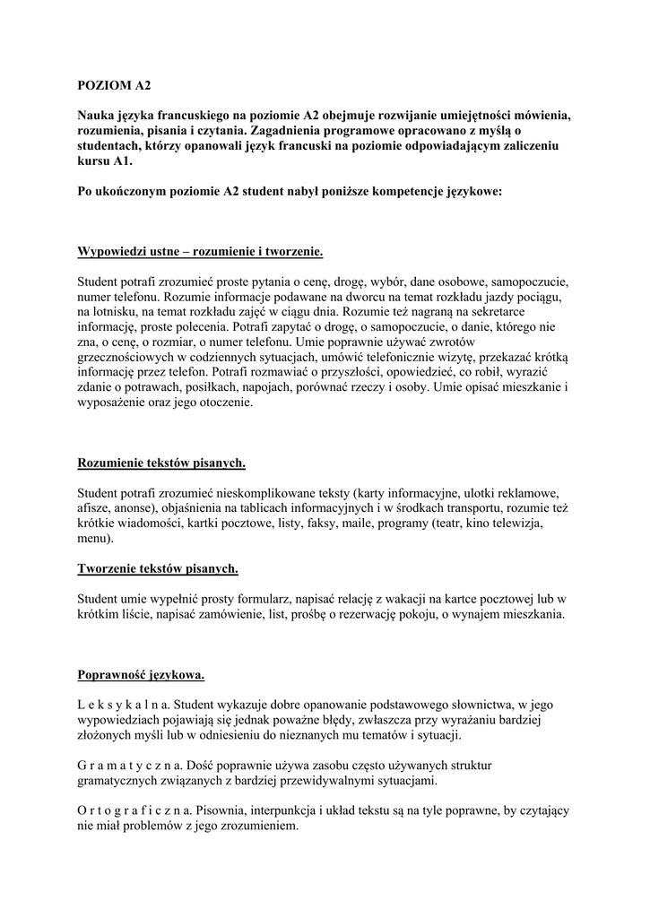 POZIOM A2 Nauka języka francuskiego na poziomie A2 obejmuje rozwijanie umiejętności mówienia, rozumienia, pisania i czytania. Zagadnienia programowe opracowano z myślą o studentach, którzy opanowali język francuski na poziomie odpowiadającym zaliczeniu kursu A1. Po ukończonym poziomie A2 student nabył poniższe kompetencje językowe: Wypowiedzi ustne – rozumienie i tworzenie. Student potrafi zrozumieć proste pytania o cenę, drogę, wybór, dane osobowe, samopoczucie, numer telefonu. Rozumie informacje podawane na dworcu na temat rozkładu jazdy pociągu, na lotnisku, na temat rozkładu zajęć w ciągu dnia. Rozumie też nagraną na sekretarce informację, proste polecenia. Potrafi zapytać o drogę, o samopoczucie, o danie, którego nie zna, o cenę, o rozmiar, o numer telefonu. Umie poprawnie używać zwrotów grzecznościowych w codziennych sytuacjach, umówić telefonicznie wizytę, przekazać krótką informację przez telefon. Potrafi rozmawiać o przyszłości, opowiedzieć, co robił, wyrazić zdanie o potrawach, posiłkach, napojach, porównać rzeczy i osoby. Umie opisać mieszkanie i wyposażenie oraz jego otoczenie. Rozumienie tekstów pisanych. Student potrafi zrozumieć nieskomplikowane teksty (karty informacyjne, ulotki reklamowe, afisze, anonse), objaśnienia na tablicach informacyjnych i w środkach transportu, rozumie też krótkie wiadomości, kartki pocztowe, listy, faksy, maile, programy (teatr, kino telewizja, menu). Tworzenie tekstów pisanych. Student umie wypełnić prosty formularz, napisać relację z wakacji na kartce pocztowej lub w krótkim liście, napisać zamówienie, list, prośbę o rezerwację pokoju, o wynajem mieszkania. Poprawność językowa. L e k s y k a l n a. Student wykazuje dobre opanowanie podstawowego słownictwa, w jego wypowiedziach pojawiają się jednak poważne błędy, zwłaszcza przy wyrażaniu bardziej złożonych myśli lub w odniesieniu do nieznanych mu tematów i sytuacji. G r a m a t y c z n a. Dość poprawnie używa zasobu często używanych struktur gramatycznych związanych z bardziej przewidywalnymi sytuacjami. O r t o g r a f i c z n a. Pisownia, interpunkcja i układ tekstu są na tyle poprawne, by czytający nie miał problemów z jego zrozumieniem. Tematyka. Rozkład dnia, czynności dnia codziennego. Podróż - program podróży i pobytu. Rozrywka – zwiedzanie miasta, wyjście do kina, teatru, na dyskotekę. Mieszkanie – opis mieszkania, pokoju. Posiłki – restauracja. Święta i przyjęcia. Choroba, lekarz, apteka. Zagadnienia gramatyczne. Czas przyszły – futur simple Czas przeszły – passé composé Tryb rozkazujący. Bezokolicznik po czasownikach modalnych i zwrotach przyimkowych. Zaimki osobowe dopełnienia bliższego, dopełnienia dalszego, zaimek przysłówkowy y, en. Zaimki względne qui, que, où Przeczenia ne.. rien, ne...personne, ne...jamais, ne...plus. Wyrażenie przyczyny, celu. Zwroty wyrażające ilość (trochę, dużo, kilka, dość, za dużo) Przymiotnik i jego miejsce w zdaniu. Zagadnienia programowe w nauczaniu języka francuskiego na poziomie A2 opracowano zgodnie z założeniami zawartymi w “Europejskim systemie opisu kształcenia językowego” Rady Europy. Zaliczenie kursu A2 odpowiada nabyciu kompetencji językowych na poziomie A2 skali Rady Europy.