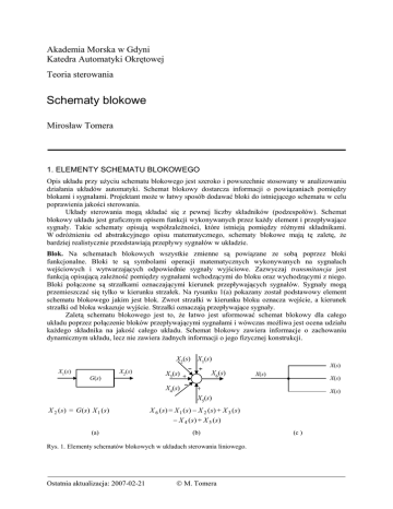 Akademia Morska w Gdyni Katedra Automatyki Okrętowej Teoria sterowania Schematy blokowe Mirosław Tomera 1. ELEMENTY SCHEMATU BLOKOWEGO Opis układu przy użyciu schematu blokowego jest szeroko i powszechnie stosowany w analizowaniu działania układów automatyki. Schemat blokowy dostarcza informacji o powiązaniach pomiędzy blokami i sygnałami. Projektant może w łatwy sposób dodawać bloki do istniejącego schematu w celu poprawienia jakości sterowania. Układy sterowania mogą składać się z pewnej liczby składników (podzespołów). Schemat blokowy układu jest graficznym opisem funkcji wykonywanych przez każdy element i przepływające sygnały. Takie schematy opisują współzależności, które istnieją pomiędzy różnymi składnikami. W odróżnieniu od abstrakcyjnego opisu matematycznego, schematy blokowe mają tę zaletę, że bardziej realistycznie przedstawiają przepływy sygnałów w układzie. Blok. Na schematach blokowych wszystkie zmienne są powiązane ze sobą poprzez bloki funkcjonalne. Bloki te są symbolami operacji matematycznych wykonywanych na sygnałach wejściowych i wytwarzających odpowiednie sygnały wyjściowe. Zazwyczaj transmitancja jest funkcją opisującą zależność pomiędzy sygnałami wchodzącymi do bloku oraz wychodzącymi z niego. Bloki połączone są strzałkami oznaczającymi kierunek przepływających sygnałów. Sygnały mogą przemieszczać się tylko w kierunku strzałek. Na rysunku 1(a) pokazany został podstawowy element schematu blokowego jakim jest blok. Zwrot strzałki w kierunku bloku oznacza wejście, a kierunek strzałki od bloku wskazuje wyjście. Strzałki oznaczają przepływające sygnały. Zaletą schematu blokowego jest to, że łatwo jest uformować schemat blokowy dla całego układu poprzez połączenie bloków przepływającymi sygnałami i wówczas możliwa jest ocena udziału każdego składnika na jakość całego układu. Schemat blokowy zawiera informacje o zachowaniu dynamicznym układu, lecz nie zawiera żadnych informacji o jego fizycznej konstrukcji. X2(s) X1(s) X1(s) G(s) X2(s) X6(s) X3(s) X(s) X(s) X(s) X4(s) X(s) X5(s) X 2 ( s) = G (s ) X 1 ( s ) (a) X 6 ( s) = X 1 ( s ) − X 2 ( s) + X 3 ( s ) − X 4 ( s) + X 5 ( s ) (b) Rys. 1. Elementy schematów blokowych w układach sterowania liniowego. Ostatnia aktualizacja: 2007-02-21 M. Tomera (c ) Teoria sterowania Schematy blokowe Węzeł sumacyjny. Okrąg na schematach blokowych oznacza operację algebraicznego sumowania sygnałów. Znak plus lub minus przy każdej strzałce informuje o tym czy sygnał ten jest dodawany czy też odejmowany. Na schematach blokowych znaku plus może, ale nie musi być zaznaczony. Przy strzałkach przy których nie zaznaczono żadnego znaku to wykonywane jest dodawanie. Dla sygnałów, które mają być odejmowane musi być zawsze zaznaczony znak minus. Na schemacie blokowym węzeł sumacyjny może mieć wiele sygnałów wchodzących, ale tylko jeden wychodzący. Przykład węzła sumacyjnego znajduje się na rysunku 1(b). Węzeł rozgałęźny. Węzeł rozgałęźny (rys. 1c) jest punktem z którego sygnał rozchodzi się do innych bloków lub węzłów sumacyjnych. 2. WYZNACZANIE TRANSMITANCJI WYPADKOWYCH Schematy blokowe są bardzo często upraszczane do prostszych postaci o mniejszej ilości bloków lub przekształcane specjalnych struktur przy użyciu algebry schematów blokowych. Rodzaje przekształceń blokowych zebrane zostały w tabeli 1. Schematy blokowe przedstawiają transformowane przy użyciu przekształcenia Laplace'a równania układu, dlatego też przekształcanie układu jest równoważne algebraicznemu przekształcaniu równań. Ogólnie, przekształcanie schematów jest łatwiejsze niż posługiwanie się bezpośrednio równaniami i dostarcza lepszego wglądu w strukturę fizyczną układu. Dla schematów blokowych z pojedynczym wejściem i wyjściem, redukcja oznacza upraszczanie schematu do postaci w której pozostanie już tylko pojedynczy blok zawierający transmitancję znajdującą się pomiędzy wejściem i wyjściem. W redukcji schematów blokowych, bardzo pomocne jest prowadzenie jej krok po kroku, zawsze utrzymując tą samą zależność pomiędzy wejściem i wyjściem. Zastosowanie przekształceń schematów blokowych zilustrowane zostanie na poniższym przykładzie, w którym przeprowadzona została redukcja schematu blokowego. Tabela 1. Zasady przekształcania schematów blokowych Przekształcenie 1. Połączenie kaskadowe Schemat wyjściowy X1 G1 (s) X2 Schemat równoważny X3 G2 (s) X1 G1G2 X3 lub X1 2. Połączenie równoległe X1 G1(s) X1 X2 G2G1 G1+G2 X3 X2 G2(s) 3. Eliminowanie pętli sprzężenia X1 X2 G X1 G 1 + GH X3 H 4. Przeniesienie węzła sumacyjnego z wejścia na wyjście bloku Ostatnia aktualizacja: 2007-02-21 X1 G X2 M. Tomera X3 X1 G X3 G X2 2 Teoria sterowania Schematy blokowe c.d. tabeli 1. Przekształcenie Schemat wyjściowy X1 5. Przeniesienie węzła sumacyjnego z wyjścia na wejście bloku Schemat równoważny X3 G X1 G X1 7. Przeniesienie węzła rozgałęźnego z wejścia na wyjście bloku X1 8. Zamiana miejscami węzłów sumacyjnych sąsiadujących ze sobą X2 G X1 X2 G X2 1 G X2 6. Przeniesienie węzła rozgałęźnego z wyjścia na wejście bloku X3 X2 X2 G G X1 X1 G X1 X1 X2 X2 1 G Y1 X1 Y1 X3 X2 X3 X1 X1 X2 9. Zamiana miejscami węzłów rozgałęźnych sąsiadujących ze sobą X1 X1 X1 X1 X1 X1 10. Zamiana miejscami węzła sumacyjnego i rozgałęźnego X1 Y1 Y1 X2 X1 Y1 X1 X2 Y1 X1 X1 Ostatnia aktualizacja: 2007-02-21 Y1 Y1 X2 11. Zamiana miejscami węzła rozgałęźnego i sumacyjnego X1 M. Tomera X2 3 Teoria sterowania Schematy blokowe Przykład 1 Schemat blokowy składający się z wielu pętli pokazany został na rysunku 1.1. Istotne jest zwrócenie uwagi na to, że sygnał H 1 ( s )Y ( s ) jest sygnałem sprzężenia dodatniego, natomiast pętla G3 ( s )G 4 ( s) H 1 ( s ) nazywana jest pętlą dodatniego sprzężenia zwrotnego. Procedura przekszta
