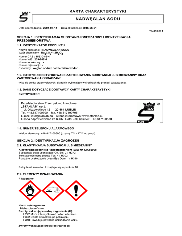 KARTA CHARAKTERYSTYKI NADWĘGLAN SODU Data sporządzenia: 2004-07-14 Data aktualizacji: 2015-06-01 Wydanie: 4 SEKCJA 1. IDENTYFIKACJA SUBSTANCJI/MIESZANINY I IDENTYFIKACJA PRZEDSIĘBIORSTWA 1.1. IDENTYFIKATOR PRODUKTU Nazwa substancji : NADWĘGLAN SODU Wzór chemiczny : Na2CO3•1,5H2O2 Numer CAS : 15630-89-4 Numer WE : 239-707-6 Numer indeksowy : Numer rejestracji : Synonimy : węglan sodu z nadtlenkiem wodoru 1.2. ISTOTNE ZIDENTYFIKOWANE ZASTOSOWANIA SUBSTANCJI LUB MIESZANINY ORAZ ZASTOSOWANIA ODRADZANE tylko do celów przemysłowych, składnik wybielający w środkach do prania i czyszczenia. 1.3. DANE DOTYCZĄCE DOSTAWCY KARTY CHARAKTERYSTYKI DYSTRYBUTOR: Przedsiębiorstwo Przemysłowo Handlowe „STANLAB” sp. j. ul. Olszewskiego 12 20-481 LUBLIN Tel. +48.817100700 fax. +48.817100705 E-mail: [email protected] strona internetowa: www.stanlab.eu Osoba odpowiedzialna za K.Ch.: Rafał Jakubski tel.: +48.817100570 1.4. NUMER TELEFONU ALARMOWEGO telefon alarmowy: +48.817100500 (czynny 700 - 1700 od pn-pt) SEKCJA 2. IDENTYFIKACJA ZAGROŻEŃ 2.1. KLASYFIKACJA SUBSTANCJI LUB MIESZANINY Klasyfikacja zgodnie z Rozporządzeniem (WE) Nr 1272/2008 Substancja stała utleniająca (Ox. Sol. 2); H272 Toksyczność ostra (Acute Tox. 4); H302 Poważne uszkodzenie oczu (Eye Dam. 1); H318 Pełny tekst zwrotów H znajduje się w punkcie 16. 2.2. ELEMENTY OZNAKOWANIA Piktogramy Hasło ostrzegawcze Niebezpieczeństwo Zwroty wskazujące rodzaj zagrożenia (H): H272 Może intensyfikować pożar; utleniacz. H302 Działa szkodliwie po połknięciu. H318 Powoduje poważne uszkodzenie oczu. Zwroty wskazujące środki ostrożności: P210 Przechowywać z dala od źródeł ciepła, gorących powierzchni, iskrzenia, otwartego ognia i innych źródeł zapłonu. Palenie wzbronione. P220 Trzymać/przechowywać z dala od odzieży/materiałów zapalnych. P280 Stosować rękawice ochronne/odzież ochronną/ochronę oczu/ochronę twarzy. P401 Przechowywać w suchym miejscu, w temperaturze nieprzekraczającej 40°C 2.3. INNE ZAGROŻENIA Brak dalszych danych. SEKCJA 3. SKŁAD/INFORMACJA O SKŁADNIKACH 3.1. SUBSTANCJE Nazwa chemiczna Numer CAS Numer WE Numer indeksowy Nadwęglan sodu >85% 15630-89-4 239-707-6 - Węglan sodu <18% 011-005-00-2 497-19-8 208-838-8 SEKCJA 4. ŚRODKI PIERWSZEJ POMOCY 4.1. OPIS ŚRODKÓW PIERWSZEJ POMOCY - Kontakt z oczami : Przemyć oczy dużą ilością wody przez około 15 minut przy szeroko odchylonej powiece. Jeżeli istnieje konieczność wezwać lekarza. - Kontakt ze skórą : Zdjąć zanieczyszczone ubranie, zmyć skórę dużą ilością wody z mydłem. Jeżeli obrażenia są rozległe zasięgnąć porady lekarza. - Wdychanie : Wyprowadzić poszkodowanego z miejsca narażenia, zapewnić dostęp świeżego powietrza. Jeżeli trudności w oddychaniu utrzymują się zapewnić pomoc medyczną. - Połknięcie : W razie przypadkowego połknięcia podać do picia dużą ilość wody około 0,5 l, nie wywoływać wymiotów. Wezwać lekarza. 4.2. NAJWAŻNIEJSZE OSTRE I OPÓŹNIONE OBJAWY ORAZ SKUTKI NARAŻENIA Podrażnia skórę, oczy i drogi oddechowe powodując kaszel, kichanie, ból gardła, trudności w oddychaniu. Może powodować uszkodzenia oczu, a w przypadku połknięcia wymioty i biegunkę. 4.3. WSKAZANIA DOTYCZĄCE WSZELKIEJ NATYCHMIASTOWEJ POMOCY LEKARSKIEJ I SZCZEGÓLNEGO POSTĘPOWANIA Z POSZKODOWANYM Brak innych zaleceń niż podane w punkcie 4.1. SEKCJA 5. POSTĘPOWANIE W PRZYPADKU POŻARU 5.1. ŚRODKI GAŚNICZE Dozwolone środki gaśnicze gaśnice pianowe, woda - prądy rozproszone, dwutlenek węgla. 5.2. SZCZEGÓLNE ZAGROŻENIA ZWIĄZANE Z SUBSTANCJĄ LUB MIESZANINĄ W kontakcie z substancjami palnymi może powodować pożar. Może ulegać powolnemu rozkładowy jeżeli temparatura przekracza 50°C. W przypadku pożaru moga tworzyć się niebezpieczne gazy: tlenki węgla, tlenki azotu. 5.3. INFORMACJE DLA STRAŻY POŻARNEJ Nie przebywać w strefie zagrożenia bez specjalnej odzieży ochronnej i indywidualnego aparatu do oddychania. Pojemniki z produktem narażone na działanie ognia chłodzić rozproszonymi pradami wody, jeżeli to możliwe usunąć z miejsca zagrożenia. Nie dopuścić do przedostania się wody gaszącej do kanalizacji, wód i gleby. SEKCJA 6. POSTĘPOWANIE W PRZYPADKU NIEZAMIERZONEGO UWOLNIENIA DO ŚRODOWISKA 6.1. INDYWIDUALNE ŚRODKI OSTROŻNOŚCI, WYPOSAŻENIE OCHRONNE I PROCEDURY W SYTUACJACH AWARYJNYCH Unikać tworzenia się i wdychania pyłów. Zapewnić odpowiednią wentylację. Stosować odzież ochronną (patrz pkt. 8). 6.2. ŚRODKI OSTROŻNOŚCI W ZAKRESIE OCHRONY ŚRODOWISKA Nie dopuścić do przedostania się do wód, kanalizacji i gleby. 6.3. METODY I MATERIAŁY ZAPOBIEGAJĄCE ROZPRZESTRZENIANIU SIĘ SKAŻENIA I SŁUŻĄCE DO USUWANIA SKAŻENIA Usunąć wszystkie źródła zapłonu. Zebrać mechanicznie do do odpowiednich pojemników i przekazać do utylizacji. Zanieczyszczony teren spłukać wodą. 6.4. ODNIESIENIA DO INNYCH SEKCJI Środki ochrony indywidualnej - patrz punkt 8. Postępowanie z odpadami - patrz punkt 13. SEKCJA 7. POSTĘPOWANIE Z SUBSTANCJAMI I MIESZANINAMI ORAZ ICH MAGAZYNOWANIE 7.1. ŚRODKI OSTROŻNOŚCI DOTYCZĄCE BEZPIECZNEGO POSTĘPOWANIA Podczas stosowania nie jeść, nie pić, unikać kontaktu z cieczą, unikać wdychania pyłów, przestrzegać zasad higieny osobistej, stosować odzież i sprzęt ochronny (jak podano w punkcie 8), pracować w dobrze wentylowanych pomieszczeniach, unikać działania na substancję otwartego ognia i wysokiej temperatury. 7.2. WARUNKI BEZPIECZNEGO MAGAZYNOWANIA, ŁĄCZNIE Z INFORMACJAMI DOTYCZĄCYMI WSZELKICH WZAJEMNYCH NIEZGODNOŚCI Substancję przechowywać w szczelnie zamkniętych opakowaniach, w suchym, chłodnym dobrze wentylowanym miejscu magazynowym. magazynować z dala od źródeł zapłonu (ciepła, iskier i otwartego ognia). Nie przechowywac razem z substancjami palnymi i wybuchowymi. 7.3. SZCZEGÓLNE ZASTOSOWANIE(-A) KOŃCOWE Brak danych. SEKCJA 8. KONTROLA NARAŻENIA/ŚRODKI OCHRONY INDY