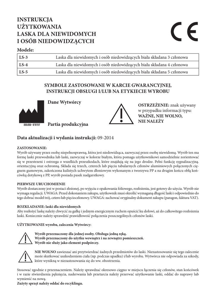 INSTRUKCJA UŻYTKOWANIA LASKA DLA NIEWIDOMYCH I OSÓB NIEDOWIDZĄCYCH Modele: LS-3 Laska dla niewidomych i osób niedowidzących biała składana 3 członowa LS-4 Laska dla niewidomych i osób niedowidzących biała składana 4 członowa LS-5 Laska dla niewidomych i osób niedowidzących biała składana 5 członowa SYMBOLE ZASTOSOWANE W KARCIE GWARANCYJNEJ, INSTRUKCJI OBSŁUGI I/LUB NA ETYKIECIE WYROBU Dane Wytwórcy mm-rrrr Partia produkcyjna OSTRZEŻENIE: znak używany w przypadku informacji typu: WAŻNE, NIE WOLNO, NIE NALEŻY Data aktualizacji i wydania instrukcji: 09-2014 ZASTOSOWANIE: Wyrób używany przez osobę niepełnosprawną, która jest niedowidząca, zazwyczaj przez osobę niewidomą. Wyrób ten ma formę laski przewodnika lub laski, zazwyczaj w kolorze białym, która pomaga użytkownikowi samodzielnie zorientować się w przestrzeni i ostrzega o wszelkich przeszkodach, które znajdują się na jego drodze. Pełni funkcję sygnalizacyjną. orientacyjną oraz ochronną. Składa się trzech, czterech lub pięciu tabularnych członów aluminiowych połączonych cięgnem gumowym, zakończona kulistych uchwytem dłoniowym wykonanym z tworzywa PP a na drugim końcu obłą końcówką dotykową z PP, wyrób posiada pasek nadgarstkowy. PIERWSZE URUCHOMIENIE Wyrób dostarczony jest w postaci złożonej, po wyjęciu z opakowania foliowego, rozłożeniu, jest gotowy do użycia. Wyrób nie wymaga regulacji. UWAGA: Przed dokonaniem zakupu, użytkownik musi określić wymaganą długość laski i odpowiednio do tego dobrać model trój, cztero lub pięcioczłonowy. UWAGA: zachować oryginalny dokument zakupu (paragon, faktura VAT). ROZKŁADANIE: laski dla niewidomych Aby rozłożyć laskę należy chwycić za gałkę i jednym energicznym ruchem opuścić ku dołowi, aż do całkowitego rozłożenia laski. Koniecznie należy sprawdzić prawidłowość połączenia poszczególnych członów laski. UŻYTKOWANIE wyrobu, zalecenia Wytwórcy: Wyrób przeznaczony dla jednej osoby. Obsługa jedną ręką. Wyrób przeznaczony do użytku wewnątrz i na zewnątrz pomieszczeń. Wyrób nie służy jako element podpórczy. NIE WOLNO zawieszać ani przytwierdzać żadnych przedmiotów do laski. Niezastosowanie się tego zalecenie może skutkować uszkodzeniem ciała (np. podczas upadku) i/lub wyrobu. Wytwórca nie odpowiada za szkody, które wynikną w niezastosowania się do ww. obostrzenia. Stosować zgodnie z przeznaczeniem. Należy sprawdzać okresowo cięgno w miejscu łączenia się członów, stan końcówek i w razie stwierdzenia pęknięcia, naderwania lub przetarcia należy przerwać użytkowanie laski, oddać do naprawy lub wymienić na nową. Zużyty sprzęt należy oddać do recyklingu. CZYSZCZENIE / KONSERWACJA/PRZECHOWYWANIE: 1. Elementy z tworzywa, rurki czyścić miękką gąbką, zwilżoną w łagodnym środku czyszczącym, po czyszczeniu przetrzeć wilgotną szmatką, wypolerować do sucha. 2. NIE WOLNO stosować do czyszczenia środków ściernych, mocnych detergentów, benzyny, rozpuszczalników, środków powierzchniowo czynnych wchodzących w reakcję z aluminium. 3. Koniecznie na bieżąco usuwać zanieczyszczenia. 4. Wszelki uszkodzenia, które wynikną ze złego czyszczenia, konserwacji wyrobu, nie podlegają naprawie gwarancyjnej. 5. Przechowywać w temperaturze pokojowej, w pomieszczeniach suchych, zamkniętych, wolnych od oparów chemicznych (zdala od sztucznych źródeł ciepła typu: kaloryfer, grzejnik, piec). 6. Przechowywanie w pomieszczeniach o wysokiej wilgotności powietrza (łazienka, pralnie, piwnice itp. lub na wolnym powietrzu) połączone z brakiem higieny zwłaszcza przy dłuższym przechowywaniu, będą przyczyną utraty parametrów użytkowych i estetycznych a tym samym gwarancji na wyrób. 7. Kontrolę stanu technicznego wyrobu użytkownik dokonuje samodzielnie, nie rzadziej niż raz na trzy miesiące. GWARANCJA: Gwarancja Wytwórcy obowiązuje przez okres 18 miesięcy od daty zakupu u Sprzedawcy, po okazaniu oryginału dowodu zakupu. Wyrób oddany do reklamacji musi być czysty, w przypadku przesyłki zapakowany bezpiecznie tak, aby nie uszkodził się podczas transportu. Użytkownik dostarcza wyrób do Sprzedającego lub bezpośrednio do Wytwórcy na własny koszt. Gwarancji podlegają wyłącznie wady fabryczne wyrobu ujawnione w wyrobie natychmiast po ich zaistnieniu, zgłoszone na druku gwarancji do Sprzedawcy lub bezpośrednio do Wytwórcy. Gwarancji nie podlega zużycie gumowego cięgna w oplocie, końcówek dłoniowej i dotykowej z PP - wynikające z naturalnej i zgodnej z zaleceniami eksploatacji wyrobu. WYŁĄCZENIA ODPOWIEDZIALNOŚCI: Wytwórca nie odpowiada za uszkodzenia ciała i/lub wyrobu w następujących przypadkach: Laska- nieprawidłowego inwalidzka zamontowania części i akcesoriów przez użytkującego lub opiekunów/osoby trzecie - samodzielnej modyfikacji części dokonanej przez użytkującego lub opiekunów/osoby trzecie Tabela parametrów standardowych: - użycia nieoryginalnych części i akcesoriów, dostępnych u Wytwórcy - naturalnego ścierania i zużywania się części wymienionych w podpunkcie GWARANCJA MODEL: LP L-S LU-bez reg zużytego, LU niewłaściwie LU-biała dobranego przez L-M - wypadków spowodowanych używaniem uszkodzonego, Laska inwalidzka LL L-S-P całkowita w cm: osoby medycznieWysokość do tego upoważnione lub niezgodnie z zaleceniem Wytwórcy przechowywanego sprzętu 90 cm 75-91 75-91 75-91 89–107 82,5–92 min - max z przeznaczeniem określonym w niniejszej instrukcji obsługi - użycia sprzętu niezgodne Materiał rurki ALUM ALUM ALUM ALUM ALUM ALUM Rękojeść PP PP PP PP PU PP SERWIS: Maks obciążenie w kg 100 kg 120 kg 120 kg 120 kg 100 kg 100 kg Wykryte wady, uszkodzenia należy zgłaszać u Sprzedającego lub bezpośrednio u Wytwórcy pod adres wskazany w niniejWaga netto wyrobu 0,4 kg 0,35 kg 0,35 kg 0,35 kg 0,35 kg 0,3 kg szej Instrukcji obsługi. Przed dostarczeniem wyrobu do punktu serwi