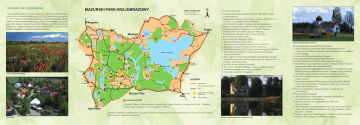 MAZURSKI PARK KRAJOBRAZOWY Co warto zobaczyç ? Mazurski Park Krajobrazowy to jeden z najstarszych i najwi´kszych parków krajobrazowych w Polsce. Powierzchnia Parku wynosi 53 655 ha. Mazurski Park zosta∏ utworzony w 1977 r. Po∏o˝ony jest na terenie województwa warmiƒsko-mazurskiego, zajmujàc pogranicze trzech powiatów: mràgowskiego, piskiego i szczycieƒskiego oraz siedmiu gmin: Piecki, Mràgowo, Âwi´tajno, Ruciane-Nida, Miko∏ajki, Orzysz i Pisz. Mazurski Park Krajobrazowy w wi´kszoÊci zajmuje teren Krainy Wielkich Jezior, w cz´Êci zachodniej Pojezierze Mràgowskie, a w po∏udniowej Równin´ Mazurskà. 1. WczesnoÊredniowieczne grodzisko nad jeziorem Majcz Wielki k. Lipowa (z wa∏em obronnym). 2. Najwi´kszy g∏az narzutowy (ró˝owy granit) o wymiarach: obwód 1215 cm, wysokoÊç 2 m, na pó∏wyspie Kusnort k. Miko∏ajek. 3. Uk∏ad zabudowy wsi Ga∏kowo, za∏o˝onej przez staroobrz´dowców. 4. Klasztor staroobrz´dowców w Wojnowie z 1847 r. nad Jeziorem DuÊ. 5. Murowana molenna staroobrz´dowców z lat 1922-27 w Wojnowie. 6. Drewniana cerkiew prawos∏awna (1922-23) w Wojnowie. 7. KoÊció∏ gotycki w Nawiadach z 1437 r. (obecny z ok. 1527 r.). 8. KoÊció∏ neogotycki w Ukcie z 1864 r. 9. KoÊció∏ neogotycki w Wejsunach z 1898 r. 10. Drewniana dzwonnica w Ukcie z 1846 r. 11. M∏yn wodny na rzece Krutyni w Zielonym Lasku z koƒca XIX w. 12. Ruiny m∏yna wodnego na strumieniu Pierwos k. Bobrówka. 13. Spi´trzenie strumienia na Uklance przy zachodnim brzegu Jeziora Mokrego. 14. Ruiny zburzonego pod koniec II wojny Êwiatowej mostu kolejowego w Ukcie z koƒca XIX w. 15. Âluza Guzianka pomi´dzy jeziorami Be∏dany i Guzianka Ma∏a, przeci´tna wysokoÊç Êluzowania wynosi 2,20 m, d∏ugoÊç Êluzy 44 m, szerokoÊç wrót 7,5 m, powsta∏a w po∏owie XIX wieku. 16. Jaz mi´dzy jeziorami Mokrym i Krutyƒskim. 17. Prom na linie – Wierzba k. Miko∏ajek – kursuje co godzin´ od 6 do 18. 18. Zabudowania pojunkierskie w Krutyni i w ¸uknajnie. 19. Zespó∏ pa∏acowo-parkowy w Baranowie. Pola w okolicach Miko∏ajek rezerwaty przyrody 1. Krutynia; 2. Zakr´t; 3. Królewska Sosna; 4. Krutynia Dolna; 5. Jezioro Warno∏ty; 6. Czaplisko-¸awny Lasek; 7. Strza∏owo 8. Jezioro Lisiny; 9. Czapliniec; 10. Jezioro ¸uknajno; 11. Pierwos Cmentarze ewangelickie w miejscowoÊciach: Ukta, Krutyƒ, Bobrówko, Wojnowo oraz cmentarze staroobrz´dowców w miejscowoÊciach: Wojnowo, Ga∏kowo, Iwanowo, Kadzid∏owo, Onufryjewo WieÊ Krutyƒ Klasztor staroobrz´dowców nad jeziorem DuÊ Cerkiew prawos∏awna w Wojnowie 20. Izba Pami´ci pisarza Ernsta Wiecherta w Piers∏awku. 21. Muzeum Przyrodnicze Mazurskiego Parku Krajobrazowego w Krutyni – ekspozycje przyrodnicza, fotograficzna i plastyczne prezentowane w zabytkowej stodole mazurskiej. 22. Galeria rzeêby Zdzis∏awa Grunwalda w Ze∏wàgach. 23. Izba Regionalna Eugeniusza Bielawskiego w Wejsunach. 24. Kolekcja sztuki ludowej Walentyny i Marii Dermackiej w Pieckach. 25. Park Dzikich Zwierzàt w Kadzid∏owie. Na du˝ych wybiegach zobaczyç mo˝na jeleniowate, koniki polskie, wilki, ró˝ne gatunki ptaków. Z Parkiem Dzikich Zwierzàt sàsiaduje Osada Kulturowa w Kadzid∏owie, na którà sk∏adajà si´ zabytkowe zabudowania mazurskie: drewniana cha∏upa, drewniana cha∏upa podcieniowa, spichlerzyk podcieniowy i budynek gospodarczy. 26. Stacja PAN w Popielnie; zajmuje si´ prowadzeniem hodowli jeleni, koników polskich i bobrów. 27. Ferma jeleniowatych Stacji Badawczej Instytutu Parazytologii PAN w Kosewie Górnym. Na du˝ych wybiegach ˝yjà stada jeleni i danieli (po ok. 200 sztuk), a tak˝e muflony, koniki polskie. 28. Pó∏wysep Szeroki Ostrów z klifowymi brzegami i widokiem na ca∏e jezioro Âniardwy. 29. Park podworski w Brejdynach. 30. „Dàb nad Mukrem“ im. Karola Ma∏∏ka – pomnikowy dàb szypu∏kowy na wschodnim brzegu Jeziora Mokrego. 31. Martwa ju˝ od 30 lat sosna – „Królewska Sosna“ naprzeciwko „D´bu nad Mukrem“. 32. „D´by Królewskie“ w miejscowoÊci Ruciane-Nida, przy szosie do Pisza po lewej stronie; naprzeciwko Wy∏uszczarni Nasion rosnà 2 d´by szypu∏kowe: „Dobko“ (bli˝ej ulicy) i „Gniewko“. 33. Pomnikowa grupa drzew „Zakochana Para“, ok. 300 m na zachód od wsi Krutyƒ. 34. Pomnikowy dàb szypu∏kowy we wsi Ukta ko∏o parkingu. Osadnictwo Jezioro Âniardwy Wody i lasy Park swoimi granicami obejmuje najwi´ksze w Polsce jezioro Âniardwy, które znajduje si´ we wschodniej cz´Êci. W zachodniej cz´Êci przewa˝ajà lasy Puszczy Piskiej, które zajmujà 29 tys. ha. Charakterystycznym zbiorowiskiem leÊnym dla Parku jest gràd – wielogatunkowy las liÊciasty, w którym rosnà takie drzewa, jak: dàb szypu∏kowy, lipa drobnolistna, grab zwyczajny, klon zwyczajny. Z brzegami wód i terenami podmok∏ymi zwiàzane sà bory bagienne, olsy i ∏´gi. Lasy poprzecinane sà d∏ugimi jeziorami rynnowymi takimi, jak: Be∏dany, Miko∏ajskie, a w zachodniej cz´Êci Mokre, które jest najg∏´bszym jeziorem Parku o g∏´bokoÊci maks. 51 m. Jezior o powierzchni powy˝ej 1 ha jest oko∏o 60 na terenie Parku. Niemniej cenne sà ma∏e, bezodp∏ywowe, najcz´Êciej ÊródleÊne jeziorka, zarastajàce roÊlinnoÊcià torfowiskowà. Wody p∏ynàce Parku reprezentuje rzeka Krutynia, p∏ynàca w zachodniej cz´Êci Parku. S∏ynie z kr´tego biegu – meandrów i malowniczego po∏o˝enia wÊród wzgórz morenowych. Krutynia, rzeka o d∏ugoÊci 26 km, wyp∏ywajàca z Jeziora Krutyƒskiego, wpadajàca do Jeziora Gardyƒskiego, jest fragmentem znanego szlaku kajakowego rzeki Krutyni liczàcego ok. 102 km d∏ugoÊci. WÊród strumieni Parku wyró˝niajà si´ Blankowa Struga, Pierwos, Uklanka, Skok, Garcianka, majàce niejednokrotnie charakter ma∏ych rzeczek. Wody na terenie Parku zajmujà ok. 18 tys. ha. Rzeka Krutynia Najwi´kszà wsià Mazurskiego Parku Krajobrazowego jest Ukta po∏o˝ona nad rzekà Krutynià, podobnie jak wieÊ Krutyƒ,