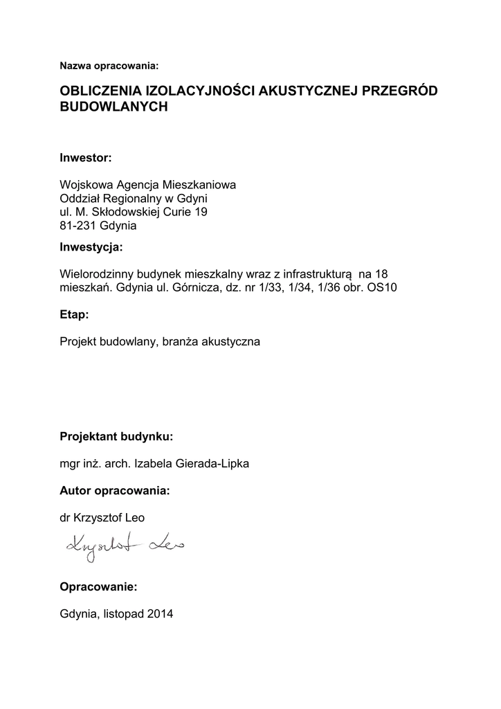 Nazwa opracowania: OBLICZENIA IZOLACYJNOŚCI AKUSTYCZNEJ PRZEGRÓD BUDOWLANYCH Inwestor: Wojskowa Agencja Mieszkaniowa Oddział Regionalny w Gdyni ul. M. Skłodowskiej Curie 19 81-231 Gdynia Inwestycja: Wielorodzinny budynek mieszkalny wraz z infrastrukturą na 18 mieszkań. Gdynia ul. Górnicza, dz. nr 1/33, 1/34, 1/36 obr. OS10 Etap: Projekt budowlany, branża akustyczna Projektant budynku: mgr inż. arch. Izabela Gierada-Lipka Autor opracowania: dr Krzysztof Leo Opracowanie: Gdynia, listopad 2014 SPIS TREŚCI 1. Podstawa opracowania 2. Zakres i cel opracowania 3. Obliczenia akustyczne i zalecenia dotyczące konstrukcji przegród 3.1 Wymagana izolacyjność przegród 3.2 Obliczenia akustyczne izolacyjności przegród 3.3 Konstrukcje przegród 2 1. PODSTAWA OPRACOWANIA rysunki architektoniczne dostarczone przez zleceniodawcę, uzgodnienia z projektantem architektury, program funkcjonalno - użytkowy obiektu, Polskie Normy: PN-87/B-02151/02 “Akustyka budowlana. Ochrona przed hałasem pomieszczeń w budynkach. Dopuszczalne wartości poziomu dźwięku w budynkach”, PN-B-02151-3:1999 “Akustyka budowlana - Ochrona przed hałasem w budynkach Izolacyjność budowlana przegród w budynkach oraz izolacyjność budowlana elementów budowlanych - Wymagania”, Instrukcja ITB 369/2002: Właściwości dźwiękoizolacyjne przegród budowlanych i ich elementów. Wyd. Instytut Techniki Budowlanej, Warszawa 2002, Instrukcja ITB 406/2005: Metody obliczania izolacyjności akustycznej między pomieszczeniami w budynku według PN-EN 12354-1:2002 i PN-EN 12354-2:2002 wytyczne projektowe z akustyki budowlanej zawarte w literaturze przedmiotu (m.in. J. Sadowski, “Akustyka w urbanistyce, architekturze i budownictwie”, Arkady, Warszawa 1971, T. E. Vigran, „Building Acoustics”, Taylor and Francis, Canada 2008) 2. ZAKRES I CEL OPRACOWANIA Zakres wytycznych akustycznych obejmuje następujące przegrody w projektowanym budynku: 1. międzylokalowe stropy oznaczone jako 1P oraz 2P, 2. wewnątrzlokalowe ściany działowe z pustaka wapienno - piaskowego gr.8 i 12 cm z obustronnym tynkiem cementowo - wapiennym gr. 1,5cm, 3. międzylokalowe ściany z pustaka wapienno - piaskowego gr. 18cm z tynkiem obustronnym cementowo - wapiennym gr. 1,5cm, 4. międzylokalowe ściany pomiędzy klatką schodową a mieszkaniami z żelbetu gr. 18cm i 20cm z obustronnym tynkiem cementowo wapiennym gr. 1,5cm. 3 Celem opracowania jest przedstawienie wytycznych akustycznych do projektu budowlanego w zakresie spełnienia wymaganych przez program funkcjonalno – użytkowy oraz przepisy Prawa Budowlanego wartości izolacyjności akustycznej przegród budowlanych. 3. OBLICZENIA AKUSTYCZNE I ZALECENIA DOTYCZĄCE KONSTRUKCJI PRZEGRÓD 3.1 WYMAGANA IZOLACYJNOŚĆ PRZEGRÓD Tab. 1 wymagana izolacyjność przegród wewnętrzynych dla budynków wielorodzinnych (Zgodnie z PN-B-02151-3:1999, w nawiasie podano wymóg Inwestora zgodnie z programem funkcjonalno - użytkowym) Przegroda Dźwięki Dźwięki powietrz uderzeni ne owe RA1’ L'nw min, dB max, dB 4 1 Stropy międzylokalowe 51 (50) 58 (53) Wewnątrzlokalowe ściany działowe 30 (35) - Ściany międzylokalowe 50 (50) - RA1’: jednoliczbowy wskaźnik izolacyjności akustycznej właściwej przybliżonej na dźwięki powietrzne, wartość minimalna (dotyczy izolacyjności od dźwięków powietrznych o widmie średnio- i wysokoczęstotliwościowym w sytuacji z przenoszeniem bocznym przez otaczającą konstrukcję budynku), L'nw jednoliczbowy ważony wskaźnik poziomu uderzeniowego znormalizowanego przybliżonego (uwzględniającego wpływ bocznego przenoszenia dźwięku). Opisuje reakcję przegrody na pobudzenie dźwiękiem uderzeniowym oraz drganiem. 3.2 OBLICZENIA AKUSTYCZNE IZOLACYJNOŚCI PRZEGRÓD W obliczeniach wykorzystano zależności podane w instrukcji ITB 406/2005 oraz w normie PN-B-02151-3:1999 i normie PN-EN 12354-1:2002 i PN-EN 12354-2:2002 A. L`nw = Lnw + K gdzie: L`nw – ważony wskaźnik poziomu uderzeniowego znormalizowanego przybliżonego (uwzględniającego wpływ bocznego przenoszenia dźwięku), Lnw – ważony wskaźnik poziomu uderzeniowego znormalizowanego określony w warunkach laboratoryjnych, 4 K – poprawka dla bocznego przenikania dźwięku. B. R`A1 = RA1 – K gdzie: R`A1 – wskaźnik oceny izolacyjności akustycznej właściwej przybliżonej na dźwięki powietrzne, RA1 - wskaźnik oceny izolacyjności akustycznej właściwej na dźwięki powietrzne (mierzony laboratoryjnie bez przenikania bocznego), K – poprawka ze względu na przenikanie boczne. C. RA1 = 30.9*log(ms) – 24.1 gdzie: RA1 - wskaźnik oceny izolacyjności akustycznej właściwej na dźwięki powietrzne (mierzony laboratoryjnie bez przenikania bocznego), ms – masa powierzchniowa przegrody jednorodnej, z materiału o masie powierzchniowej >=100 kg/m2 Strop 1P masa powierzchniowa ms = 517 kg/m2 RA1 = 59 dB R`A1 = 59 – 2 = 57 dB Lnw = 48 dB L`nw = 48 + 2 = 50 dB Strop 2P masa powierzchniowa ms = 925 kg/m2 RA1 = 67 dB R`A1 = 67 – 2 = 65 dB Lnw = 47 dB L`nw = 47+ 2 = 49 dB Ściany z pustaka wapienno - piaskowego gr.8 masa powierzchniowa ms = 120 kg/m2 RA1 = 40 dB R`A1 = 40 – 5 = 35 dB Ściany z pustaka wapienno - piaskowego gr.12 masa powierzchniowa ms = 180 kg/m2 RA1 = 44 dB R`A1 = 44 – 5 = 39 dB Ściany z pustaka wapienno - piaskowego gr. 18cm masa powierzchniowa ms = 360 kg/m2 RA1 = 54 dB R`A1 = 54 – 3 = 51 dB 5 Ściana żelbetowa gr. 18 cm masa powierzchniowa ms = 432 kg/m2 RA1 = 57 dB R`A1 = 57 – 2 = 55 dB Ściana żelbetowa gr. 20 cm masa powierzchniowa ms = 480 kg/m2 RA1 = 58 dB R`A1 = 58 – 2 = 56 dB Tab. 2 Wyniki obliczeń Przegroda Rozwiązanie Strop Sciany wewnątrzlokalowe Ściany międzylokalowe R`A1, dB L`nw, dB Żelbet, pływająca podłoga (1P) 57 50 Żelbet, pływająca podłoga (2P) 65 49 Pustak wap. piaskowy gr. 8 cm 35 - Pustak wap. piaskowy gr. 12 cm 39 - Pustak wap. piaskowy gr. 18 cm 51 - Ściana żelbetowa g. 18 cm 55 - Ściana żelbetowa g. 20 cm 56 - 6 