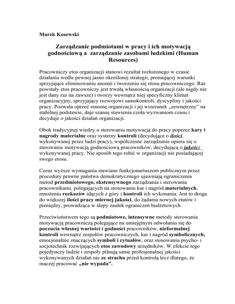 Marek Kosewski Zarządzanie podmiotami w pracy i ich motywacją godnościową a zarządzanie zasobami ludzkimi (Human Resources) Pracowniczy etos organizacji stanowi rezultat rozłożonego w czasie działania wedle pewnej jasno określonej strategii, promującej warunki sprzyjające eliminowaniu anomii i tworzeniu się etosu pracowniczego. Raz powstały etos pracowniczy jest trwałą własnością organizacji (ale nigdy nie jest dany raz na zawsze) i tworzy wewnątrz niej specyficzny klimat organizacyjny, sprzyjający rozwojowi samokontroli, dyscypliny i jakości pracy. Pozwala oprzeć renomę organizacji i jej wizerunek „zewnętrzny” na stabilnej podstawie, daje szansę stawienia czoła wyzwaniom czasu i decyduje o jakości działań organizacji. Obok tradycyjnej wiedzy o sterowaniu motywacją do pracy poprzez kary i nagrody materialne oraz systemy kontroli (decydujące o ilości wykonywanej przez ludzi pracy), współczesne zarządzanie opiera się o sterowanie motywacją godnościową pracowników, decydującą o jakości wykonywanej pracy. Nie sposób tego robić w organizacji nie posiadającej swego etosu. Coraz wyższe wymagania stawiane funkcjonariuszom publicznym przez procedury prawne państwa demokratycznego ujawniają ograniczenia metod przedmiotowego, ekstensywnego zarządzania i sterowania pracownikami, polegających na stosowaniu kar i nagród materialnych, mnożeniu rozkazów idących z góry i kontroli ich wykonania. Jest to droga do większej ilości pracy miernej jakości, do żądania nowych etatów i pieniędzy, prowadząca w ślepy zaułek ograniczeń budżetowych. Przeciwieństwem tego są podmiotowe, intensywne metody sterowania motywacją pracowniczą polegające na umiejętnym odwołaniu się do poczucia własnej wartości i godności pracowników, nieformalnej kontroli wewnątrz zespołów pracowniczych, kar i nagród symbolicznych, emocjonalnie znaczących symboli i rytuałów, oraz stosowaniu psycho- i socjotechnik rozwijających etos zawodowy urzędników. W efekcie tego pojedynczy ludzie i zespoły pilnują same profesjonalnej jakości wykonywanych działań nie ze strachu przed kontrolą lecz dlatego, że inaczej pracować „nie wypada”. 2 Do wytworzenia silnego etosu konieczna jest odpowiednia zmiana świadomości pracowniczej. Osiągnąć ją można poprzez skorelowanie ze sobą: • zmiany w stylu i technikach kierowania ludźmi, umacniającej pozycję kadry kierowniczej • zmiany strukturalno – organizacyjnej pobudzające powstawanie etosu pracowniczego. Szczegółowe cele tego działania sformułować można następująco: 1. Przejście od ekstensywnych do intensywnych metod wpływania na motywację pracowników. 2. Podniesienie jakości pracy, a nie jej ilości. 3. Wprowadzenie samokontroli jakości i ilości pracy wykonywanej przez pracowników. Osiągnąć te cele można następującymi narzędziami: • Diagnoza zasobów. • Doradztwo i konsulting dla kadry kierowniczej. • Nowoczesne metody Zarządzania Potencjałem Ludzkim (ZPL), a w tym: a) Systematyczne i celowe tworzenie etosowych elementów kultury organizacji poprzez szkoleniowy „Program zmiany świadomości pracowniczej”, zbudowany na podstawie idei służby społecznej i stosowany metodą treningowo – warsztatową dla wszystkich pracowników. b) Czytelne kryteria awansu dla wszystkich pracowników. c) Indywidualne plany rozwoju i wymagań wobec każdego pracownika. d) Transparentność awansów. e) Symbolika nagradzania, karania i awansowania pracowników – nagłaśnianie w mediach wewnętrznych. f) Wewnętrzne rytuały i ceremoniały organizacji, a w tym: Tworzenie własnego „kodeksu honorowego” – zbioru zasad etosowych, bezwyjątkowo przestrzeganych. Budowanie znaczenia ceremonii, znaków, rytuałów i nagród symbolicznych. • Zarządzanie procesami komunikacji – rozwój wewnętrznego Public Relations i troska o stymulowanie procesów etosotwórczych wspólnie z działem ZPL. 3 1. Komu potrzebny jest etos organizacji i zawodu? Po pierwsze potrzebny jest kadrze zarządzającej dla sprawnego kierowania organizacją. Etos pracowniczy potrzebny jest samej organizacji, jako warunek konieczny zarządzania jakością, jej pracowników chroni przed przejściem na zasiłki. Współczesna gospodarka o wysokiej konkurencyjności stawia w pierwszym rzędzie na jakość, a zainteresowanie II kategorią usług i produktów maleje. Wraz z wejściem Polski do UE znikną te organizacji, które nie będą potrafiły dotrzymać standardów jakości międzynarodowej. Etos organizacji potrzebny jest wreszcie jej pracownikom w głębszym, psychologicznym znaczeniu. Przeciętny, zawodowo aktywny człowiek 80% swojej energii życiowej i czasu poświęca na pracę i zaspokaja w ten sposób swoją potrzebę korzyści. Jest więc rzeczą naturalną, że także 80% swoich potrzeb godnościowych powinien zaspokajać w pracy, pracując w przedsiębiorstwie z przynależności do którego jest dumny, wykonując zawód, którym może pochwalić się przed rodziną, znajomymi, sąsiadami, mając pracę "godną pozazdroszczenia". Jeśli ktoś nie odczuwa dumy z pracy w swojej organizacji i zawodzie, lub co gorsza musi się tego wstydzić, wtedy 100% swych potrzeb godnościowych zaspokajać będzie w ramach pozostających mu poza pracą 20% energii i możliwości. Wtedy jednak nie będzie mógł na codzień normalnie funkcjonować. Likwidacja polityczno społecznego systemu „realnego socjalizmu” w europejskich krajach znajdujących się w jałtańskiej strefie „strategicznych interesów ZSRR” pozostawiła po sobie poza zrujnowaną gospodarką, równie zrujnowaną moralną infrastrukturę tych społeczeństw. Zjawisko to, które nazywam „anomia sovietica”, w interesującym nas tutaj zakresie wyraża się zanikiem moralnego znaczenia przypisywanego pracy i destrukcją etosów profesjonalnych, których wiele było dobrze wykształconych w Polsce już na początku XX wieku. Etosy te ul