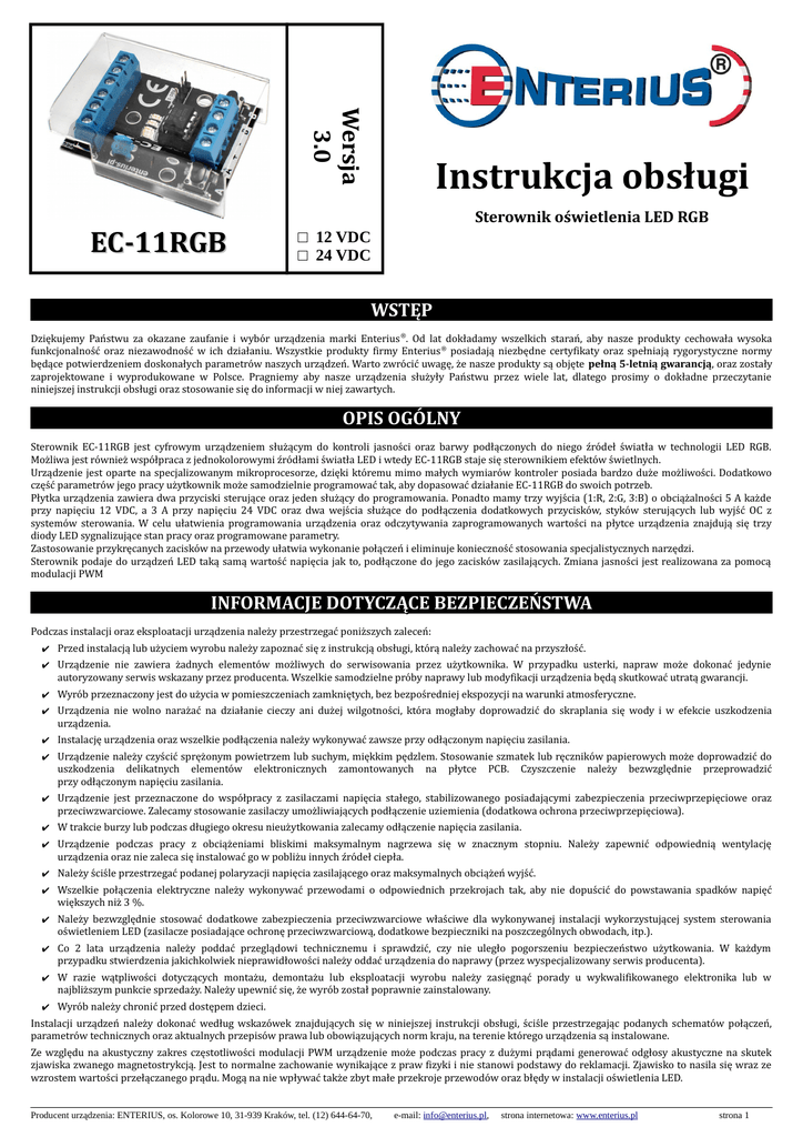 Wersja 3.0 EC-11RGB Instrukcja obsługi Sterownik oświetlenia LED RGB □ 12 VDC □ 24 VDC WSTĘP Dziękujemy Państwu za okazane zaufanie i wybór urządzenia marki Enterius ®. Od lat dokładamy wszelkich starań, aby nasze produkty cechowała wysoka funkcjonalność oraz niezawodność w ich działaniu. Wszystkie produkty firmy Enterius ® posiadają niezbędne certyfikaty oraz spełniają rygorystyczne normy będące potwierdzeniem doskonałych parametrów naszych urządzeń. Warto zwrócić uwagę, że nasze produkty są objęte pełną 5-letnią gwarancją, oraz zostały zaprojektowane i wyprodukowane w Polsce. Pragniemy aby nasze urządzenia służyły Państwu przez wiele lat, dlatego prosimy o dokładne przeczytanie niniejszej instrukcji obsługi oraz stosowanie się do informacji w niej zawartych. OPIS OGÓLNY Sterownik EC-11RGB jest cyfrowym urządzeniem służącym do kontroli jasności oraz barwy podłączonych do niego źródeł światła w technologii LED RGB. Możliwa jest również współpraca z jednokolorowymi źródłami światła LED i wtedy EC-11RGB staje się sterownikiem efektów świetlnych. Urządzenie jest oparte na specjalizowanym mikroprocesorze, dzięki któremu mimo małych wymiarów kontroler posiada bardzo duże możliwości. Dodatkowo część parametrów jego pracy użytkownik może samodzielnie programować tak, aby dopasować działanie EC-11RGB do swoich potrzeb. Płytka urządzenia zawiera dwa przyciski sterujące oraz jeden służący do programowania. Ponadto mamy trzy wyjścia (1:R, 2:G, 3:B) o obciążalności 5 A każde przy napięciu 12 VDC, a 3 A przy napięciu 24 VDC oraz dwa wejścia służące do podłączenia dodatkowych przycisków, styków sterujących lub wyjść OC z systemów sterowania. W celu ułatwienia programowania urządzenia oraz odczytywania zaprogramowanych wartości na płytce urządzenia znajdują się trzy diody LED sygnalizujące stan pracy oraz programowane parametry. Zastosowanie przykręcanych zacisków na przewody ułatwia wykonanie połączeń i eliminuje konieczność stosowania specjalistycznych narzędzi. Sterownik podaje do urządzeń LED taką samą wartość napięcia jak to, podłączone do jego zacisków zasilających. Zmiana jasności jest realizowana za pomocą modulacji PWM INFORMACJE DOTYCZĄCE BEZPIECZEŃSTWA Podczas instalacji oraz eksploatacji urządzenia należy przestrzegać poniższych zaleceń: ✔ Przed instalacją lub użyciem wyrobu należy zapoznać się z instrukcją obsługi, którą należy zachować na przyszłość. ✔ Urządzenie nie zawiera żadnych elementów możliwych do serwisowania przez użytkownika. W przypadku usterki, napraw może dokonać jedynie autoryzowany serwis wskazany przez producenta. Wszelkie samodzielne próby naprawy lub modyfikacji urządzenia będą skutkować utratą gwarancji. ✔ Wyrób przeznaczony jest do użycia w pomieszczeniach zamkniętych, bez bezpośredniej ekspozycji na warunki atmosferyczne. ✔ Urządzenia nie wolno narażać na działanie cieczy ani dużej wilgotności, która mogłaby doprowadzić do skraplania się wody i w efekcie uszkodzenia urządzenia. ✔ Instalację urządzenia oraz wszelkie podłączenia należy wykonywać zawsze przy odłączonym napięciu zasilania. ✔ Urządzenie należy czyścić sprężonym powietrzem lub suchym, miękkim pędzlem. Stosowanie szmatek lub ręczników papierowych może doprowadzić do uszkodzenia delikatnych elementów elektronicznych zamontowanych na płytce PCB. Czyszczenie należy bezwzględnie przeprowadzić przy odłączonym napięciu zasilania. ✔ Urządzenie jest przeznaczone do współpracy z zasilaczami napięcia stałego, stabilizowanego posiadającymi zabezpieczenia przeciwprzepięciowe oraz przeciwzwarciowe. Zalecamy stosowanie zasilaczy umożliwiających podłączenie uziemienia (dodatkowa ochrona przeciwprzepięciowa). ✔ W trakcie burzy lub podczas długiego okresu nieużytkowania zalecamy odłączenie napięcia zasilania. ✔ Urządzenie podczas pracy z obciążeniami bliskimi maksymalnym nagrzewa się w znacznym stopniu. Należy zapewnić odpowiednią wentylację urządzenia oraz nie zaleca się instalować go w pobliżu innych źródeł ciepła. ✔ Należy ściśle przestrzegać podanej polaryzacji napięcia zasilającego oraz maksymalnych obciążeń wyjść. ✔ Wszelkie połączenia elektryczne należy wykonywać przewodami o odpowiednich przekrojach tak, aby nie dopuścić do powstawania spadków napięć większych niż 3 %. ✔ Należy bezwzględnie stosować dodatkowe zabezpieczenia przeciwzwarciowe właściwe dla wykonywanej instalacji wykorzystującej system sterowania oświetleniem LED (zasilacze posiadające ochronę przeciwzwarciową, dodatkowe bezpieczniki na poszczególnych obwodach, itp.). ✔ Co 2 lata urządzenia należy poddać przeglądowi technicznemu i sprawdzić, czy nie uległo pogorszeniu bezpieczeństwo użytkowania. W każdym przypadku stwierdzenia jakichkolwiek nieprawidłowości należy oddać urządzenia do naprawy (przez wyspecjalizowany serwis producenta). ✔ W razie wątpliwości dotyczących montażu, demontażu lub eksploatacji wyrobu należy zasięgnąć porady u wykwalifikowanego elektronika lub w najbliższym punkcie sprzedaży. Należy upewnić się, że wyrób został poprawnie zainstalowany. ✔ Wyrób należy chronić przed dostępem dzieci. Instalacji urządzeń należy dokonać według wskazówek znajdujących się w niniejszej instrukcji obsługi, ściśle przestrzegając podanych schematów połączeń, parametrów technicznych oraz aktualnych przepisów prawa lub obowiązujących norm kraju, na terenie którego urządzenia są instalowane. Ze względu na akustyczny zakres częstotliwości modulacji PWM urządzenie może podczas pracy z dużymi prądami generować odgłosy akustyczne na skutek zjawiska zwanego magnetostrykcją. Jest to normalne zachowanie wynikające z praw fizyki i nie stanowi podstawy do reklamacji. Zjawisko to nasi