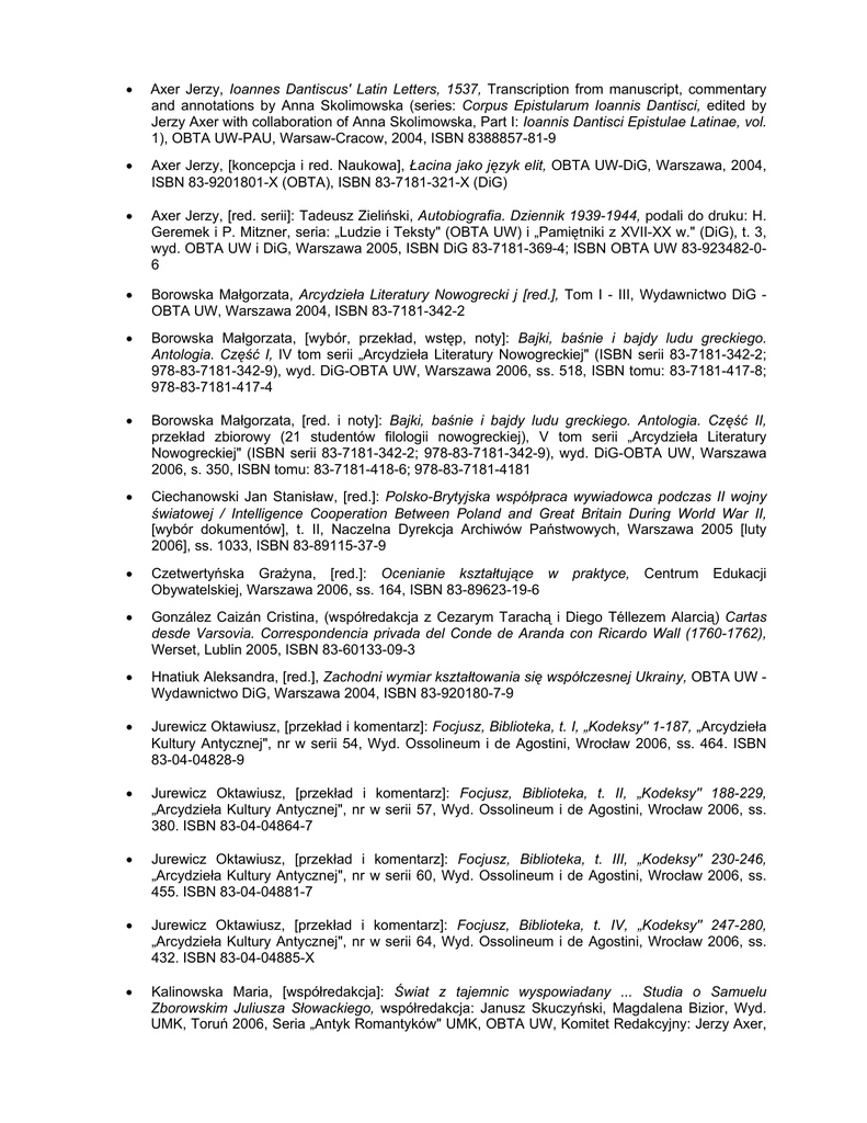 • Axer Jerzy, Ioannes Dantiscus' Latin Letters, 1537, Transcription from manuscript, commentary and annotations by Anna Skolimowska (series: Corpus Epistularum Ioannis Dantisci, edited by Jerzy Axer with collaboration of Anna Skolimowska, Part I: Ioannis Dantisci Epistulae Latinae, vol. 1), OBTA UW-PAU, Warsaw-Cracow, 2004, ISBN 8388857-81-9 • Axer Jerzy, [koncepcja i red. Naukowa], Łacina jako język elit, OBTA UW-DiG, Warszawa, 2004, ISBN 83-9201801-X (OBTA), ISBN 83-7181-321-X (DiG) • Axer Jerzy, [red. serii]: Tadeusz Zieliński, Autobiografia. Dziennik 1939-1944, podali do druku: H. Geremek i P. Mitzner, seria: „Ludzie i Teksty" (OBTA UW) i „Pamiętniki z XVII-XX w." (DiG), t. 3, wyd. OBTA UW i DiG, Warszawa 2005, ISBN DiG 83-7181-369-4; ISBN OBTA UW 83-923482-06 • Borowska Małgorzata, Arcydzieła Literatury Nowogrecki j [red.], Tom I - III, Wydawnictwo DiG OBTA UW, Warszawa 2004, ISBN 83-7181-342-2 • Borowska Małgorzata, [wybór, przekład, wstęp, noty]: Bajki, baśnie i bajdy ludu greckiego. Antologia. Część I, IV tom serii „Arcydzieła Literatury Nowogreckiej" (ISBN serii 83-7181-342-2; 978-83-7181-342-9), wyd. DiG-OBTA UW, Warszawa 2006, ss. 518, ISBN tomu: 83-7181-417-8; 978-83-7181-417-4 • Borowska Małgorzata, [red. i noty]: Bajki, baśnie i bajdy ludu greckiego. Antologia. Część II, przekład zbiorowy (21 studentów filologii nowogreckiej), V tom serii „Arcydzieła Literatury Nowogreckiej" (ISBN serii 83-7181-342-2; 978-83-7181-342-9), wyd. DiG-OBTA UW, Warszawa 2006, s. 350, ISBN tomu: 83-7181-418-6; 978-83-7181-4181 • Ciechanowski Jan Stanisław, [red.]: Polsko-Brytyjska współpraca wywiadowca podczas II wojny światowej / Intelligence Cooperation Between Poland and Great Britain During World War II, [wybór dokumentów], t. II, Naczelna Dyrekcja Archiwów Państwowych, Warszawa 2005 [luty 2006], ss. 1033, ISBN 83-89115-37-9 • Czetwertyńska Grażyna, [red.]: Ocenianie kształtujące w Obywatelskiej, Warszawa 2006, ss. 164, ISBN 83-89623-19-6 • González Caizán Cristina, (współredakcja z Cezarym Tarachą i Diego Téllezem Alarcią) Cartas desde Varsovia. Correspondencia privada del Conde de Aranda con Ricardo Wall (1760-1762), Werset, Lublin 2005, ISBN 83-60133-09-3 • Hnatiuk Aleksandra, [red.], Zachodni wymiar kształtowania się współczesnej Ukrainy, OBTA UW Wydawnictwo DiG, Warszawa 2004, ISBN 83-920180-7-9 • Jurewicz Oktawiusz, [przekład i komentarz]: Focjusz, Biblioteka, t. I, „Kodeksy" 1-187, „Arcydzieła Kultury Antycznej", nr w serii 54, Wyd. Ossolineum i de Agostini, Wrocław 2006, ss. 464. ISBN 83-04-04828-9 • Jurewicz Oktawiusz, [przekład i komentarz]: Focjusz, Biblioteka, t. II, „Kodeksy" 188-229, „Arcydzieła Kultury Antycznej", nr w serii 57, Wyd. Ossolineum i de Agostini, Wrocław 2006, ss. 380. ISBN 83-04-04864-7 • Jurewicz Oktawiusz, [przekład i komentarz]: Focjusz, Biblioteka, t. III, „Kodeksy" 230-246, „Arcydzieła Kultury Antycznej", nr w serii 60, Wyd. Ossolineum i de Agostini, Wrocław 2006, ss. 455. ISBN 83-04-04881-7 • Jurewicz Oktawiusz, [przekład i komentarz]: Focjusz, Biblioteka, t. IV, „Kodeksy" 247-280, „Arcydzieła Kultury Antycznej", nr w serii 64, Wyd. Ossolineum i de Agostini, Wrocław 2006, ss. 432. ISBN 83-04-04885-X • Kalinowska Maria, [współredakcja]: Świat z tajemnic wyspowiadany ... Studia o Samuelu Zborowskim Juliusza Słowackiego, współredakcja: Janusz Skuczyński, Magdalena Bizior, Wyd. UMK, Toruń 2006, Seria „Antyk Romantyków" UMK, OBTA UW, Komitet Redakcyjny: Jerzy Axer, praktyce, Centrum Edukacji Jerzy Speina, Włodzimierz Szturc. Redaktor serii Maria Kalinowska, ss. 382, ISBN 83-231-1932-5 • Kieniewicz Jan, [red.], Studia polsko-hiszpańskie. Wiek XX, OBTA UW, Warszawa 2004, ss. 259, ISBN 83-920180-28. • Kieniewicz Jan, [red.]: Joachim Lelewel, Historyczna paralela Hiszpanii z Polską w XVI, XVII, XVIII wieku, OBTA UW-DiG, Warszawa 2006, ss. 72, ISBN 83-9234-2-2 • Kurczewska Joanna, [red.], Oblicza lokalności. Tradycja i współczesność, Wydawnictwo IFIS PAN, Warszawa 2004, ss. 558, ISBN: 83-7388-030-5 • Lewicki Zbigniew, [red.], American Freedoms American (Dis) Orders, ASC Monographs 5, ASPRA, Warszawa 2005, ISBN 83-905843-4-4 • Łukaszyk Ewa, Pokusa pustyni. Nomadyzm jako wyjście z kryzysu współczesności w pisarstwie José Saramago, Universitas, Kraków 2005, ISBN 83-242-0567-2 • Miernowski Jan, [współautor]: Jacques Peletier du Mans, Euvres poetiques intitulez louanges, współautorzy: Sophie Arnaud, Stephen Bamforth, seria: „Textes de la Renaissance", nr 113, H. Champion, Paryż 2005, ISBN 2-74531385-1 • Olko-Bajer Justyna, [red.], Zamach stanu w dawnych społecznościach, red., OBTA UW, Warszawa 2004, ss. 478, ISBN 83-920180-3-6 • Olko-Bajer Justyna, (współredakcja) Dawne elity - słowo i gest, Spotkania Dawnych Kultur t.1, OBTA- DIG, Warszawa 2005, ISBN OBTA 83-920180-9-5, ISBN DIG 83-7181-392-9 • Olko-Bajer Justyna, Turquoise Diadems and Staffs of Office. Elite Costume and Insignia of Power in the Aztec and Early Colonial Mexico, Polskie Towarzystwo Studiów Latynoamerykanistycznych i OBTA, Warszawa 2005, s. 572, ISBN 83-923482-1-4 • Rieger Janusz, [red.]: J. Rieger, I. Masojć, K. Rutkowska, Słownictwo polszczyzny gwarowej na Litwie, seria: „Słownictwo dawnych Kresów Wschodnich", DiG, Warszawa 2006, ss. 455, ISBN 83-7181-431-3, 978-83-7181-431-0 • Rieger Janusz, Ukrajinsko polskyj tematycznyj słownyk, współautorstwo z O. Demską-Kulczycką, Wyd. UKU, Lwiw 2006, ss. 660, ISBN 966-8197-08-9 • Salwa Piotr, La narrativa tardogotica toscana, Cadmo, Firenze 2004, ss. 172, ISBN 88-7923-3041 • Salwa Piotr, (opracowanie, wstęp): Francesco Petrarca, Drobne wiersze włoskie, wybór przekładów J. Mikołajewski, komentarz M. Santagata, adaptacja i opracowanie Zespół pod kierownictwem P. Salwy, słowo obraz terytoria, Gdańsk 2006, s. 900, ISBN 83-7453-720-5 • Styka Jerzy, [red.]: Violence and Aggres