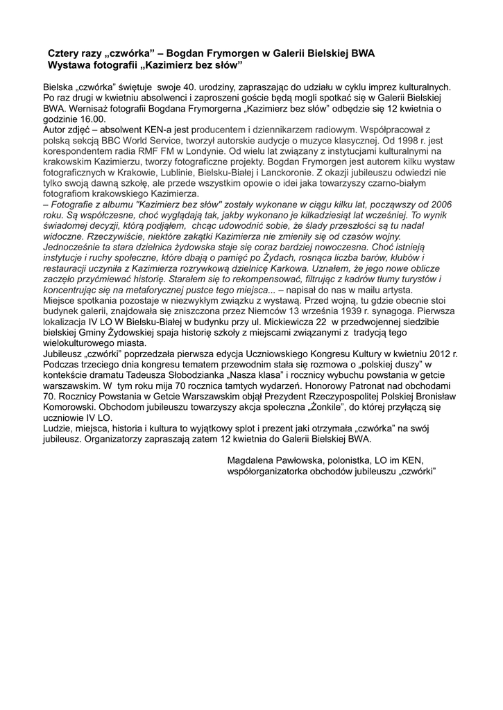 Cztery razy „czwórka” – Bogdan Frymorgen w Galerii Bielskiej BWA Wystawa fotografii „Kazimierz bez słów” Bielska „czwórka” świętuje swoje 40. urodziny, zapraszając do udziału w cyklu imprez kulturalnych. Po raz drugi w kwietniu absolwenci i zaproszeni goście będą mogli spotkać się w Galerii Bielskiej BWA. Wernisaż fotografii Bogdana Frymorgerna „Kazimierz bez słów” odbędzie się 12 kwietnia o godzinie 16.00. Autor zdjęć – absolwent KEN-a jest producentem i dziennikarzem radiowym. Współpracował z polską sekcją BBC World Service, tworzył autorskie audycje o muzyce klasycznej. Od 1998 r. jest korespondentem radia RMF FM w Londynie. Od wielu lat związany z instytucjami kulturalnymi na krakowskim Kazimierzu, tworzy fotograficzne projekty. Bogdan Frymorgen jest autorem kilku wystaw fotograficznych w Krakowie, Lublinie, Bielsku-Białej i Lanckoronie. Z okazji jubileuszu odwiedzi nie tylko swoją dawną szkołę, ale przede wszystkim opowie o idei jaka towarzyszy czarno-białym fotografiom krakowskiego Kazimierza. – Fotografie z albumu "Kazimierz bez słów" zostały wykonane w ciągu kilku lat, począwszy od 2006 roku. Są współczesne, choć wyglądają tak, jakby wykonano je kilkadziesiąt lat wcześniej. To wynik świadomej decyzji, którą podjąłem, chcąc udowodnić sobie, że ślady przeszłości są tu nadal widoczne. Rzeczywiście, niektóre zakątki Kazimierza nie zmieniły się od czasów wojny. Jednocześnie ta stara dzielnica żydowska staje się coraz bardziej nowoczesna. Choć istnieją instytucje i ruchy społeczne, które dbają o pamięć po Żydach, rosnąca liczba barów, klubów i restauracji uczyniła z Kazimierza rozrywkową dzielnicę Karkowa. Uznałem, że jego nowe oblicze zaczęło przyćmiewać historię. Starałem się to rekompensować, filtrując z kadrów tłumy turystów i koncentrując się na metaforycznej pustce tego miejsca... – napisał do nas w mailu artysta. Miejsce spotkania pozostaje w niezwykłym związku z wystawą. Przed wojną, tu gdzie obecnie stoi budynek galerii, znajdowała się zniszczona przez Niemców 13 września 1939 r. synagoga. Pierwsza lokalizacja IV LO W Bielsku-Białej w budynku przy ul. Mickiewicza 22 w przedwojennej siedzibie bielskiej Gminy Żydowskiej spaja historię szkoły z miejscami związanymi z tradycją tego wielokulturowego miasta. Jubileusz „czwórki” poprzedzała pierwsza edycja Uczniowskiego Kongresu Kultury w kwietniu 2012 r. Podczas trzeciego dnia kongresu tematem przewodnim stała się rozmowa o „polskiej duszy” w kontekście dramatu Tadeusza Słobodzianka „Nasza klasa” i rocznicy wybuchu powstania w getcie warszawskim. W tym roku mija 70 rocznica tamtych wydarzeń. Honorowy Patronat nad obchodami 70. Rocznicy Powstania w Getcie Warszawskim objął Prezydent Rzeczypospolitej Polskiej Bronisław Komorowski. Obchodom jubileuszu towarzyszy akcja społeczna „Żonkile”, do której przyłączą się uczniowie IV LO. Ludzie, miejsca, historia i kultura to wyjątkowy splot i prezent jaki otrzymała „czwórka” na swój jubileusz. Organizatorzy zapraszają zatem 12 kwietnia do Galerii Bielskiej BWA. Magdalena Pawłowska, polonistka, LO im KEN, współorganizatorka obchodów jubileuszu „czwórki”