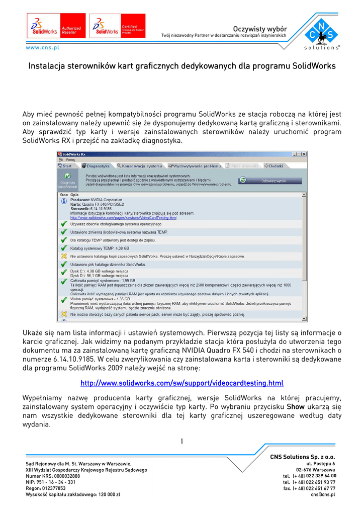 Instalacja sterowników kart graficznych dedykowanych dla programu SolidWorks SolidWorks Aby mieć pewność pełnej kompatybilności programu SolidWorks ze stacja roboczą na której jest on zainstalowany należy upewnić się że dysponujemy dedykowaną kartą graficzną i sterownikami. Aby sprawdzić typ karty i wersje zainstalowanych sterowników należy uruchomić program SolidWorks RX i przejść na zakładkę diagnostyka. Ukaże się nam lista informacji i ustawień systemowych. Pierwszą pozycja tej listy są informacje o karcie graficznej. Jak widzimy na podanym przykładzie stacja która posłużyła do utworzenia tego dokumentu ma za zainstalowaną kartę graficzną NVIDIA Quadro FX 540 i chodzi na sterownikach o numerze 6.14.10.9185. W celu zweryfikowania czy zainstalowana karta i sterowniki są dedykowane dla programu SolidWorks 2009 należy wejść na stronę: http://www.solidworks.com/sw/support/videocardtesting.html Wypełniamy nazwę producenta karty graficznej, wersje SolidWorks na której pracujemy, zainstalowany system operacyjny i oczywiście typ karty. Po wybraniu przycisku Show ukarzą się nam wszystkie dedykowane sterowniki dla tej karty graficznej uszeregowane według daty wydania. 1 W kolumnie Notes umieszczone są ikony charakteryzujące poszczególne sterowniki. Jak widzimy na zamieszczonym przykładzie najodpowiedniejszymi sterownikami dla naszej karty graficznej są sterowniki o numerze 6.14.11.8246 gdyż są one najnowsze i bez żadnych ograniczeń wspierają RealView oraz pracę na dwóch monitorach. W tym przypadku zaleca się przeinstalowanie sterowników. Wszelkie ograniczenia lub zastrzeżenia co do funkcjonowania sterowników, jeżeli występują, są dostępne po kliknięciu ikony View Notes. Jeżeli pracujemy na stacji roboczej to sprawa jest jeszcze prostsza. Wystarczy wybrać producenta stacji roboczej, wersje SolidWorks na którym pracujemy, zainstalowany system operacyjny oraz model stacji roboczej. Zostaną wyświetlone wszystkie dedykowane karty graficzne dla sprawdzanej stacji roboczej do pracy w Solidworks oraz wersje dedykowanych sterowników. W przypadku wystąpienia problemów z wyświetlaniem w programie SolidWorks należy zweryfikować czy u jego podstaw nie leży konflikt sprzętowy karty graficznej bądź sterowników. 2 W tym celu należy uruchomić SolidWorks RX i na zakładce Start wybrać : Kliknij tutaj, aby uruchomić SolidWorks w trybie programowego OpenGL Jeżeli po uruchomieniu SolidWorks problemy z wyświetlaniem zanikną oznacza to że należy zainstalować inne dedykowane sterowniki ze strony SolidWorks.com. Więcej informacji o funkcjonowaniu programu SolidWorks RX dostępne są na naszej stronie internetowej www.CNS.pl w dziale tutoriale. 3