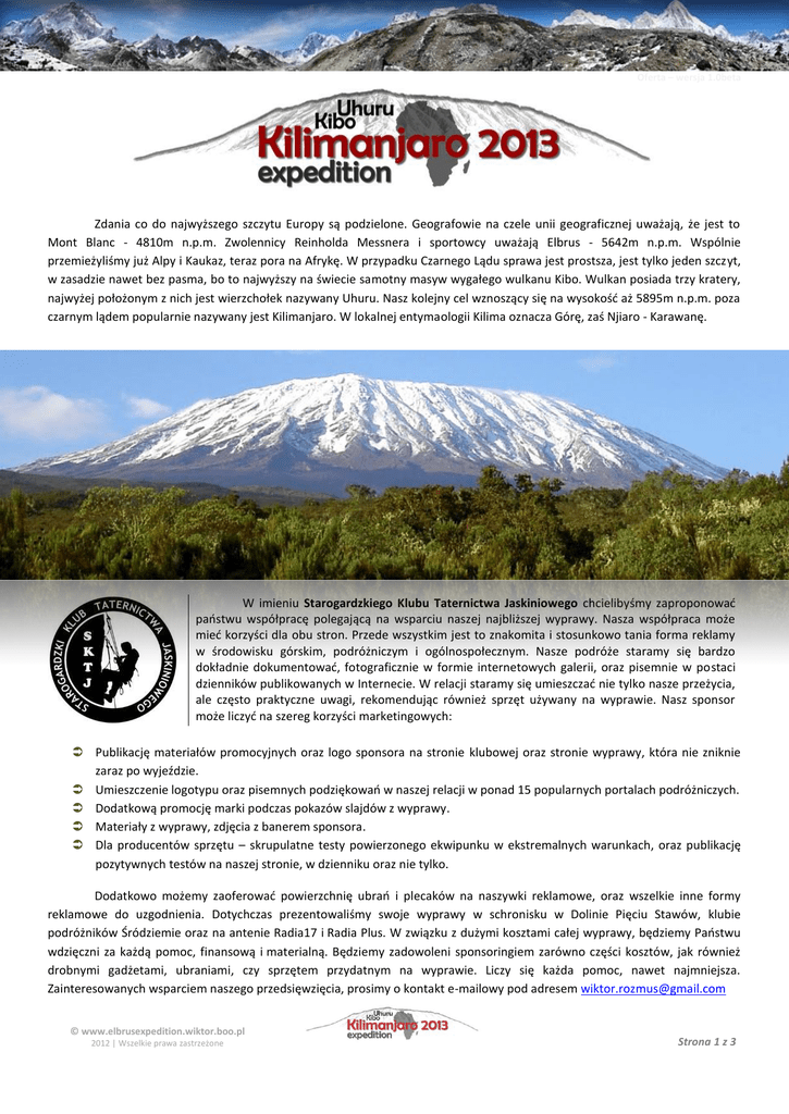 Oferta – wersja 1.0beta Zdania co do najwyższego szczytu Europy są podzielone. Geografowie na czele unii geograficznej uważają, że jest to Mont Blanc - 4810m n.p.m. Zwolennicy Reinholda Messnera i sportowcy uważają Elbrus - 5642m n.p.m. Wspólnie przemieżyliśmy już Alpy i Kaukaz, teraz pora na Afrykę. W przypadku Czarnego Lądu sprawa jest prostsza, jest tylko jeden szczyt, w zasadzie nawet bez pasma, bo to najwyższy na świecie samotny masyw wygałego wulkanu Kibo. Wulkan posiada trzy kratery, najwyżej położonym z nich jest wierzchołek nazywany Uhuru. Nasz kolejny cel wznoszący się na wysokość aż 5895m n.p.m. poza czarnym lądem popularnie nazywany jest Kilimanjaro. W lokalnej entymaologii Kilima oznacza Górę, zaś Njiaro - Karawanę. W imieniu Starogardzkiego Klubu Taternictwa Jaskiniowego chcielibyśmy zaproponować państwu współpracę polegającą na wsparciu naszej najbliższej wyprawy. Nasza współpraca może mieć korzyści dla obu stron. Przede wszystkim jest to znakomita i stosunkowo tania forma reklamy w środowisku górskim, podróżniczym i ogólnospołecznym. Nasze podróże staramy się bardzo dokładnie dokumentować, fotograficznie w formie internetowych galerii, oraz pisemnie w postaci dzienników publikowanych w Internecie. W relacji staramy się umieszczać nie tylko nasze przeżycia, ale często praktyczne uwagi, rekomendując również sprzęt używany na wyprawie. Nasz sponsor może liczyć na szereg korzyści marketingowych: Publikację materiałów promocyjnych oraz logo sponsora na stronie klubowej oraz stronie wyprawy, która nie zniknie zaraz po wyjeździe. Umieszczenie logotypu oraz pisemnych podziękowań w naszej relacji w ponad 15 popularnych portalach podróżniczych. Dodatkową promocję marki podczas pokazów slajdów z wyprawy. Materiały z wyprawy, zdjęcia z banerem sponsora. Dla producentów sprzętu – skrupulatne testy powierzonego ekwipunku w ekstremalnych warunkach, oraz publikację pozytywnych testów na naszej stronie, w dzienniku oraz nie tylko. Dodatkowo możemy zaoferować powierzchnię ubrań i plecaków na naszywki reklamowe, oraz wszelkie inne formy reklamowe do uzgodnienia. Dotychczas prezentowaliśmy swoje wyprawy w schronisku w Dolinie Pięciu Stawów, klubie podróżników Śródziemie oraz na antenie Radia17 i Radia Plus. W związku z dużymi kosztami całej wyprawy, będziemy Państwu wdzięczni za każdą pomoc, finansową i materialną. Będziemy zadowoleni sponsoringiem zarówno części kosztów, jak również drobnymi gadżetami, ubraniami, czy sprzętem przydatnym na wyprawie. Liczy się każda pomoc, nawet najmniejsza. Zainteresowanych wsparciem naszego przedsięwzięcia, prosimy o kontakt e-mailowy pod adresem [email protected] © www.elbrusexpedition.wiktor.boo.pl 2012 | Wszelkie prawa zastrzeżone Strona 1 z 3 Kim jesteśmy? W skrócie …jesteśmy grupą młodych, ambitnych ludzi, kochających góry i wyprawy. Działamy pod skrzydłami Starogardzkiego Klubu Taternictwa Jaskiniowego, zapewnia nam to profesjonalne podejście w tym co robimy. W większości poznaliśmy się przez Internet i mimo, iż dzieli nas długość całej Polski, staramy się często spotykać na różnych wyjazdach. Wiktor Kaśka Rafał Marcin Grzegorz Kaśka Gdańsk Podróżnik, fotoamator, licencjonowany pilot i przewodnik wycieczek. Absolwent kursu wspinaczki skalnej oraz taternictwa jaskiniowego. Członek Klubu Wysokogórskiego Kraków. Na co dzień informatyk pracujący za biurkiem. W swej karierze odwiedził wiele pasm górskich, między innymi Himalaje i Alpy. Gdańsk Starogard Gdański Licencjonowany taternik jaskiniowy i Prezes Starogardzkiego Klubu Taternictwa Jaskiniowego. Od młodości zapalony grotołaz i miłośnik gór, nie tylko Tatr. W swej karierze odwiedził między innymi rumuńskie Munţii Făgăraş, Munţii Retezat, Tatry słowackie a ostatnio nawet Himalaje i Alpy. Starogard Gdański Prywatny przedsiębiorca, taternik jaskiniowy, od młodości wspina się po górach i jaskiniach, na co kiedyś przeznaczał wszystkie zarobione przez siebie pieniądze. Dobrze zna Tatry jak i Himalaje. Obecnie prowadzi własną firmę zajmującą się pracami wysokościowymi. Starogard Gdański Towarzyszy Marcinowi i Rafałowi od początku eksploracji jaskiń, gdzie zdobył doświadczenie i bardzo dobre obeznanie z technikami linowymi. Od kilku lat aktywnie chodzi po górach, porwie się na każdy, nie ważne jak odważny plan. Kraków Przyszły filolog szwedzki zakochany w Skandynawii. Chodzi po górach od 6 roku życia, na początku wnoszona na barana, potem o własnych siłach. Na razie Beskidy i Tatry, ze szczególnym umiłowaniem Bieszczad i Beskidu Sądeckiego. Była też w górach skandynawskich: Szwecja – Vindelfjaellen oraz norweskich Hardangervidda. Zw ykształcenia informatyk i ekonomista, obecnie pracuje w bankowości. Mimo, iż do gór musi przejechać całą Polskę, często je odwiedza. Poza polskimi górami odwiedziła między innymi Atlas wysoki gdzie zdobyła najwyższy szczyt pasma. Doświadczona globtroterka z praktyką wspinaczkową. Dlaczego my? Marketingowo mamy najwięcej do zaoferowania. Klasyczna forma reklamy w sieci jest dużo droższa. Każde wyświetlenie bannera czy linku do strony internetowej kosztuje. Ponadto taki marketing jest ograniczony czasowo, nasze relacje nie są. Będą krążyć w sieci i będą jeszcze długo czytane przez następnych chętnych zdobywców najwyższego szczytu Europy. Dużo kosztowniejsze wyprawy mają medialnie mniej do zaoferowania niż nasza ekspedycja. Zachęcamy do odwiedzin naszej strony internetowej www.elbrusexpedition.wiktor.boo.pl gdzie można przeczytać wszystkie szczegóły naszej obecnej oraz poprzednich wypraw. © www.elbrusexpedition.wiktor.boo.pl 2012 | Wszelkie prawa zastrzeżone Strona 2 z 3 Nasze publikacje Nasze dotychczasowe publikacje to „Himalaje Nepalu Drogą do Everest Base Camp”, „Z dachu Europy – Mont Blanc” oraz „K