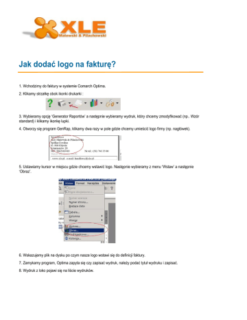 Jak dodać logo na fakturę? 1. Wchodzimy do faktury w systemie Comarch Optima. 2. Klikamy strzałkę obok ikonki drukarki : 3. Wybieramy opcję ‘Generator Raportów’ a następnie wybieramy wydruk, który chcemy zmodyfikować (np.. Wzór standard) i klikamy ikonkę lupki. 4. Otworzy się program GenRap, klikamy dwa razy w pole gdzie chcemy umieścić logo firmy (np. nagłówek). 5. Ustawiamy kursor w miejscu gdzie chcemy wstawić logo. Następnie wybieramy z menu ‘Wstaw’ a następnie ‘Obraz’. 6. Wskazujemy plik na dysku po czym nasze logo wstawi się do definicji faktury. 7. Zamykamy program, Optima zapyta się czy zapisać wydruk, należy podać tytuł wydruku i zapisać. 8. Wydruk z loko pojawi się na liście wydruków.
