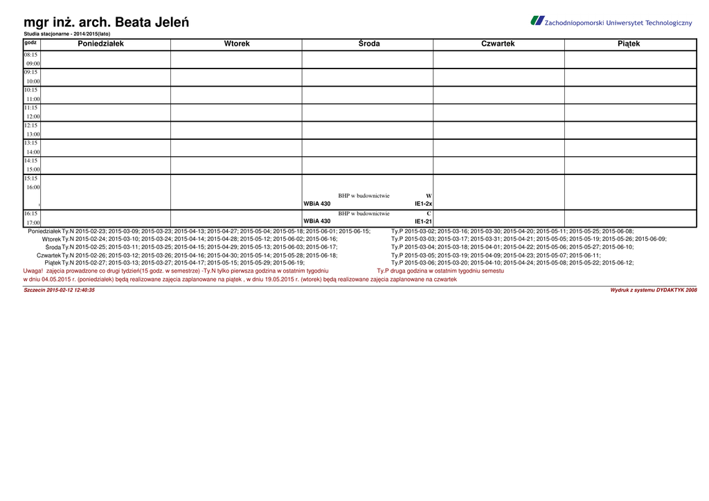 mgr inż. arch. Beata Jeleń Studia stacjonarne - 2014/2015(lato) godz Poniedziałek Wtorek Czwartek Środa Piątek 08:15 09:00 09:15 10:00 10:15 11:00 11:15 12:00 12:15 13:00 13:15 14:00 14:15 15:00 15:15 16:00 15:15 16:00 16:15 BHP w budownictwie WBiA 430 W IE1-2x BHP w budownictwie C WBiA 430 IE1-21 17:00 Poniedziałek Ty.N 2015-02-23; 2015-03-09; 2015-03-23; 2015-04-13; 2015-04-27; 2015-05-04; 2015-05-18; 2015-06-01; 2015-06-15; Ty.P 2015-03-02; 2015-03-16; 2015-03-30; 2015-04-20; 2015-05-11; 2015-05-25; 2015-06-08; Ty.P 2015-03-03; 2015-03-17; 2015-03-31; 2015-04-21; 2015-05-05; 2015-05-19; 2015-05-26; 2015-06-09; Wtorek Ty.N 2015-02-24; 2015-03-10; 2015-03-24; 2015-04-14; 2015-04-28; 2015-05-12; 2015-06-02; 2015-06-16; Ty.P 2015-03-04; 2015-03-18; 2015-04-01; 2015-04-22; 2015-05-06; 2015-05-27; 2015-06-10; Środa Ty.N 2015-02-25; 2015-03-11; 2015-03-25; 2015-04-15; 2015-04-29; 2015-05-13; 2015-06-03; 2015-06-17; Czwartek Ty.N 2015-02-26; 2015-03-12; 2015-03-26; 2015-04-16; 2015-04-30; 2015-05-14; 2015-05-28; 2015-06-18; Ty.P 2015-03-05; 2015-03-19; 2015-04-09; 2015-04-23; 2015-05-07; 2015-06-11; Piątek Ty.N 2015-02-27; 2015-03-13; 2015-03-27; 2015-04-17; 2015-05-15; 2015-05-29; 2015-06-19; Ty.P 2015-03-06; 2015-03-20; 2015-04-10; 2015-04-24; 2015-05-08; 2015-05-22; 2015-06-12; Uwaga! zajęcia prowadzone co drugi tydzień(15 godz. w semestrze) -Ty.N tylko pierwsza godzina w ostatnim tygodniu Ty.P druga godzina w ostatnim tygodniu semestu w dniu 04.05.2015 r. (poniedziałek) będą realizowane zajęcia zaplanowane na piątek , w dniu 19.05.2015 r. (wtorek) będą realizowane zajęcia zaplanowane na czwartek Szczecin 2015-02-12 12:40:35 Wydruk z systemu DYDAKTYK 2008