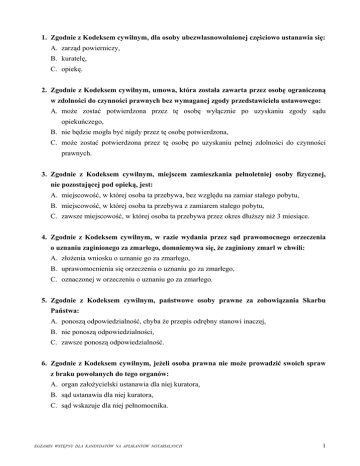 1. Zgodnie z Kodeksem cywilnym, dla osoby ubezwłasnowolnionej częściowo ustanawia się: A. zarząd powierniczy, B. kuratelę, C. opiekę. 2. Zgodnie z Kodeksem cywilnym, umowa, która została zawarta przez osobę ograniczoną w zdolności do czynności prawnych bez wymaganej zgody przedstawiciela ustawowego: A. może zostać potwierdzona przez tę osobę wyłącznie po uzyskaniu zgody sądu opiekuńczego, B. nie będzie mogła być nigdy przez tę osobę potwierdzona, C. może zostać potwierdzona przez tę osobę po uzyskaniu pełnej zdolności do czynności prawnych. 3. Zgodnie z Kodeksem cywilnym, miejscem zamieszkania pełnoletniej osoby fizycznej, nie pozostającej pod opieką, jest: A. miejscowość, w której osoba ta przebywa, bez względu na zamiar stałego pobytu, B. miejscowość, w której osoba ta przebywa z zamiarem stałego pobytu, C. zawsze miejscowość, w której osoba ta przebywa przez okres dłuższy niż 3 miesiące. 4. Zgodnie z Kodeksem cywilnym, w razie wydania przez sąd prawomocnego orzeczenia o uznaniu zaginionego za zmarłego, domniemywa się, że zaginiony zmarł w chwili: A. złożenia wniosku o uznanie go za zmarłego, B. uprawomocnienia się orzeczenia o uznaniu go za zmarłego, C. oznaczonej w orzeczeniu o uznaniu go za zmarłego. 5. Zgodnie z Kodeksem cywilnym, państwowe osoby prawne za zobowiązania Skarbu Państwa: A. ponoszą odpowiedzialność, chyba że przepis odrębny stanowi inaczej, B. nie ponoszą odpowiedzialności, C. zawsze ponoszą odpowiedzialność. 6. Zgodnie z Kodeksem cywilnym, jeżeli osoba prawna nie może prowadzić swoich spraw z braku powołanych do tego organów: A. organ założycielski ustanawia dla niej kuratora, B. sąd ustanawia dla niej kuratora, C. sąd wskazuje dla niej pełnomocnika. EGZAMIN WSTĘPNY DLA KANDYDATÓW NA APLIKANTÓW NOTARIALNYCH 1 7. W rozumieniu Kodeksu cywilnego, rzeczami są: A. przedmioty materialne i ustanowione na nich prawa, B. tylko przedmioty materialne, C. przedmioty materialne i energia. 8. Zgodnie z Kodeksem cywilnym, prawa związane z własnością nieruchomości uważa się za: A. części składowe nieruchomości, B. przynależności nieruchomości, C. pożytki prawa z nieruchomości. 9. Zgodnie z Kodeksem cywilnym, za gospodarstwo rolne uważa się: A. grunty rolne wraz z gruntami leśnymi, budynkami lub ich częściami, urządzeniami i inwentarzem, jeżeli stanowią lub mogą stanowić zorganizowaną całość gospodarczą, oraz prawami związanymi z prowadzeniem gospodarstwa rolnego, B. wyłącznie nieruchomości rolne o obszarze powyżej 1 ha, które są lub mogą być wykorzystywane do prowadzenia działalności wytwórczej w rolnictwie, C. wyłącznie użytki rolne wraz z urządzeniami, inwentarzem i budynkami, w których rolnik ma miejsce zamieszkania. 10. Zgodnie z Kodeksem cywilnym, oświadczenie woli wyrażone w postaci elektronicznej jest złożone innej osobie z chwilą, gdy: A. osoba ta potwierdzi, że zapoznała się z treścią złożonego jej oświadczenia, B. wprowadzono je do środka komunikacji elektronicznej w taki sposób, żeby osoba ta mogła zapoznać się z jego treścią, C. osoba ta oświadczy, że przyjmuje to oświadczenie. 11. Zgodnie z Kodeksem cywilnym, zbycie przedsiębiorstwa powinno być dokonane w formie: A. pisemnej pod rygorem nieważności, o ile nie uchybia to przepisom o formie czynności prawnych dotyczących nieruchomości, B. pisemnej z podpisami notarialnie poświadczonymi, o ile nie uchybia to przepisom o formie czynności prawnych dotyczących nieruchomości, C. pisemnej dla celów dowodowych, o ile nie uchybia to przepisom o formie czynności prawnych dotyczących nieruchomości. 2 EGZAMIN WSTĘPNY DLA KANDYDATÓW NA APLIKANTÓW NOTARIALNYCH 12. Zgodnie z Kodeksem cywilnym, oświadczenie woli o udzieleniu pełnomocnictwa ogólnego złożone przez osobę nie mogącą czytać, powinno być złożone: A. w formie pisemnej, B. w formie pisemnej z podpisem notarialnie poświadczonym, C. w formie aktu notarialnego. 13. Zgodnie z Kodeksem cywilnym, warunek niemożliwy pociąga za sobą nieważność czynności prawnej: A. gdy jest zawieszający, B. gdy jest rozwiązujący, C. zarówno wówczas, gdy jest zawieszający, jak i gdy jest rozwiązujący. 14. Zgodnie z Kodeksem cywilnym, jeżeli do ważności czynności prawnej dokonywanej w imieniu osoby niebędącej przedsiębiorcą potrzebna jest szczególna forma, pełnomocnictwo do dokonania tej czynności powinno być udzielone: A. zawsze na piśmie, B. w tej samej szczególnej formie, C. zawsze w formie aktu notarialnego. 15. Zgodnie z Kodeksem cywilnym, okoliczność, że pełnomocnik jest ograniczony w zdolności do czynności prawnych: A. skutkuje koniecznością potwierdzenia przez mocodawcę czynności dokonanej w jego imieniu przez pełnomocnika, B. skutkuje koniecznością potwierdzenia przez pełnomocnika, po osiągnięciu przez niego pełnej zdolności do czynności prawnych, czynności dokonanej w imieniu mocodawcy, C. nie ma wpływu na ważność czynności dokonanej przez niego w imieniu mocodawcy. 16. Zgodnie z Kodeksem cywilnym, umowa zawarta przez pełnomocnika, działającego w granicach pierwotnego umocowania, ale po wygaśnięciu umocowania: A. jest zawsze ważna, B. jest ważna, chyba że druga strona umowy o wygaśnięciu umocowania wiedziała lub z łatwością mogła się dowiedzieć, C. jest zawsze nieważna. EGZAMIN WSTĘPNY DLA KANDYDATÓW NA APLIKANTÓW NOTARIALNYCH 3 17. Zgodnie z Kodeksem cywilnym, prokurent może zbyć przedsiębiorstwo spółki, której jest prokurentem: A. tylko na podstawie pełnomocnictwa do tej czynności, B. na podstawie samej prokury, C. na podstawie samej prokury z podpisem notarialnie poświadczonym. 18. Zgodnie z Kodeksem cywilnym, prokura: A. zawsze może być przeniesiona, B. nie może być przeniesiona, C. może być przeniesiona, o ile wynika to z treści prokury. 19. Zgodnie z Kodeksem cywilnym, przez czynność prawną terminy przedawn