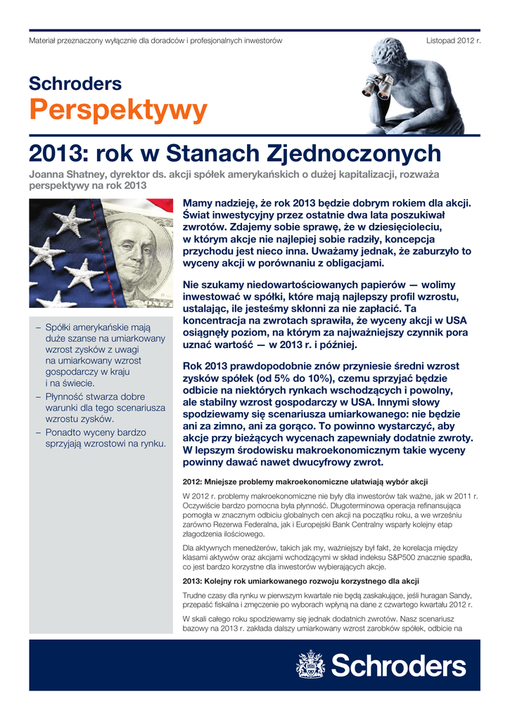Materiał przeznaczony wyłącznie dla doradców i profesjonalnych inwestorów Listopad 2012 r. Schroders Perspektywy 2013: rok w Stanach Zjednoczonych Joanna Shatney, dyrektor ds. akcji spółek amerykańskich o dużej kapitalizacji, rozważa perspektywy na rok 2013 Mamy nadzieję, że rok 2013 będzie dobrym rokiem dla akcji. Świat inwestycyjny przez ostatnie dwa lata poszukiwał zwrotów. Zdajemy sobie sprawę, że w dziesięcioleciu, w którym akcje nie najlepiej sobie radziły, koncepcja przychodu jest nieco inna. Uważamy jednak, że zaburzyło to wyceny akcji w porównaniu z obligacjami. – Spółki amerykańskie mają duże szanse na umiarkowany wzrost zysków z uwagi na umiarkowany wzrost gospodarczy w kraju i na świecie. – Płynność stwarza dobre warunki dla tego scenariusza wzrostu zysków. – Ponadto wyceny bardzo sprzyjają wzrostowi na rynku. Nie szukamy niedowartościowanych papierów — wolimy inwestować w spółki, które mają najlepszy profil wzrostu, ustalając, ile jesteśmy skłonni za nie zapłacić. Ta koncentracja na zwrotach sprawiła, że wyceny akcji w USA osiągnęły poziom, na którym za najważniejszy czynnik pora uznać wartość — w 2013 r. i później. Rok 2013 prawdopodobnie znów przyniesie średni wzrost zysków spółek (od 5% do 10%), czemu sprzyjać będzie odbicie na niektórych rynkach wschodzących i powolny, ale stabilny wzrost gospodarczy w USA. Innymi słowy spodziewamy się scenariusza umiarkowanego: nie będzie ani za zimno, ani za gorąco. To powinno wystarczyć, aby akcje przy bieżących wycenach zapewniały dodatnie zwroty. W lepszym środowisku makroekonomicznym takie wyceny powinny dawać nawet dwucyfrowy zwrot. 2012: Mniejsze problemy makroekonomiczne ułatwiają wybór akcji W 2012 r. problemy makroekonomiczne nie były dla inwestorów tak ważne, jak w 2011 r. Oczywiście bardzo pomocna była płynność. Długoterminowa operacja refinansująca pomogła w znacznym odbiciu globalnych cen akcji na początku roku, a we wrześniu zarówno Rezerwa Federalna, jak i Europejski Bank Centralny wsparły kolejny etap złagodzenia ilościowego. Dla aktywnych menedżerów, takich jak my, ważniejszy był fakt, że korelacja między klasami aktywów oraz akcjami wchodzącymi w skład indeksu S&P500 znacznie spadła, co jest bardzo korzystne dla inwestorów wybierających akcje. 2013: Kolejny rok umiarkowanego rozwoju korzystnego dla akcji Trudne czasy dla rynku w pierwszym kwartale nie będą zaskakujące, jeśli huragan Sandy, przepaść fiskalna i zmęczenie po wyborach wpłyną na dane z czwartego kwartału 2012 r. W skali całego roku spodziewamy się jednak dodatnich zwrotów. Nasz scenariusz bazowy na 2013 r. zakłada dalszy umiarkowany wzrost zarobków spółek, odbicie na Perspektywy na rok 2013: rok w Stanach Zjednoczonych „Dla wszystkich śledzących sytuację w USA staje się coraz bardziej jasne, że na rynku nieruchomości — który przez długi czas bardzo spowalniał wzrost — wkrótce nastąpi zwrot.” „Stany Zjednoczone mają większe możliwości rozwiązywania problemów fiskalnych niż inne rynki rozwinięte, ponieważ amerykańska gospodarka ma największe szanse na aktywny wzrost.” niektórych rynkach wschodzących oraz powolny, ale stabilny wzrost gospodarczy w USA. Sprzyjać temu będzie płynność, podwójny cel Rezerwy Federalnej, silny sektor przedsiębiorstw oraz korzyści dla konsumentów płynące z silnych bilansów i potencjalnie większego zatrudnienia. Dla wszystkich śledzących sytuację w USA staje się coraz bardziej jasne, że na rynku nieruchomości — który przez długi czas bardzo spowalniał wzrost — wkrótce nastąpi zwrot. Sądzimy, że korzyści z tego są bardzo niedoceniane przez inwestorów, jeśli wziąć pod uwagę ich możliwy wpływ na gospodarkę. Należymy również do zwolenników hipotezy, że sytuacja na rynku pracy poprawi się w nadchodzącym roku — PKB rośnie, ale pracowników w USA jest o 4–5 mln mniej. Uważamy, że jest to stan nie do utrzymania. Oczywiście nadal uważamy na ryzyko związane z przepaścią fiskalną oraz optymizmem konsumentów i przedsiębiorstw — ożywienie gospodarcze wciąż jest bardzo niepewne. Rynek jednak odzwierciedla te niepokoje. Wszystko to nie zwiększyło jeszcze przepływów w stronę akcji. Mamy nadzieję, że w 2013 r. będzie inaczej. Obligacje osiągnęły poziom, na którym uzyskanie dodatniego zwrotu z kapitału będzie trudniejsze. Wyceny sprzyjają zwrotom długoterminowym Przez ostatnie 20 lat obrót akcjami z indeksu S&P 500 odbywał się w zakresie od 10-krotności do 20-krotności prognozowanych zysków (P/E) przy średniej na poziomie 13,7. Naszym zdaniem wzrost zysków w wysokości od 5% do 10% w przyszłym roku zmniejszy wskaźnik P/E poniżej 13-krotności. W przeszłości taka sytuacja prowadziła do dwucyfrowych zwrotów z akcji. Inwestycje zakładane, gdy wskaźnik P/E był niski, dawały zazwyczaj lepsze zwroty. Prognozowany wskaźnik P/E <10x 10X –12X 12X –14X 14X –16X 16X –18X 18X –20X 20X –22X >22X Średni zwrot 15% 14,7% 12,6% 12,5% 9,9% 8,8% 5,4% 3,5% Źródło: Goldman Sachs Inne rynki rozwinięte mogą być „tańsze”, ale uważamy rynek w USA za bardzo atrakcyjny z uwagi na możliwy wzrost PKB, wsparcie ze strony Rezerwy Federalnej i długoterminowe czynniki wzrostu przedstawione poniżej. Wyceny są jeszcze bardziej interesujące przy porównaniu akcji z obligacjami — przy takich różnicach oprocentowania osiągnięcie dodatniego zwrotu z kapitału wydaje się trudniejsze. Oczywiście sytuacja taka może się utrzymać, ale sądzimy, że długoterminowym inwestorom akcje mogą przynieść znacznie większe korzyści niż obligacje. Zwroty z obligacji i odpowiadające im wskaźniki Implikowany wskaźnik Zwroty S&P 500 Implikowany wskaźnik Zwroty S&P 500 12,7x 9,9% B 10,1x 13,6x 6,0% B 16,6x 4,7% Baa 21,6x 5,3% Baa 18,9x 1,7% 10-letnie 58,1x 1,8% 10-letnie 55,6x Paździer