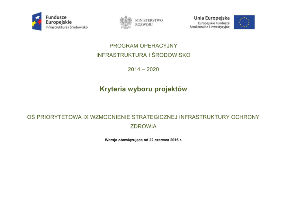 PROGRAM OPERACYJNY INFRASTRUKTURA I ŚRODOWISKO 2014 – 2020 Kryteria wyboru projektów OŚ PRIORYTETOWA IX WZMOCNIENIE STRATEGICZNEJ INFRASTRUKTURY OCHRONY ZDROWIA Wersja obowiązująca od 22 czerwca 2016 r. DZIAŁANIE 9.2. Infrastruktura ponadregionalnych podmiotów leczniczych wersja obowiązująca 22 czerwca 2016 r. W ramach Programu Operacyjnego Infrastruktura i Środowisko przewidziano następujące tryby wyboru projektów: tryb konkursowy; tryb pozakonkursowy. W przypadku projektów „dużych”1, niezależnie od trybu wyboru dofinansowanie projektu wymaga potwierdzenia przez Komisję Europejską (po spełnieniu wymogów opisanych w art. 100-103 rozporządzenia ogólnego). Niezależnie od trybu wyboru projektu projekty oceniane są: kryteriami formalnymi - ocena zerojedynkowa, niespełnienie kryterium powoduje wykluczenie projektu z (dalszej) oceny, oraz kryteriami merytorycznymi, tj. o kryteriami merytorycznymi I stopnia – ocena punktowa (premia w postaci określonej liczby punktów), niespełnienie kryterium nie powoduje wykluczenia projektu z (dalszej) oceny, lub o kryteriami merytorycznymi II stopnia - ocena zerojedynkowa, niespełnienie kryterium powoduje wykluczenie projektu z (dalszej) oceny. Procedury wyboru i zatwierdzania operacji (projektów) są szczegółowo określone w dokumencie System oceny i wyboru projektów w ramach Programu Operacyjnego Infrastruktura i Środowisko 2014-2020, stanowiącym załącznik nr 6 do Szczegółowego opisu osi priorytetowych POIiŚ 2014-2020. Zgodnie z art. 43 ust. 1 ustawy w razie stwierdzenia we wniosku o dofinansowanie braków formalnych (np. brak podpisu, brak pieczęci) lub oczywistych omyłek (np. błąd rachunkowy, błąd pisarski), właściwa instytucja wzywa wnioskodawcę do uzupełnienia wniosku lub poprawienia w nim oczywistej omyłki w wyznaczonym terminie nie krótszym niż 7 dni, pod rygorem pozostawienia wniosku bez rozpatrzenia i w konsekwencji niedopuszczenie projektu do oceny lub dalszej oceny Instytucja organizująca konkurs może określić w regulaminie konkursu sposób i tryb uzupełniania/modyfikacji wniosku aplikacyjnego na etapie jego oceny, z zastrzeżeniem, że modyfikacja ta nie spowoduje nierównego traktowania wnioskodawców. Wszystkie projekty w ramach osi I-IX POIiŚ oceniane będą kryteriami horyzontalnymi oraz kryteriami sektorowymi przyjętymi dla danego działania /poddziałania / typu projektu. Wszystkie projekty w ramach osi X POIiŚ oceniane będą wyłącznie kryteriami przyjętymi dla danego działania. 1 o których mowa w art. 100. Rozporządzenia Parlamentu Europejskiego i Rady (UE) nr 1303/2013 z dnia 17 grudnia 2013 r. ustanawiającego wspólne przepisy dotyczące Europejskiego Funduszu Rozwoju Regionalnego, Europejskiego Funduszu Społecznego, Funduszu Spójności, Europejskiego Funduszu Rolnego na rzecz Rozwoju Obszarów Wiejskich oraz Europejskiego Funduszu Morskiego i Rybackiego objętych zakresem wspólnych ram strategicznych oraz ustanawiającego przepisy ogólne dotyczące Europejskiego Funduszu Rozwoju Regionalnego, Europejskiego Funduszu Społecznego i Funduszu Spójności oraz uchylającego rozporządzenie Rady (WE) nr 1083/2006 (dalej rozporządzenie ogólne). 2 DZIAŁANIE 9.2. Infrastruktura ponadregionalnych podmiotów leczniczych wersja obowiązująca 22 czerwca 2016 r. Horyzontalne kryteria formalne NR NAZWA KRYTERIUM OPIS KRYTERIUM TAK/NIE/ NIE DOTYCZY 1. 2. 3. 4. 5. 6. 2 Wniosek złożony w terminie2. Termin składania wniosków, w przypadku projektów konkursowych podany jest w ogłoszeniu o konkursie. Datę złożenia wniosku dla projektów wybieranych w trybie pozakonkursowym określa IP/IW indywidualnie dla każdego projektu w wezwaniu do złożenia wniosku o dofinansowanie (o którym mowa w art. 48 ust 1 ustawy wdrożeniowej).. Wniosek sporządzono na obowiązującym Formularz wniosku dostępny jest na stronach internetowych instytucji organizujących nabór wniosków, do formularzu. których odwołanie zawiera się w ogłoszeniu o naborze projektów lub w wezwaniu do złożenia wniosku o dofinansowanie. Formularz dotyczący projektów pomocy technicznej dystrybuowany będzie indywidualnie do potencjalnych beneficjentów (wnioskodawców). Wniosek wypełniony jest w języku polskim. Informacje w treści wniosku spełniają wymogi ustawy z dnia 7 października 1999 r. o języku polskim. Tytuł i opis projektu w jasny i nie budzący wątpliwości sposób powinien obrazować faktyczne zadanie lub realizację pewnego etapu większego przedsięwzięcia, które zostanie w określonych ramach zrealizowane. Zgodność z realizacją zasady n+3. W ramach kryterium ocenie podlega, czy harmonogram realizacji projektu nie narusza zasady n+3 w zakresie kwalifikowalności wydatków. Kompletność dokumentacji aplikacyjnej: Rodzaj załączników do wniosku o dofinansowanie i zakres informacji wymaganych w dokumentacji wniosku i załączników. aplikacyjnej dla projektów wybieranych: - w trybie konkursowym zawarty jest w ogłoszeniu o konkursie. - w trybie pozakonkursowym określa instytucja przyjmująca wniosek. Kryterium nie ma zastosowania do braków formalnych lub oczywistych omyłek, o których mowa w art. 43 ustawy wdrożeniowej, zgodnie z którym właściwa instytucja wzywa wnioskodawcę do uzupełnienia wniosku lub poprawienia w nim oczywistej omyłki w wyznaczonym terminie nie krótszym niż 7 dni, pod rygorem pozostawienia wniosku bez rozpatrzenia Załączniki do wniosku są ważne i zgodne z odpowiednimi polskimi oraz unijnymi przepisami, szczególnie jeśli chodzi o przepisy o ochronie środowiska, przepisy ustawy z dnia 27 marca 2003 r. o planowaniu i zagospodarowaniu przestrzennym, ustawy z 7 lipca 1994 r. Prawo budowlane. Zgodność z Programem Operacyjnym Warunkiem spełnienia kryterium jest zapewnienie zgodności projektu co najmniej w zakresie: Infrastruktura i Środowisko, „Szczegółowym - Typ/rodzaj projektu jest zgodny z przewidzianym w szczegółowym opisie 