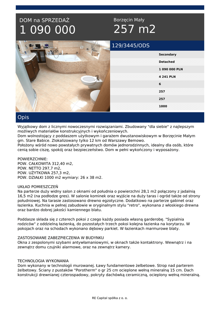 Borzęcin Mały DOM na SPRZEDAŻ 257 m2 1 090 000 129/3445/ODS Secondary Detached 1 090 000 PLN 4 241 PLN 6 257 257 1000 Opis Wyjątkowy dom z licznymi nowoczesnymi rozwiązaniami. Zbudowany "dla siebie" z najlepszym możliwych materiałów konstrukcyjnych i wykończeniowych. Dom wolnostojący z poddaszem użytkowym i garażem dwustanowiskowym w Borzęcinie Małym gm. Stare Babice. Zlokalizowany tylko 12 km od Warszawy Bemowo. Położony wśród nowo powstałych prywatnych domów jednorodzinnych, idealny dla osób, które cenią sobie ciszę, spokój oraz bezpieczeństwo. Dom w pełni wykończony i wyposażony. POWIERZCHNIE: POW. CAŁKOWITA 312,40 m2, POW. NETTO 297,7 m2, POW. UŻYTKOWA 257,3 m2, POW. DZIAŁKI 1000 m2 wymiary: 26 x 38 m2. UKŁAD POMIESZCZEŃ Na parterze duży widny salon z oknami od południa o powierzchni 28,1 m2 połączony z jadalnią 16,5 m2 (na podłodze gres). W salonie kominek oraz wyjście na duży taras i ogród także od strony południowej. Na tarasie zastosowano drewno egzotyczne. Dodatkowo na parterze gabinet oraz łazienka. Kuchnia w pełnej zabudowie w oryginalnym stylu "retro", wykonana z włoskiego drewna oraz bardzo dobrej jakości kamiennego blatu. Poddasze składa się z czterech pokoi z czego każdy posiada własną garderobę. "Sypialnia rodziców" z oddzielną łazienką, do pozostałych trzech pokoi kolejna łazienka na korytarzu. W pokojach oraz na schodach wykonano dębowy parkiet. W łazienkach marmurowe blaty. ZASTOSOWANE ZABEZPIECZENIA W BUDYNKU Okna z zespolonymi szybami antywłamaniowymi, w oknach także kontaktrony. Wewnątrz i na zewnątrz domu czujniki alarmowe, oraz na zewnątrz kamery. TECHNOLOGIA WYKONANIA Dom wykonany w technologii murowanej. Ławy fundamentowe żelbetowe. Strop nad parterem żelbetowy. Ściany z pustaków "Porotherm" o gr 25 cm ocieplone wełną mineralną 15 cm. Dach konstrukcji drewnianej czterospadowy, pokryty dachówką ceramiczną, ocieplony wełną mineralną. RE Capital spółka z o. o. Dom jest ogrzewany za pomocą pieca gazowego z zasobnikiem, który ogrzewa także ciepłą wodę użytkową. Na parterze w salonie, jadalni i łazienkch ogrzewanie podłogowe. Kominek z płaszczem wodnym, dodatkowo została rozprowadzona i podłączona instalacja do solarów słonecznych. Zapraszamy do oglądania. RE Capital Nieruchomości mail: [email protected] NATALIA UKLEJEWSKA tel. +48 500435150 tel. 22 243 19 04 email: [email protected] RE Capital spółka z o. o. Powered by TCPDF (www.tcpdf.org)