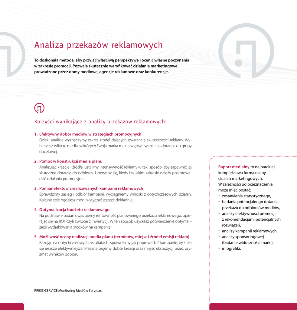 Analiza przekazów reklamowych To doskonała metoda, aby przyjąć właściwą perspektywę i ocenić własne poczynania w zakresie promocji. Pozwala skutecznie weryfikować działania marketingowe prowadzone przez domy mediowe, agencje reklamowe oraz konkurencję. Korzyści wynikające z analizy przekazów reklamowych: 1. Efektywny dobór mediów w strategiach promocyjnych Dzięki analizie wyznaczymy zakres źródeł dających gwarancję skuteczności reklamy. Wybierzesz tylko te media, w których Twoja marka ma największe szanse na dotarcie do grupy docelowej. 2. Pomoc w konstrukcji media planu Analizując kreacje i źródła, ustalimy intensywność reklamy w taki sposób, aby zapewnić jej skuteczne dotarcie do odbiorcy. Upewnisz się, kiedy i w jakim zakresie należy przeprowadzić działania promocyjne. 3. Pomiar efektów zrealizowanych kampanii reklamowych Sprawdzimy zasięg i odbiór kampanii, wyciągniemy wnioski z dotychczasowych działań. Kolejne cele będziesz mógł wytyczać jeszcze dokładniej. 4. Optymalizacja budżetu reklamowego Na podstawie badań oszacujemy rentowność planowanego przekazu reklamowego, opierając się na ROI, czyli zwrocie z inwestycji. W ten sposób uzyskasz potwierdzenie optymalizacji wydatkowania środków na kampanię. 5. Możliwość oceny realizacji media planu (terminów, miejsc i źródeł emisji reklam) Bazując na dotychczasowych rezultatach, sprawdzimy jak poprowadzić kampanię, by stała się jeszcze efektywniejsza. Przeanalizujemy dobór kreacji oraz miejsc ekspozycji przez pryzmat wyników odbioru. PRESS-SERVICE Monitoring Mediów Sp. z o.o. Raport medialny to najbardziej kompleksowa forma oceny działań marketingowych. W zależności od przeznaczenia może mieć postać: zestawienia statystycznego, badania potencjalnego dotarcia przekazu do odbiorców mediów, analizy efektywności promocji z rekomendacjami potencjalnych rozwiązań, analizy kampanii reklamowych, analizy sponsoringowej (badanie widoczności marki), infografiki. S jak… SKUTECZNOŚĆ 6. Pomoc w przygotowaniach udziału w przetargu na usługę mediową Analizując dotychczasową identyfikację marki w mediach, pomożemy przygotować kompleksową ofertę, z którą masz szansę wygrać przetarg. Od strategii kampanii reklamowej do pomiaru jej rezultatów i planowanie kolejnych działań – towarzyszymy naszym Klientom w osiąganiu celów. 7. Podsumowanie dotychczasowych i prognozowanie przyszłych działań konkurencji Zbadamy i podsumujemy kampanie prowadzone przez konkurentów. Dotrzesz z przekazem tam, gdzie są Twoi potencjalni Klienci. Polecamy audyt przekazów reklamowych w formie raportu medialnego ADVER PRO. To doskonała podstawa do pomiaru rezultatów, wyciągania wniosków i planowania kolejnych działań. Szerokie spektrum badania może zostać pogłębione o doradztwo w przygotowaniu media planu i opracowaniu budżetu oraz wsparcie w doborze kreacji reklamowych. Raporty medialne są najważniejszym elementem filozofii media intelligence. Zakłada ona dostarczenie Klientowi informacji właściwej oraz jej odpowiednią analizę pod kątem ściśle zdefiniowanych potrzeb, w tym przypadku w zakresie reklamy. Jeśli lubisz trzymać rękę na pulsie i mieć wszystko pod kontrolą, wybierz przegląd mediów z prasy, internetu, radia lub telewizji. Upewnij się, że kampania reklamowa jest prowadzona zgodnie z Twoim zleceniem. PRESS-SERVICE Monitoring Mediów Sp. z o.o.