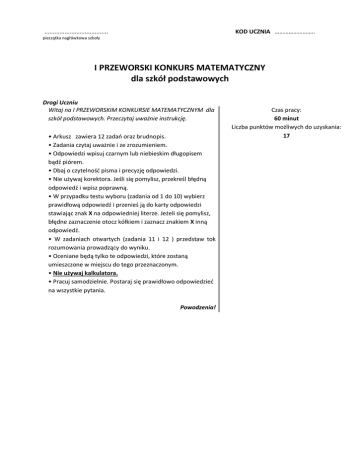 ...................................... KOD UCZNIA …………………….. pieczątka nagłówkowa szkoły I PRZEWORSKI KONKURS MATEMATYCZNY dla szkół podstawowych Drogi Uczniu Witaj na I PRZEWORSKIM KONKURSIE MATEMATYCZNYM dla szkół podstawowych. Przeczytaj uważnie instrukcję. • Arkusz zawiera 12 zadań oraz brudnopis. • Zadania czytaj uważnie i ze zrozumieniem. • Odpowiedzi wpisuj czarnym lub niebieskim długopisem bądź piórem. • Dbaj o czytelność pisma i precyzję odpowiedzi. • Nie używaj korektora. Jeśli się pomylisz, przekreśl błędną odpowiedź i wpisz poprawną. • W przypadku testu wyboru (zadania od 1 do 10) wybierz prawidłową odpowiedź i przenieś ją do karty odpowiedzi stawiając znak X na odpowiedniej literze. Jeżeli się pomylisz, błędne zaznaczenie otocz kółkiem i zaznacz znakiem X inną odpowiedź. • W zadaniach otwartych (zadania 11 i 12 ) przedstaw tok rozumowania prowadzący do wyniku. • Oceniane będą tylko te odpowiedzi, które zostaną umieszczone w miejscu do tego przeznaczonym. • Nie używaj kalkulatora. • Pracuj samodzielnie. Postaraj się prawidłowo odpowiedzieć na wszystkie pytania. Powodzenia! Czas pracy: 60 minut Liczba punktów możliwych do uzyskania: 17 Zad.1. Drugiego lipca 2014 roku o godzinie 1715 Monika pojechała do babci. W domu nie było jej 76 godzin. Zaznacz właściwą datę i godzinę powrotu Moniki do domu? A. 8 lipca godz.21:15 B. 5 lipca godz.17:15 C. 8 lipca godz.17:15 D. 5 lipca godz. 21:15 Zad.2. Na planie w skali 1 : 2500 pewien teren ma kształt prostokąta o wymiarach 64 mm długości i 48 mm szerokości. Jaka jest w rzeczywistości powierzchnia tego terenu? A.192 m2 B. 1,92 ha C. 1,92 km2 D. 192 ha Zad.3. Średnia ocen Kasi z matematyki wynosiła do dzisiaj 3,75. Dzisiaj Kasia otrzymała piątą ocenę i jej średnia ocen spadła do 3,6. Jaką ocenę otrzymała Kasia? A. 2 B. 3 C. 4 D. 5 Zad.4. Pewną ilość cukierków zamierzano podzielić między 15 dzieci. Ponieważ troje dzieci nie przyszło na spotkanie, na każde z pozostałych dzieci przypadły o 2 cukierki więcej. Ile było cukierków do podzielenia? A.60 B. 100 C. 120 D. 150 Zad.5. Z kwadratowych kawałków materiału o wymiarach 10 cm x 10 cm krawcowa uszyła prostokątną narzutę o długości 1,5 m i szerokości 1 m. W każdym miejscu, w którym stykają się ze sobą cztery kwadraciki przyszyła ozdobny koralik. Ile koralików zużyła do ozdobienia narzuty? A.150 sztuk B. 140 sztuk C. 126 sztuk D. 104 sztuki Zad.6. Do półtoralitrowego dzbanka nalano wody nie napełniając go całkowicie. W ciągu dnia zużyto połowę zawartości dzbanka. Wieczorem uzupełniono dzbanek do pełna nalewając 0,8 litra wody. Jaka była początkowa zawartość dzbanka? A.1,5 l B. 0,7 l C. 0,75 l D. 1,4 l Zad.7. Ile jest zdań fałszywych wśród poniższych: - Każdy kwadrat jest rombem. - Istnieją trapezy, które są równoległobokami. - Każdy prostokąt jest trapezem. - Każdy równoległobok jest prostokątem. - Każdy czworokąt, który ma dwie pary boków równej długości jest równoległobokiem. A. jedno B. dwa C. trzy D. cztery Zad.8. Jaskółka może pokonać 25 m na sekundę. Pociąg towarowy jedzie z prędkością 72 km / h. Czy jaskółka może prześcignąć pociąg towarowy, jeśli będzie frunęła wzdłuż trasy kolejowej? Zaznacz właściwą odpowiedź. A. Tak, gdyż 25 m/s > 72 km/h. B. Nie, gdyż 25 m/s < 72 km/h. C. Trudno to stwierdzić, gdyż 25 m/s = 72 km/h. D. Tak, gdyż 72 km/ godz. = 12 m/s. Zad.9. Czternastoletni Jacek będzie za rok 3 razy starszy od swojej siostry. Za ile lat będzie od niej dwa razy starszy? A.za 5 lat B. za 6 lat C. za 7 lat D. za 14 lat Zad.10. Łączna waga psa, kota i chomika wynosi 35 kg. Kot waży 4 razy mniej niż pies, a chomik o 1kg mniej od kota. Ile waży kot? A.5 kg B. 7 kg C. 6 kg D. nie można obliczyć 3 Zad.11. Suma dwóch liczb jest równa 6004 . Jeżeli jeden ze składników podzielimy przez dwa, to nowa suma będzie równa 488,5. Oblicz, jakie to liczby. 3 Zad.12. Bolek, Lolek i Tola zbierali pieniądze na zakup namiotu. Bolek dał potrzebnej kwoty, Lolek 5 2 dał 5 pozostałej części. Tola dołożyła brakujące 30 zł. Po zebraniu pieniędzy okazało się, że cena 1 namiotu jest o 5 niższa. Ile pieniędzy zostało każdemu z dzieci?