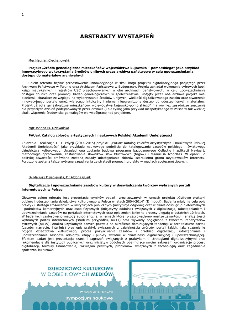 1 ABSTRAKTY WYSTĄPIEŃ Mgr Hadrian Ciechanowski Projekt „Źródła genealogiczne mieszkańców województwa kujawsko – pomorskiego” jako przykład innowacyjnego wykorzystania środków unijnych przez archiwa państwowe w celu upowszechniania dostępu do materiałów archiwalnych Celem referatu będzie przedstawienie innowacyjnego w skali kraju projektu digitalizacyjnego podjętego przez Archiwum Państwowe w Toruniu oraz Archiwum Państwowe w Bydgoszczy. Projekt zakładał wykonanie cyfrowych kopii ksiąg metrykalnych i rejestrów USC przechowywanych w obu archiwach państwowych, w celu upowszechnienia dostępu do nich oraz promocji badań genealogicznych w społeczeństwie. Podjęty przez oba archiwa projekt miał pionierski charakter ze względu na wykorzystanie środków unijnych, wielkość digitalizowanego zasobu oraz stworzenie innowacyjnego portalu umożliwiającego intuicyjny i niemal nieograniczony dostęp do udostępnionych materiałów. Projekt „Źródła genealogiczne mieszkańców województwa kujawsko-pomorskiego” ma również zasadnicze znaczenie dla przyszłych działań podejmowanych przez archiwa (i nie tylko) jako przykład niespotykanego w Polsce w tak wielkiej skali, włączenia środowiska genealogów we współpracę nad projektem. Mgr Joanna M. Dziewulska PAUart Katalog zbiorów artystycznych i naukowych Polskiej Akademii Umiejętności Założenia i realizacja I i II edycji (2014-2015) projektu „PAUart Katalog zbiorów artystycznych i naukowych Polskiej Akademii Umiejętności” jako przykładu naukowego podejścia do katalogowania zasobów polskiego i światowego dziedzictwa kulturowego. Uwzględniona zostanie budowa programu bazodanowego Collectio i aplikacji Navigart, metodologia opracowania, zastosowanie słowników słów kluczowych (tagów) i tezaurusa Iconclass. W oparciu o politykę otwartości omówione zostaną zasady udostępniania zbiorów szerokiemu gronu użytkowników Internetu. Poruszone zostaną także wybrane zagadnienia ze strategii promocji projektu w mediach społecznościowych. Dr Mariusz Dzięglewski, Dr Aldona Guzik Digitalizacja i upowszechnianie zasobów kultury w doświadczeniu twórców wybranych portali internetowych w Polsce Głównym celem referatu jest prezentacja wyników badań zrealizowanych w ramach projektu „Cyfrowe praktyki odbioru i udostępniania dziedzictwa kulturowego w Polsce w latach 2004-2014” (II moduł). Badania miały na celu opis praktyk i strategii stosowanych w instytucjach publicznych (instytucje odgórne) oraz w działalności grup nieformalnych i podmiotów komercyjnych oraz osób fizycznych (inicjatywy oddolne) związanych z digitalizacją, udostępnianiem i upowszechniania zasobów na portalach internetowych oraz opis zmian jakim te procesy ulegają w ostatnich 10 latach. W badaniach zastosowano metodę etnograficzną, w ramach której przeprowadzono analizę zawartości i analizę treści wybranych portali internetowych (studium przypadku, n=11) oraz wywiady pogłębione z twórcami repozytoriów cyfrowych (n=19). Analiza uzyskanych danych pozwala na określenie dominujących tendencji w architekturze portali (zasoby, narracje, interfejs) oraz opis praktyk związanych z działalnością twórców portali takich, jak: rozumienie pojęcia dziedzictwa kulturowego, proces pozyskiwania zasobów i przebieg digitalizacji, udostępnianie i upowszechnianie zasobów, odbiorcy, etapy i punkty zwrotne w działalności digitalizacyjnej i upowszechniającej. Efektem badań jest prezentacja szans i zagrożeń związanych z praktykami i strategiami digitalizacyjnymi oraz rekomendacje dla instytucji publicznych oraz inicjatyw oddolnych obejmujące swoim zakresem organizację procesu digitalizacji, formuły finansowania, rozwiązań prawnych, problemów związanych z technologią oraz zagadnienia społeczno-kulturowe. 2 Dr Bartosz Drzewiecki Digitalizacja i udostępnianie zdigitalizowanych materiałów archiwalnych w polskich archiwach państwowych – ewolucja polityki i przepisów prawa Polskie archiwa państwowe są, z zasady, instytucjami konserwatywnymi, sceptycznie nastawionymi do nowych trendów i nowinek technologicznych. Wziąwszy pod uwagę charakter, unikatowość przechowywanego zasobu oraz tradycyjny, powiązany z nauką, model użytkownika, taka postawa wydawała się uzasadniona. Do dziś jednak podstawowym, na co dzień udostępnianym, rodzajem kopii najcenniejszych materiałów archiwalnych jest mikrofilm, co w znaczący sposób zawęża krąg użytkowników. Polityka archiwów w zakresie digitalizacji archiwaliów zmieniła się jednak kilka lat temu, na skutek odgórnych zaleceń. Opracowana przez Naczelną Dyrekcję Archiwów Państwowych Strategia archiwów państwowych na lata 2010–2020 wymogła na omawianych instytucjach otwarcie się na potrzeby informacyjne obywateli, odejście od modelu instytucji stricte naukowej, hermetycznej i archaicznej, a jedn ą z dróg ku tej przemianie ma być udostępnianie zasobu on-line. Wytyczne te przewidują stały, coroczny przyrost skanów, ale również wskazują charakter (proweniencję) digitalizowanych w pierwszej kolejności zespołów archiwalnych, wychodząc w ten sposób naprzeciw najliczniejszym grupom użytkowników. Dr Izabela Franckiewicz-Olczak Nowe media w muzeum. Multimedialne i interaktywne sposoby organizowania wystaw W muzealnictwie na całym świecie coraz częściej sięga się po nowe media. Trend ten coraz bardziej widoczny jest również w Polsce. Powstają centra naukowo - edukacyjne, których funkcjonowanie zasadza się na nowych multimedialnych i interaktywnych technologiach, produkowane są wystawy multimedialne, wykorzystuje się rozwiązania technologiczne do uatrakcyjnienia odbioru tradycyjnych wystaw (audioprzewodniki, kody QR). Referat jest próbą zdiagnozowana na ile nowe technologie w muzealnictwie są formą demokratyzowania kultury i dedystancjacji (obie kategorie używam w znaczeniu nadanym przez Mannheima), 