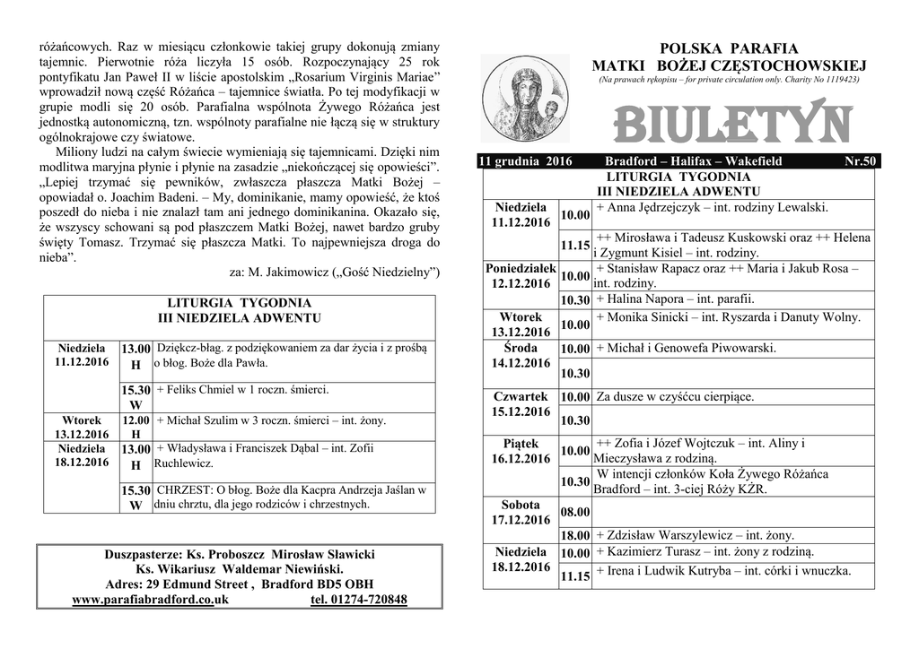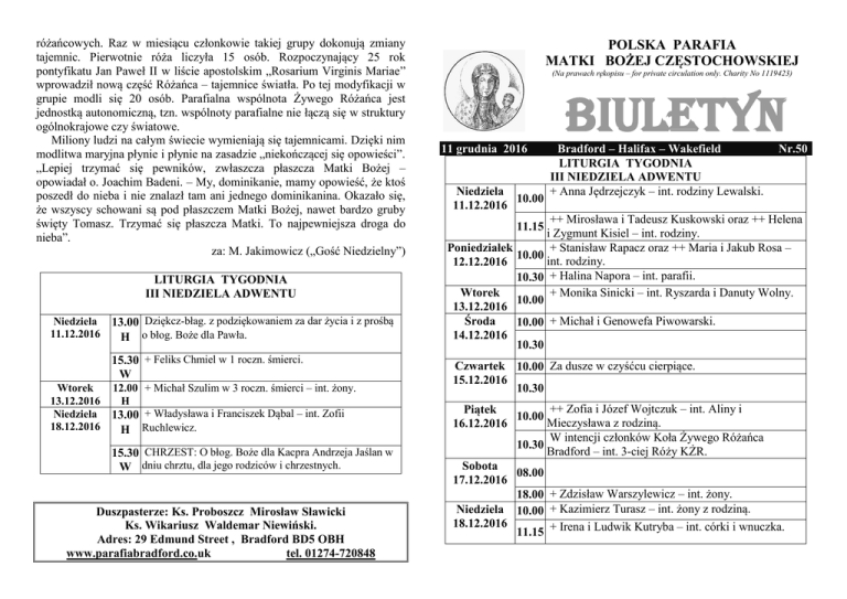 różańcowych. Raz w miesiącu członkowie takiej grupy dokonują zmiany tajemnic. Pierwotnie róża liczyła 15 osób. Rozpoczynający 25 rok pontyfikatu Jan Paweł II w liście apostolskim „Rosarium Virginis Mariae” wprowadził nową część Różańca – tajemnice światła. Po tej modyfikacji w grupie modli się 20 osób. Parafialna wspólnota Żywego Różańca jest jednostką autonomiczną, tzn. wspólnoty parafialne nie łączą się w struktury ogólnokrajowe czy światowe. Miliony ludzi na całym świecie wymieniają się tajemnicami. Dzięki nim modlitwa maryjna płynie i płynie na zasadzie „niekończącej się opowieści”. „Lepiej trzymać się pewników, zwłaszcza płaszcza Matki Bożej – opowiadał o. Joachim Badeni. – My, dominikanie, mamy opowieść, że ktoś poszedł do nieba i nie znalazł tam ani jednego dominikanina. Okazało się, że wszyscy schowani są pod płaszczem Matki Bożej, nawet bardzo gruby święty Tomasz. Trzymać się płaszcza Matki. To najpewniejsza droga do nieba”. za: M. Jakimowicz („Gość Niedzielny”) LITURGIA TYGODNIA III NIEDZIELA ADWENTU Niedziela 11.12.2016 13.00 Dziękcz-błag. z podziękowaniem za dar życia i z prośbą H o błog. Boże dla Pawła. 15.30 + Feliks Chmiel w 1 roczn. śmierci. W Wtorek 13.12.2016 Niedziela 18.12.2016 12.00 + Michał Szulim w 3 roczn. śmierci – int. żony. H 13.00 + Władysława i Franciszek Dąbal – int. Zofii H Ruchlewicz. 15.30 CHRZEST: O błog. Boże dla Kacpra Andrzeja Jaślan w W dniu chrztu, dla jego rodziców i chrzestnych. Duszpasterze: Ks. Proboszcz Mirosław Sławicki Ks. Wikariusz Waldemar Niewiński. Adres: 29 Edmund Street , Bradford BD5 OBH www.parafiabradford.co.uk tel. 01274-720848 POLSKA PARAFIA MATKI BOŻEJ CZĘSTOCHOWSKIEJ (Na prawach rękopisu – for private circulation only. Charity No 1119423) BIULETYN 11 grudnia 2016 Niedziela 10.00 11.12.2016 Bradford – Halifax – Wakefield LITURGIA TYGODNIA III NIEDZIELA ADWENTU + Anna Jędrzejczyk – int. rodziny Lewalski. Nr.50 ++ Mirosława i Tadeusz Kuskowski oraz ++ Helena i Zygmunt Kisiel – int. rodziny. + Stanisław Rapacz oraz ++ Maria i Jakub Rosa – Poniedziałek 10.00 int. rodziny. 12.12.2016 10.30 + Halina Napora – int. parafii. + Monika Sinicki – int. Ryszarda i Danuty Wolny. Wtorek 10.00 13.12.2016 Środa 10.00 + Michał i Genowefa Piwowarski. 14.12.2016 10.30 11.15 Czwartek 10.00 Za dusze w czyśćcu cierpiące. 15.12.2016 10.30 ++ Zofia i Józef Wojtczuk – int. Aliny i Piątek 10.00 Mieczysława z rodziną. 16.12.2016 W intencji członków Koła Żywego Różańca 10.30 Bradford – int. 3-ciej Róży KŻR. Sobota 08.00 17.12.2016 18.00 + Zdzisław Warszylewicz – int. żony. Niedziela 10.00 + Kazimierz Turasz – int. żony z rodziną. 18.12.2016 11.15 + Irena i Ludwik Kutryba – int. córki i wnuczka. Lektorzy – Sobota 17.12.2016 g.18.00 – M. Pietruszka Niedziela 18.12.2016 g. 10.00 - J. Nowicki g.11.15 - J. Kszczot Dyżur przedstawiciela Rady Parafialnej w Sali św. Brata Alberta: sobota i niedziela 17-18.12.2016 – M.M. Pierścińscy OFIARY Taca dla parafii – 04.12.2016 - £384.35 (Bradford), - £124.75 (Wakefield), - £158.67 (Halifax). Inne (sklepik, prasa, świece itp.) - £229.26. Zbiórka na Sanktuarium M.B. Ostrobramskiej w Skarżysku-Kamiennej: Bradford, Halifax, Wakefield - £1135. ***** Jeżeli ktoś z Parafian pragnie złożyć ofiarę czekiem na dowolny cel parafialny, prosimy go wypisać na: P.C.M. BRADFORD lub P.C.M. HALIFAX. Wszystkim ofiarodawcom składamy serdeczne podziękowanie za złożone ofiary na nasze cele parafialne. Bóg zapłać. OGŁOSZENIA DUSZPASTERSKIE W piątek 16 grudnia o godz.12.00 środowe i piątkowe Day Centre zaprasza na Obiad Bożonarodzeniowy. Bilety w cenie £8 do nabycia w Day Centre i w Sali św. Brata Alberta. W przyszłą niedzielę po Mszach św. nasi harcerze będą sprzedawać dekoracje świąteczne. Dochód przeznaczony będzie na cele drużyny harcerskiej z Bradford. W Sali św. Brata Alberta, w każdą sobotę i niedzielę można nabyć tygodnik katolicki „Gość Niedzielny” w cenie £1.50. Do nabycia także kartki świąteczne oraz opłatki wigilijne. Spowiedź przedświąteczna w Bradford będzie miała miejsce w piątek 23 grudnia od godz.18.00. Wszystkich naszych Rodaków, którzy chcą należeć do naszej Parafii serdecznie zapraszamy i prosimy o wypełnienie przygotowanego formularza i zwrócenie go duszpasterzowi. Klub „Jagoda” zaprasza w piątki w godz.17.00-24.00, w soboty w godz.12.00-24.00 oraz w niedziele w godz.10.0016.00. W niedziele serwowane są obiady (menu na tablicy ogłoszeń). Dodatkowo w każdy dzień do godz.16.00 można nabyć ciasta dzwoniąc dzwonkiem do drzwi klubu. ***** O ŻYWYM RÓŻAŃCU (cz.2) W tym tygodniu w liturgii: - we wtorek wspomnienie św. Łucji, dz. i męcz., - w środę wspomnienie św. Jana od Krzyża, prezb. i dK. Dziś w naszym kościele przeprowadzana jest zbiórka na pomoc Kościołowi na Wschodzie (druga taca). „Bóg Zapłać!” za złożone ofiary. W środę oraz piątek zapraszamy naszych starszych parafian do POK na spotkania w ramach Day Centre w godz.10.0014.00. W 1831 roku, po pięciu latach od rozpoczęcia różanej rewolucji, zdumiona Paulina pisała: „Liczba odmawiających dziesiątkę Różańca rośnie z niewiarygodną szybkością we Włoszech, Szwajcarii, Belgii, Anglii i w wielu regionach Ameryki. Wszędzie, gdzie tworzą się piętnastki, można zauważyć nie notowane wcześniej umacnianie się dobra. Stopniowo stajemy się zjednoczeni w modlitwie ze wszystkimi ludźmi świata”. Paulina Jaricot zmarła 150 lat temu. Jej proces beatyfikacyjny ruszył w 1939 r., a heroiczność cnót ogłoszona została przez Jana XXIII w 1963 roku. W chwili śmierci Pauliny w jej rodzinnej Francji w Żywym Różańcu modliło się już 2,5 mln ludzi. Jak to działa? Uczestnicy Żywego Różańca należą do grupy zwanej różą. Każda osoba z róży przez miesiąc od