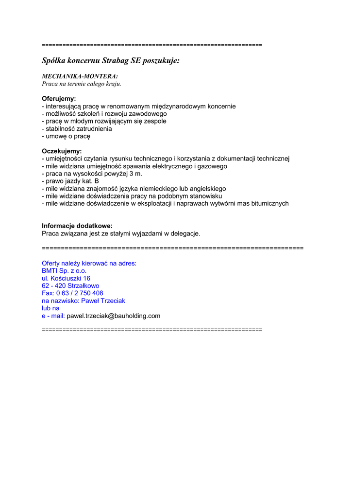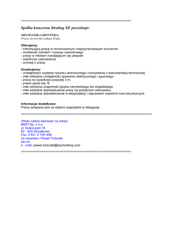 ================================================================ Spółka koncernu Strabag SE poszukuje: MECHANIKA-MONTERA: Praca na terenie całego kraju. Oferujemy: - interesującą pracę w renomowanym międzynarodowym koncernie - możliwość szkoleń i rozwoju zawodowego - pracę w młodym rozwijającym się zespole - stabilność zatrudnienia - umowę o pracę Oczekujemy: - umiejętności czytania rysunku technicznego i korzystania z dokumentacji technicznej - mile widziana umiejętność spawania elektrycznego i gazowego - praca na wysokości powyżej 3 m. - prawo jazdy kat. B - mile widziana znajomość języka niemieckiego lub angielskiego - mile widziane doświadczenia pracy na podobnym stanowisku - mile widziane doświadczenie w eksploatacji i naprawach wytwórni mas bitumicznych Informacje dodatkowe: Praca związana jest ze stałymi wyjazdami w delegacje. ===================================================================== Oferty należy kierować na adres: BMTI Sp. z o.o. ul. Kościuszki 16 62 - 420 Strzałkowo Fax: 0 63 / 2 750 408 na nazwisko: Paweł Trzeciak lub na e - mail: [email protected] ================================================================