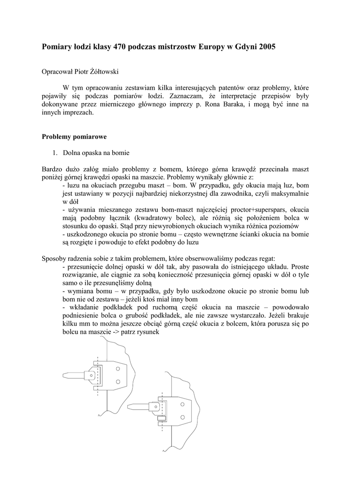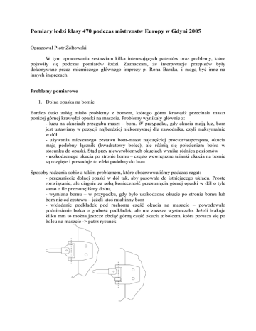 Pomiary łodzi klasy 470 podczas mistrzostw Europy w Gdyni 2005 Opracował Piotr Żółtowski W tym opracowaniu zestawiam kilka interesujących patentów oraz problemy, które pojawiły się podczas pomiarów łodzi. Zaznaczam, że interpretacje przepisów były dokonywane przez mierniczego głównego imprezy p. Rona Baraka, i mogą być inne na innych imprezach. Problemy pomiarowe 1. Dolna opaska na bomie Bardzo dużo załóg miało problemy z bomem, którego górna krawędź przecinała maszt poniżej górnej krawędzi opaski na maszcie. Problemy wynikały głównie z: - luzu na okuciach przegubu maszt – bom. W przypadku, gdy okucia mają luz, bom jest ustawiany w pozycji najbardziej niekorzystnej dla zawodnika, czyli maksymalnie w dół - używania mieszanego zestawu bom-maszt najczęściej proctor+superspars, okucia mają podobny łącznik (kwadratowy bolec), ale różnią się położeniem bolca w stosunku do opaski. Stąd przy niewyrobionych okuciach wynika różnica poziomów - uszkodzonego okucia po stronie bomu – często wewnętrzne ścianki okucia na bomie są rozgięte i powoduje to efekt podobny do luzu Sposoby radzenia sobie z takim problemem, które obserwowaliśmy podczas regat: - przesunięcie dolnej opaski w dół tak, aby pasowała do istniejącego układu. Proste rozwiązanie, ale ciągnie za sobą konieczność przesunięcia górnej opaski w dół o tyle samo o ile przesunęliśmy dolną - wymiana bomu – w przypadku, gdy było uszkodzone okucie po stronie bomu lub bom nie od zestawu – jeżeli ktoś miał inny bom - wkładanie podkładek pod ruchomą część okucia na maszcie – powodowało podniesienie bolca o grubość podkładek, ale nie zawsze wystarczało. Jeżeli brakuje kilku mm to można jeszcze obciąć górną część okucia z bolcem, która porusza się po bolcu na maszcie -> patrz rysunek 2. Okucie spinakerbomu położone zbyt wysoko lub wygięte do góry Problem ten pojawił się na kilku nowych masztach proctora i supersparsa. Zawodnicy radzili sobie z nim za pomocą następujących metod: - szlifowanie pięty masztu – efektywnie zmniejsza wymiar położenia, ponieważ przesuwa punkt bazowy. Niestety przesuwa to efektywnie wszystkie opaski na maszcie w dół - wyginanie ukucia w dół. Jeżeli część okucia przy maszcie była ok., to odgięcie ucha w dół pomagało zmieścić je w wymiarze. - przesunięcie okucia –drastyczny ruch, ale konieczny w przypadku dwóch masztów. Nowe dziury, nowe nity… Interesujący jest fakt, że większość spotkanych okuć miała wymiar 32 mm mierzony od krawędzi masztu. Maksymalny wymiar okucia to 40mm. 3. Waga masztu Praktycznie wszystkie załogi, które miały ważone maszty miały z tym problem. Do wagi masztu można dołożyć mocowanie kompasu, jeżeli jest zamontowane na stałe (nity) oraz bloczki obciągacza bomu i miecza. Trzeba wtedy jednak uważać na środek ciężkości masztu (nie był badany), bo dodawane okucia dokładamy w okolicach pięty masztu. 4. Szerokość głowicy foka Kilka nowych foków miało problemy z szerokością głowicy – max 30mm, wymiary tych żagli w granicach 33-36mm. Problem rozwiązywano poprzez ucięcie gorącym nożem kawałka tylnej krawędzi żagla. Robiąc to należy jednak uważać, aby nie spowodować wypukłości liku tylnego – praktycznie oznacza to, że należy wyprowadzić cięcie od górnej listwy na foku. 5. Wspornik fału spinakera. Duża ilość załóg używała wsporników fału spinakera. O ile model wykonany z laminatu zazwyczaj nie miał kłopotów, to prawie wszystkie wsporniki spawane z drutów miały kłopot z projekcją od masztu. W przypadku wykraczania 2-3mm ponad wymiar wystarczało szlifowanie elementów drucianych, w przypadku większych uchybień, konieczne było rozginanie, przestawianie okucia na nowe dziury lub zdjęcie go. 6. Waga jachtu Bardzo duża ilość załóg miała wagę jachtu w granicach 122-123 kg . Pomimo, że łodzi nie były do końca suche (ze względu na warunki atmosferyczne) to ilość wody w łodzi z lekko mokrymi pasami i linami to około 0.5-0.7kg. Oznacza to że większość załóg pływała te regaty na łodziach z nadwaga około 1.5kg. 7. Waga steru Część jachtów miała płetwy sterowe zbyt lekkie, o kilkadziesiąt gram. Problem korygowano przyklejając ołowiany odważnik. 8. Kipy cunninghama foka Przepis mówi, że dozwolona jest jedna kipa cunninghama foka. Zawodnicy często używali knag z kipą z przodu oraz okucie z góry knagi, zapobiegającym wypadaniu liny. To okucie liczone jest także jako kipa, więc taka knaga ma dwie kipy. Skutkowało to koniecznością usunięcia jednej kipy. Innym problemem było stosowanie talii zbudowanych z uszek i węzłów na linie. Takie tworzenie okucia z liny jest zabronione. Dobrym sposobem na zwiększenie liczby przełożeń są dodatkowe przełożenia liny przez ucho rogu halsowego foka oraz szeklę na sztagowniku. Efekt jest praktycznie ten sam. 9. Kształt miecza Problem kształtu miecza wynika z pomyłki w nowych przepisach klasowych. Zmieniono sposób mierzenia punktu na tylnej krawędzi miecza i ktoś zrobił błąd przeliczając wymiary. Na regatach dopuszczano miecze zbudowane według starej (czyli nieaktualnej ) wersji przepisów. Jeżeli ktoś planuje budować nowy miecz powinien wyjaśnić sprawę w stowarzyszeniu międzynarodowym. Interesujące rozwiązania W tej części wypisałem ciekawe patenty, które zaobserwowałem podczas kontroli sprzętu w trakcie regat. 1. Płetwy Generalnie prawie wszystkie płetwy u dobrych zawodników budowane były w ramach tolerancji pomiarowych jako wąskie i długie. Jest to zgodne z zasadami hydrodynamiki, że tego typu płetwa jest sprawniejsza. Grubości płetw zbliżone były do minimalnych. Jedna załoga miała interesujące rozwiązanie na płetwie sterowej – szlif na krawędzi natarcia w odległości około 2cm od niej, który mógł być wykonany w celu turbulizacji warstwy przyściennej i przyklejeni