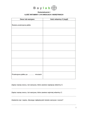 Doświadczenie I ILOŚĆ WITAMINY C W OWOCACH I WARZYWACH Owoc lub warzywo Ilość witaminy C [mg/l] Świeżo przekrojone jabłko Przekrojone jabłko po …......... minutach Zapisz nazwę owocu, lub warzywa, które zawiera najwięcej witaminy C: ............................................................................................................................................... Zapisz nazwę owocu, lub warzywa, które zawiera najmniej witaminy C: ............................................................................................................................................... Zastanów się i napisz, dlaczego najlepiej jeść świeże warzywa i owoce? ............................................................................................................................................... 1 Doświadczenie II JAK RÓŻNE SUBSTANCJE DZIAŁAJĄ NA SKORUPKI JAJA? Probówka nr 1 (uzupełnij schemat doświadczenia) ................. …................. Obserwacje: Po wlaniu wody do skorupek jaja ............................................................................................................................................. ............................................................................................................................................. Probówka nr 2 (uzupełnij schemat doświadczenia) ..................... .................... Obserwacje: Po wlaniu roztworu witaminy C do skorupek jaja ............................................................................................................................................. ............................................................................................................................................. 2 Probówka nr 3 (uzupełnij schemat doświadczenia) .................. ..................... Obserwacje: Po wlaniu octu do skorupek jaja ............................................................................................................................................... ........................................................................................................................................... Wnioski: ............................................................................................................................................... ............................................................................................................................................... ............................................................................................................................................... ............................................................................................................................................... ..................................................................................................................................... ............................................................................................................................................. 3 Doświadczenie III JAK WYWAR Z CZERWONEJ KAPUSTY BARWI SIĘ W RÓŻNYCH SUBSTANCJACH? Obserwacje: Nazwa substancji Barwa roztworu woda roztwór sody soda oczyszczonej ocet roztwór witaminy C Uzupełnij zdania: Wywar z czerwonej kapusty pozostaje ............................................................ w wodzie. Wywar z czerwonej kapusty zmienia barwę z ................................................................ na …................................................................ w roztworze sody oczyszczonej. Wywar z czerwonej kapusty zmienia barwę z ................................................................ na …................................................................. w occie. Wywar z czerwonej kapusty zmienia barwę z ................................................................ na …................................................................. w roztworze witaminy C. Wnioski: Witamina C i ocet są ........................................................................... Soda oczyszczona jest ......................................................................... 4 Doświadczenie IV JAKIE WŁAŚCIWOŚCI MA WITAMINA C? Probówka nr 1, 2 i 3 ................ …............. Obserwacje: Po wlaniu jodyny do kleiku skrobiowego mieszanina zabarwiła się na ........................................................................................................................................... Probówka nr 1 Obserwacje: Po wlaniu wody do probówki nr 1 ........................................................................................................................................... Probówka nr 2 Obserwacje: Po wlaniu octu do probówki nr 2 ........................................................................................................................................... Probówka nr 3 Obserwacje: Po wlaniu roztworu witaminy C do probówki nr ........................................................................................................................................... Wnioski: ............................................................................................................................................... ....................................................................................................................................... 5